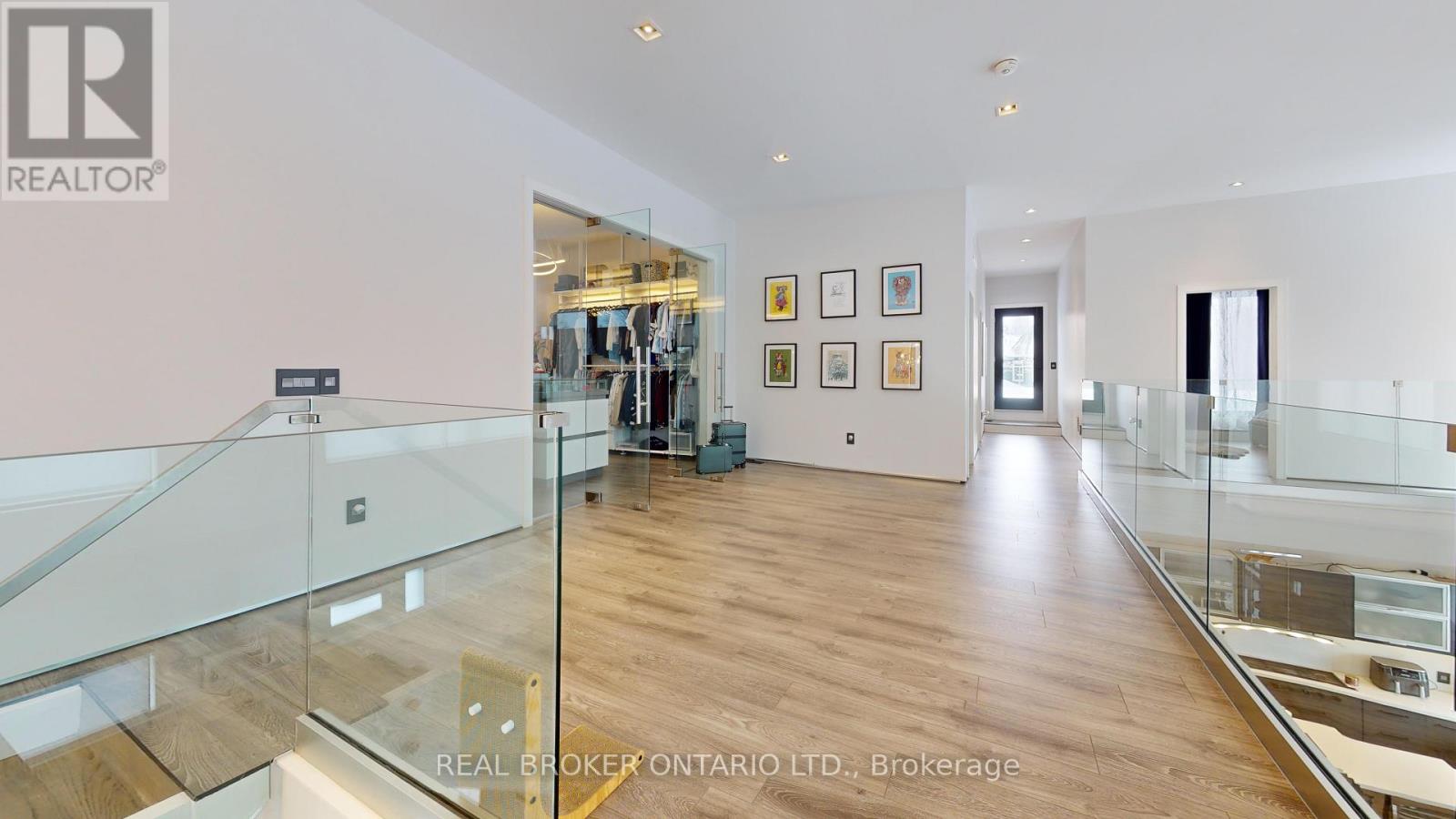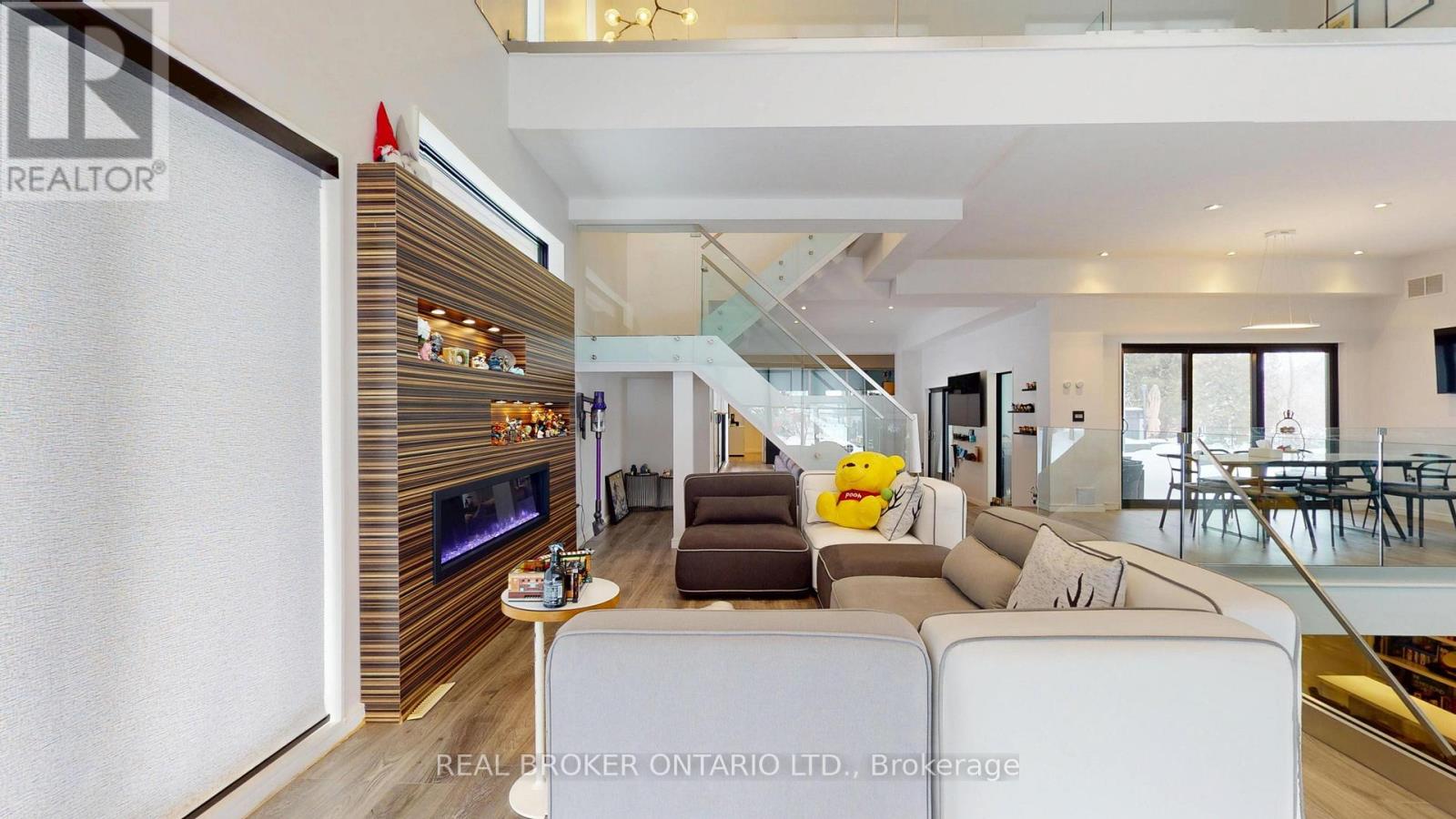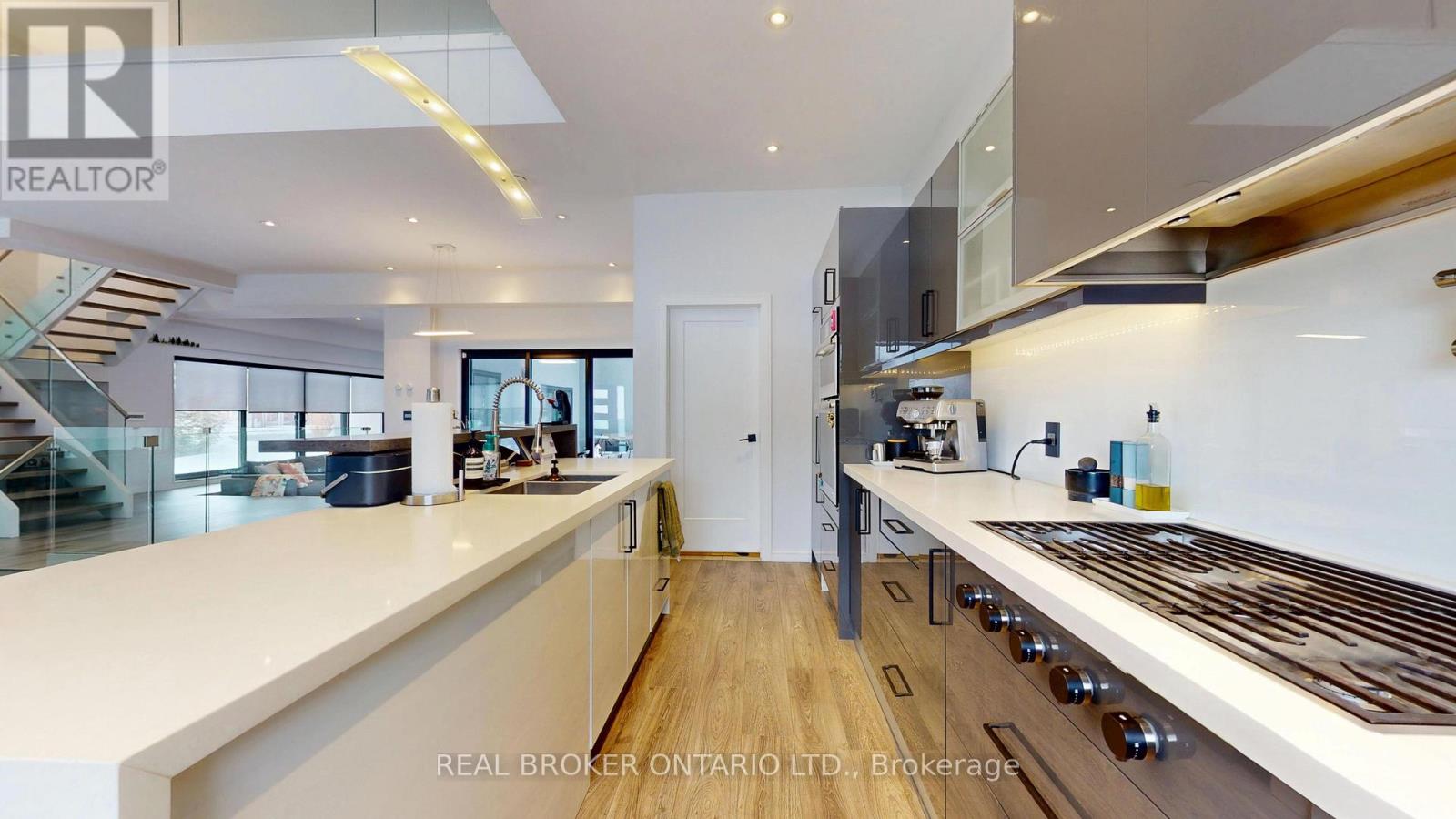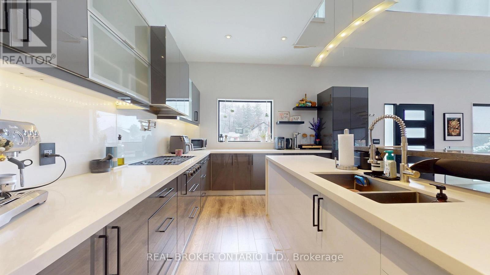 Bold architecture meets refined functionality in this striking custom-built contemporary residence. Designed across three finished levels, this home seamlessly blends luxury, productivity, and entertainment. The main level makes an unforgettable first impression with soaring open-to above ceilings, a floating wood staircase with glass railings, and expansive walls of glass that flood the space with natural light. The chef inspired kitchen is a true showpiece, featuring a dramatic dual-waterfall island, built-in wall ovens, gas cooktop with pot filler, wine storage, beverage fridge, and sleek high-gloss cabinetry - all flowing effortlessly into the dining and living areas anchored by a designer feature wall. A dedicated professional office wing offers glass-partitioned workspace and conference flexibility - ideal for entrepreneurs, creatives, consultants and more. Upstairs, a dramatic gallery overlooks the main level and leads to a boutique-style primary retreat complete with a glass-enclosed walk-in closet and spa-inspired ensuite featuring a freestanding soaker tub, frameless glass shower, floating vanity, and modern tile finishes.Spacious secondary bedrooms and beautifully appointed bathrooms complete the upper level. The fully finished lower level elevates the home's entertainment factor with a custom built-in bar, open recreation space, designer lighting, and architectural sight-lines connecting all levels. A full bathroom adds flexibility for guests. This is more than a home - it is a modern lifestyle property built for those who value design, functionality, and elevated living. The property is being sold in as-is, where-is condition, with no representations or warranties of any kind by the seller. (id:4555)