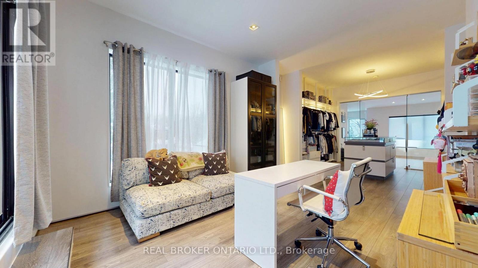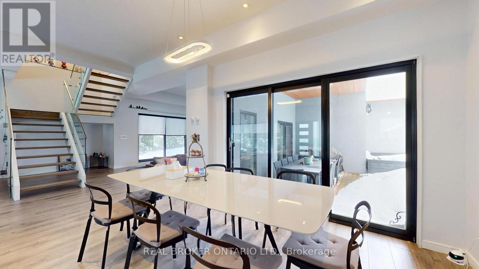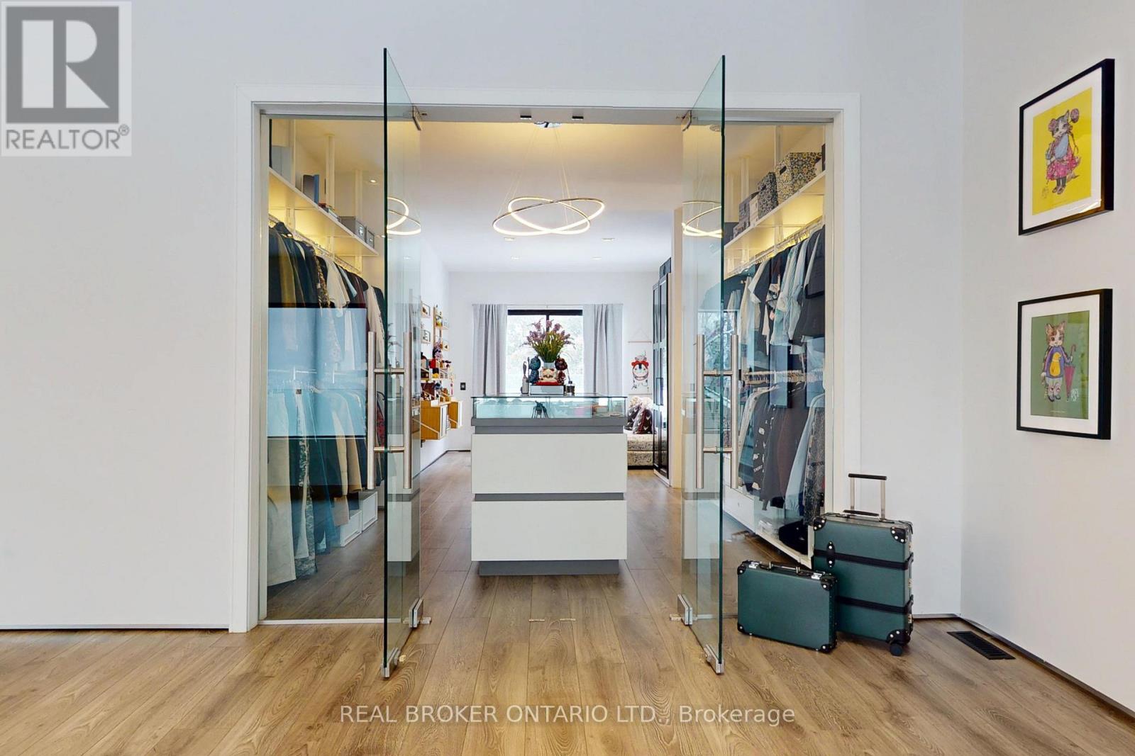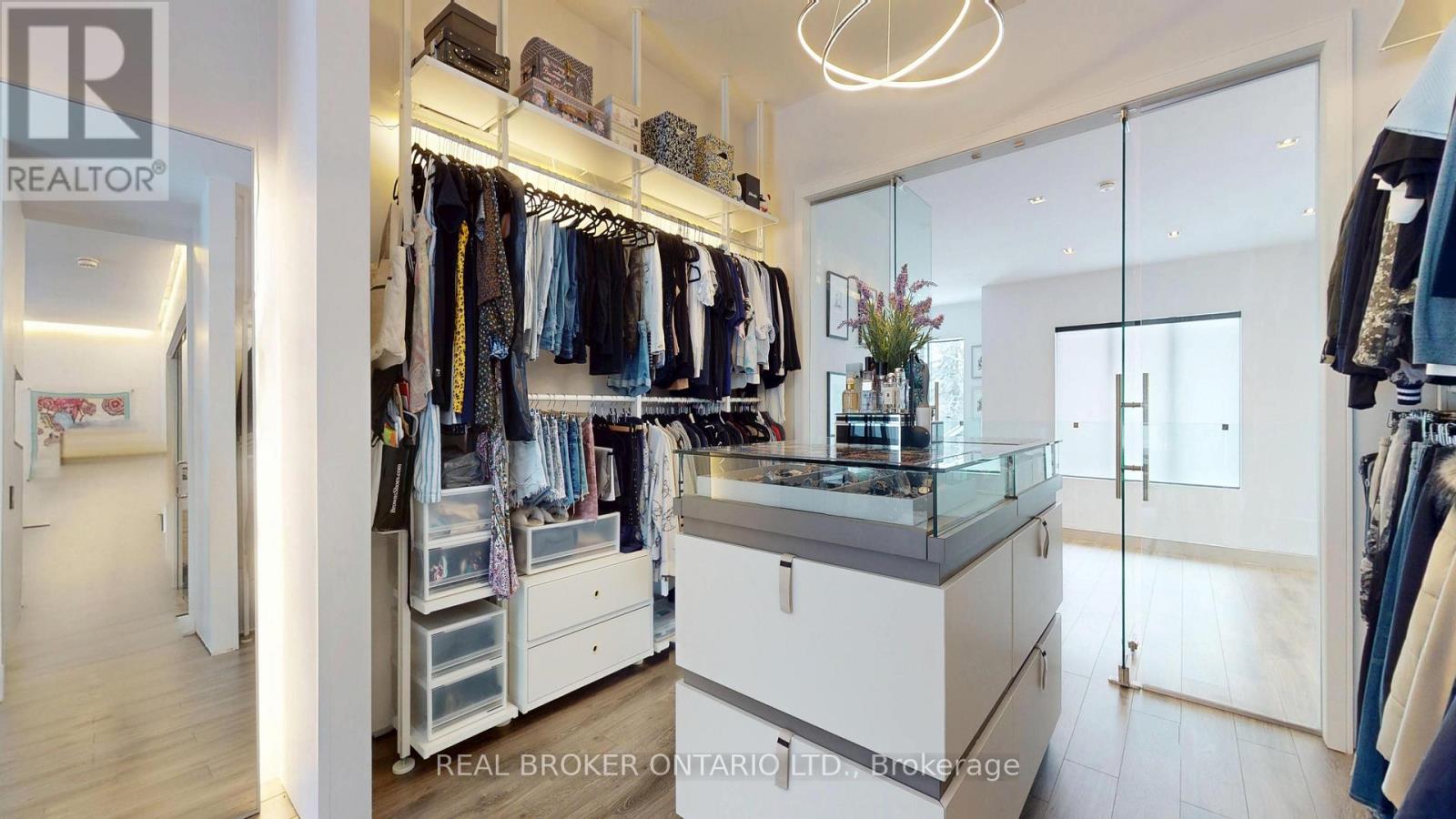 Bold architecture meets refined functionality in this striking custom-built contemporary residence. Designed across three finished levels, this home seamlessly blends luxury, productivity, and entertainment. The main level makes an unforgettable first impression with soaring open-to above ceilings, a floating wood staircase with glass railings, and expansive walls of glass that flood the space with natural light. The chef inspired kitchen is a true showpiece, featuring a dramatic dual-waterfall island, built-in wall ovens, gas cooktop with pot filler, wine storage, beverage fridge, and sleek high-gloss cabinetry - all flowing effortlessly into the dining and living areas anchored by a designer feature wall. A dedicated professional office wing offers glass-partitioned workspace and conference flexibility - ideal for entrepreneurs, creatives, consultants and more. Upstairs, a dramatic gallery overlooks the main level and leads to a boutique-style primary retreat complete with a glass-enclosed walk-in closet and spa-inspired ensuite featuring a freestanding soaker tub, frameless glass shower, floating vanity, and modern tile finishes.Spacious secondary bedrooms and beautifully appointed bathrooms complete the upper level. The fully finished lower level elevates the home's entertainment factor with a custom built-in bar, open recreation space, designer lighting, and architectural sight-lines connecting all levels. A full bathroom adds flexibility for guests. This is more than a home - it is a modern lifestyle property built for those who value design, functionality, and elevated living. The property is being sold in as-is, where-is condition, with no representations or warranties of any kind by the seller. (id:4555)