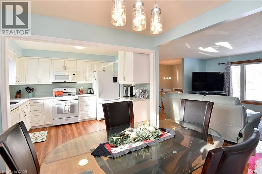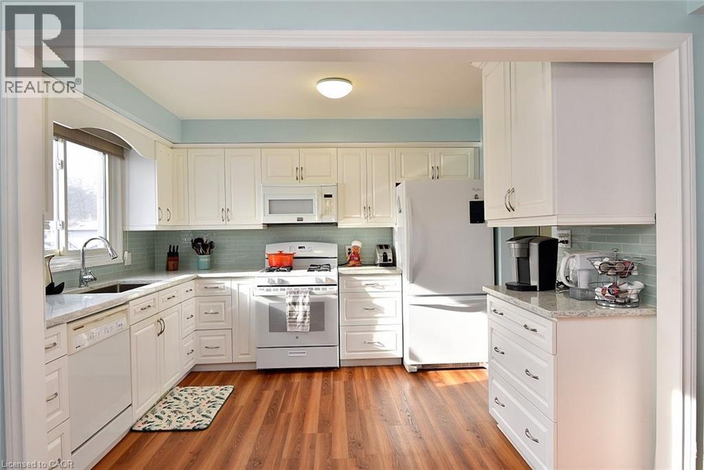 Situated in a desirable neighbourhood, this beautifully maintained raised bungalow is perfect for a family or empty nesters! The oversized 27' x 27' detached garage has an approximately 2 yr old roof, hydro and is insulated for year round use and offers a perfect spot for hobbies or a workshop. Bright and airy throughout and decorated in neutral colours, this home is in move in condition! The main floor offers a large living room and dining room with hardwood floors, a modern kitchen with an abundance of cupboards, quartz countertops, updated appliances and luxury vinyl flooring, 3 spacious bedrooms and a modern 4 piece bath. The lower level offers a cozy family room featuring a gas fireplace for chilly winter nights. A 4th bedroom, a recently completed 3 piece bathroom with a shower, laundry room and storage room complete the lower level. The fully fenced rear yard offers a patio with a gazebo, gas bbq hookup and pretty gardens. The stamped concrete driveway provides parking for 4 vehicles. Just minutes from shopping, schools, seniors' centre, parks, waterfront and restaurants! (id:4555)