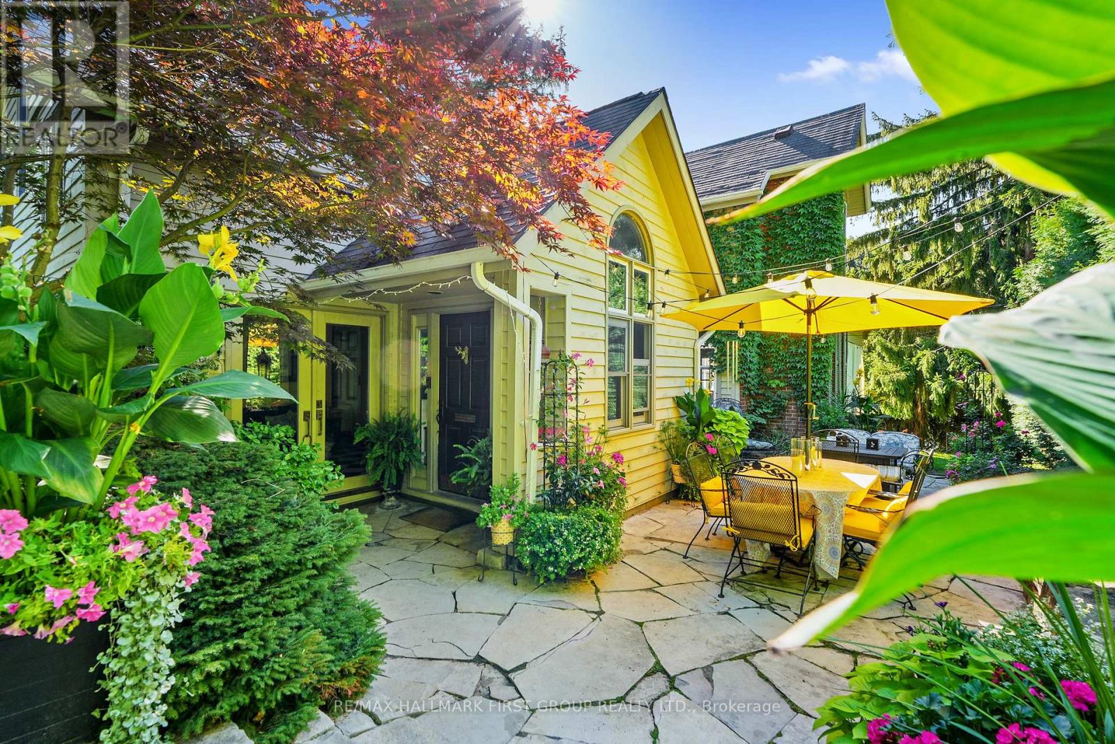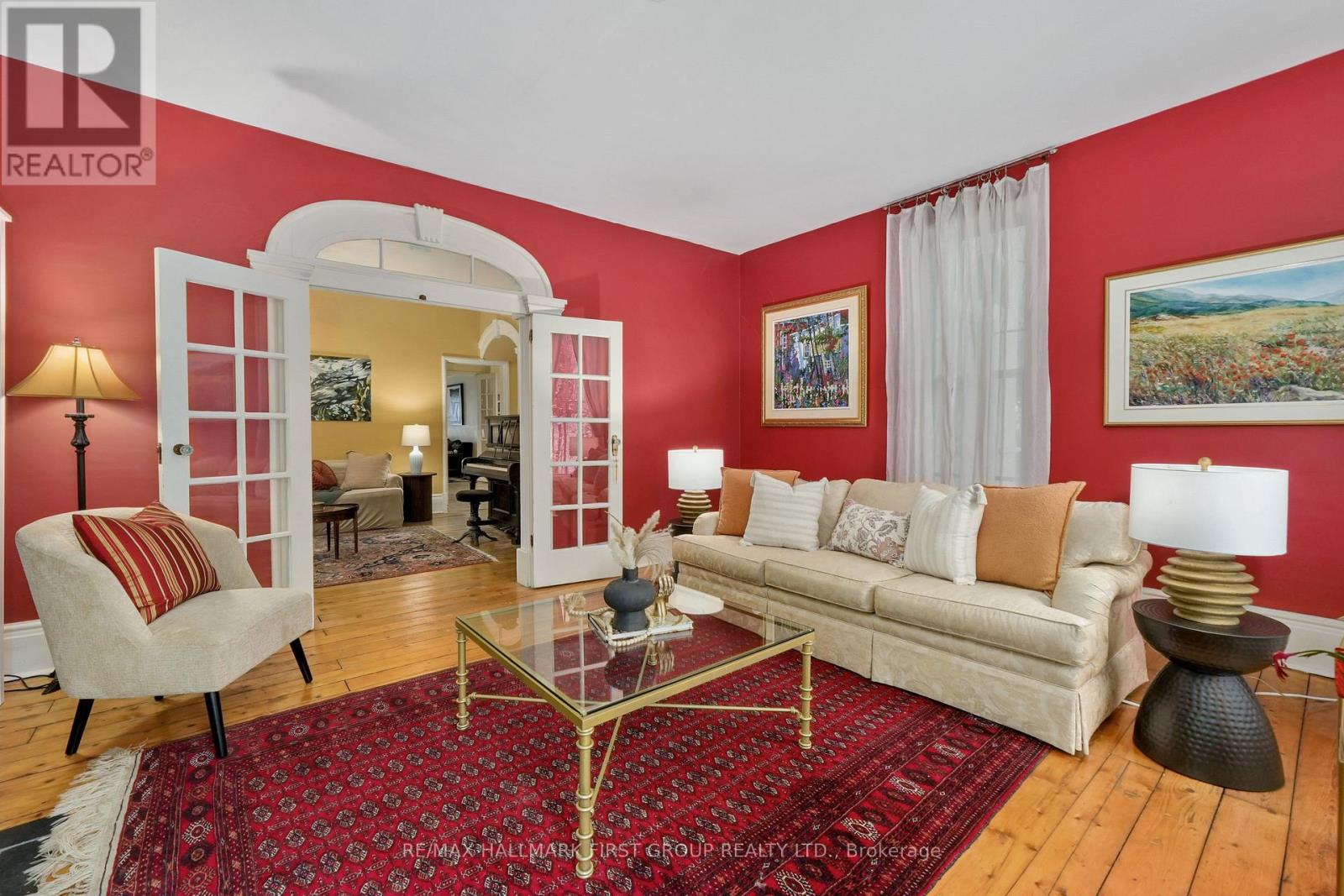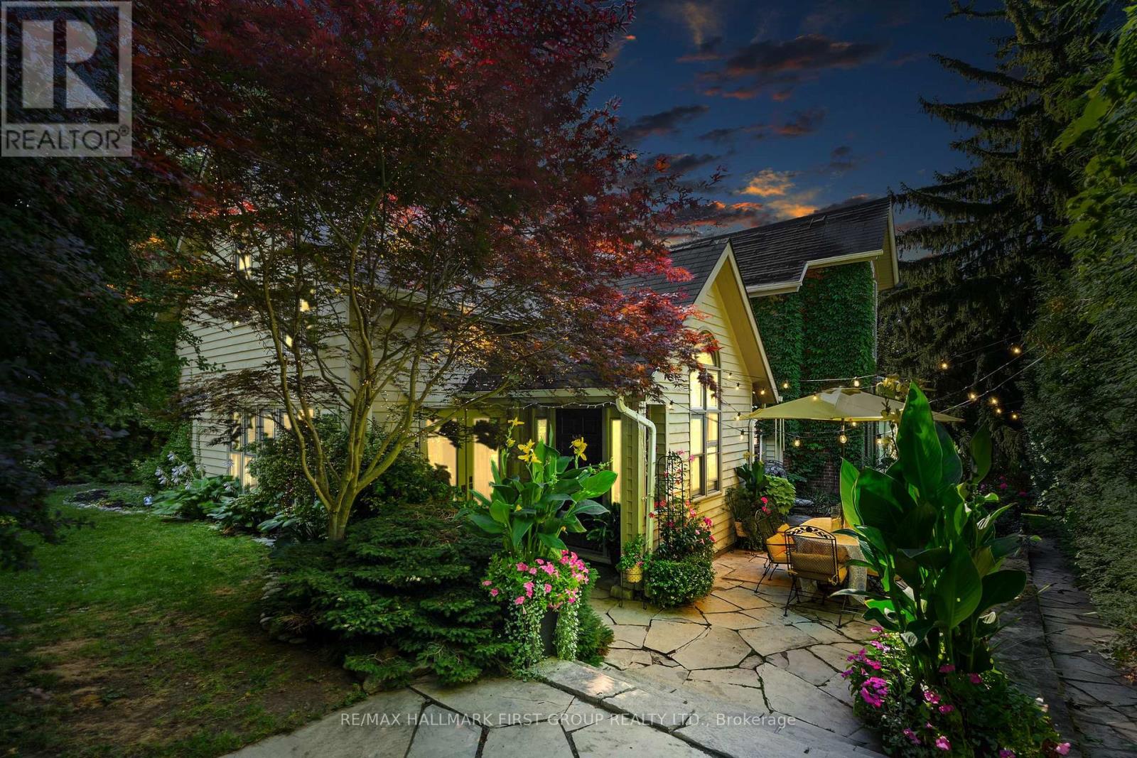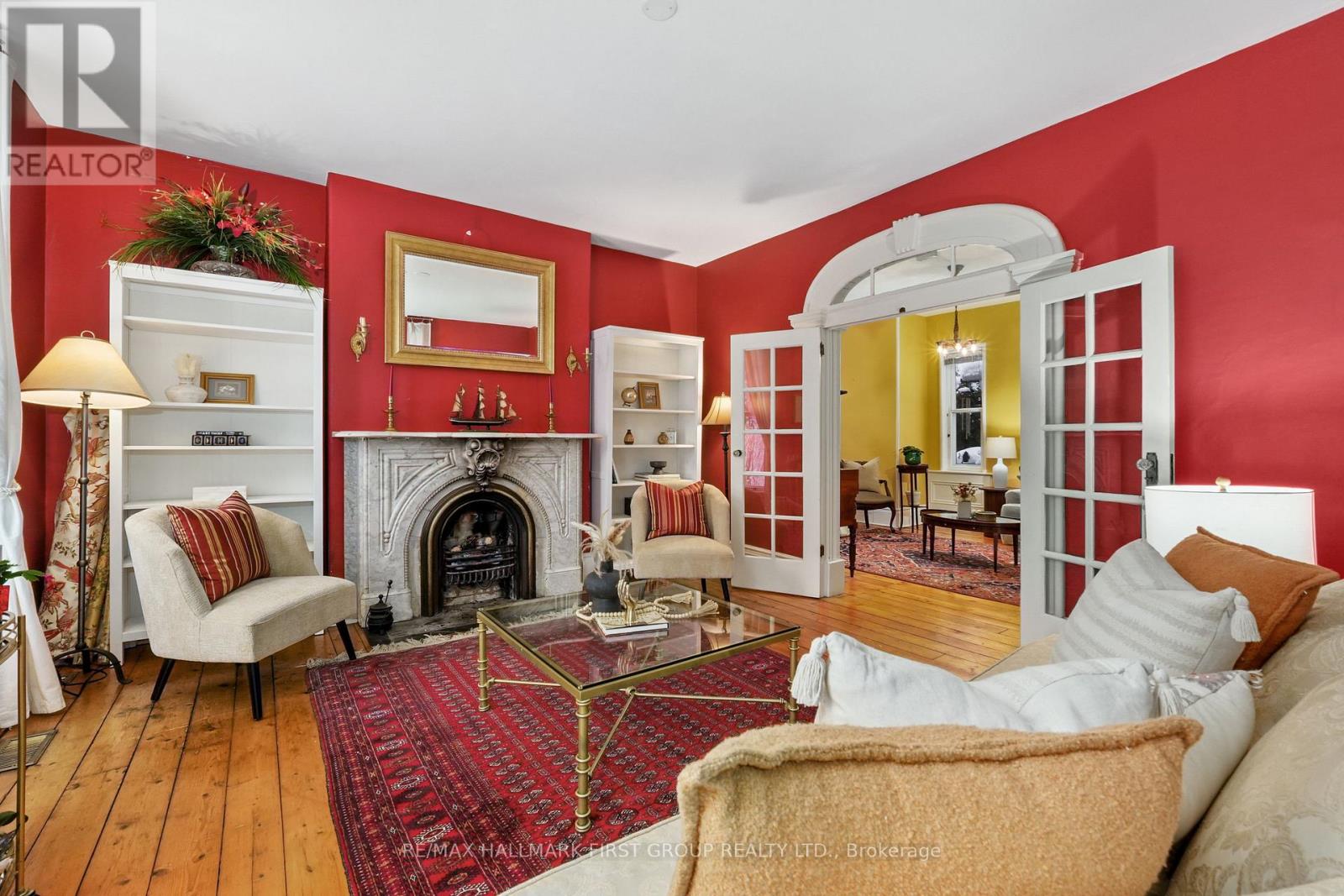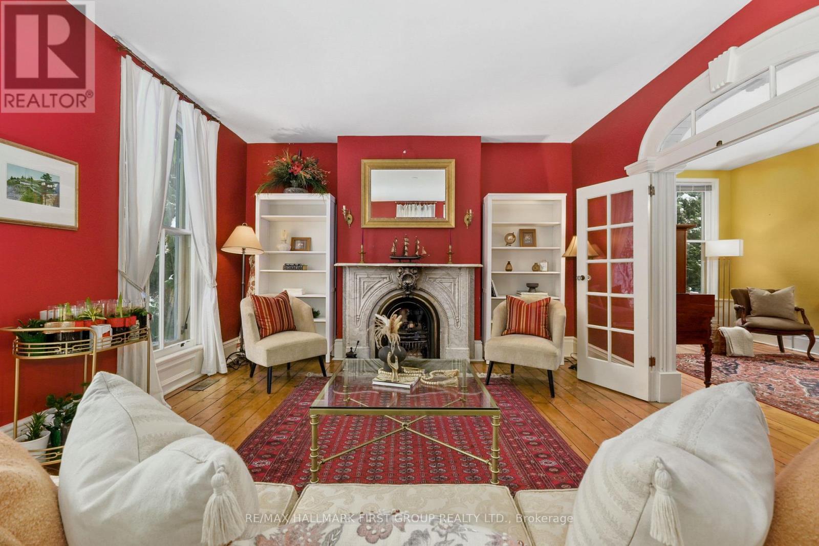 Located on a picturesque, tree-lined street in the heart of Downtown Port Hope, this distinctive 1850s-built home blends timeless character with thoughtful modern updates. Guests are greeted by a beautiful open foyer featuring a striking floor design and large windows that flood the space with natural light. The living room impresses with a sun-soaked layout, a wall of windows, and a soaring two-storey ceiling. In contrast, the spacious dining room showcases detailed trim and high baseboards, an ideal setting for holiday gatherings and year-round entertaining. The kitchen is designed for hosting, offering generous cabinet and counter space, a coffee bar area, gas stove, breakfast bar, and a prep counter accented by pendant lighting. A character-filled sitting or music room connects to the family room through an elegant arched doorway. The cozy family room features an ornate decorative fireplace and floor-to-ceiling windows overlooking the gardens. A main-floor three-piece bathroom and a convenient laundry room complete this level. Upstairs, the primary bedroom offers a spacious retreat with dual closets featuring French doors, high ceilings, and recessed lighting. The bathroom includes skylights, a glass shower enclosure, and a relaxing soaker tub. Two well-appointed bedrooms and an open loft ideal for a home office or guest space complete the upper floor plan. Outside, a private secret garden oasis awaits. Enjoy a covered porch perfect for morning coffee in any weather, a back patio ideal for alfresco dining, and lush mature trees and gardens, all complemented by a charming bunkie. Situated moments from Trinity College School local amenities, downtown shops, and restaurants, this home offers the exceptional lifestyle Port Hope is known for, with easy access to the 401. (id:4555)