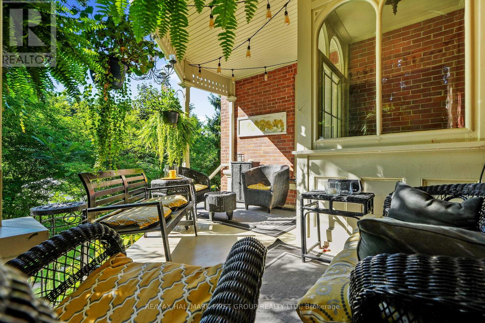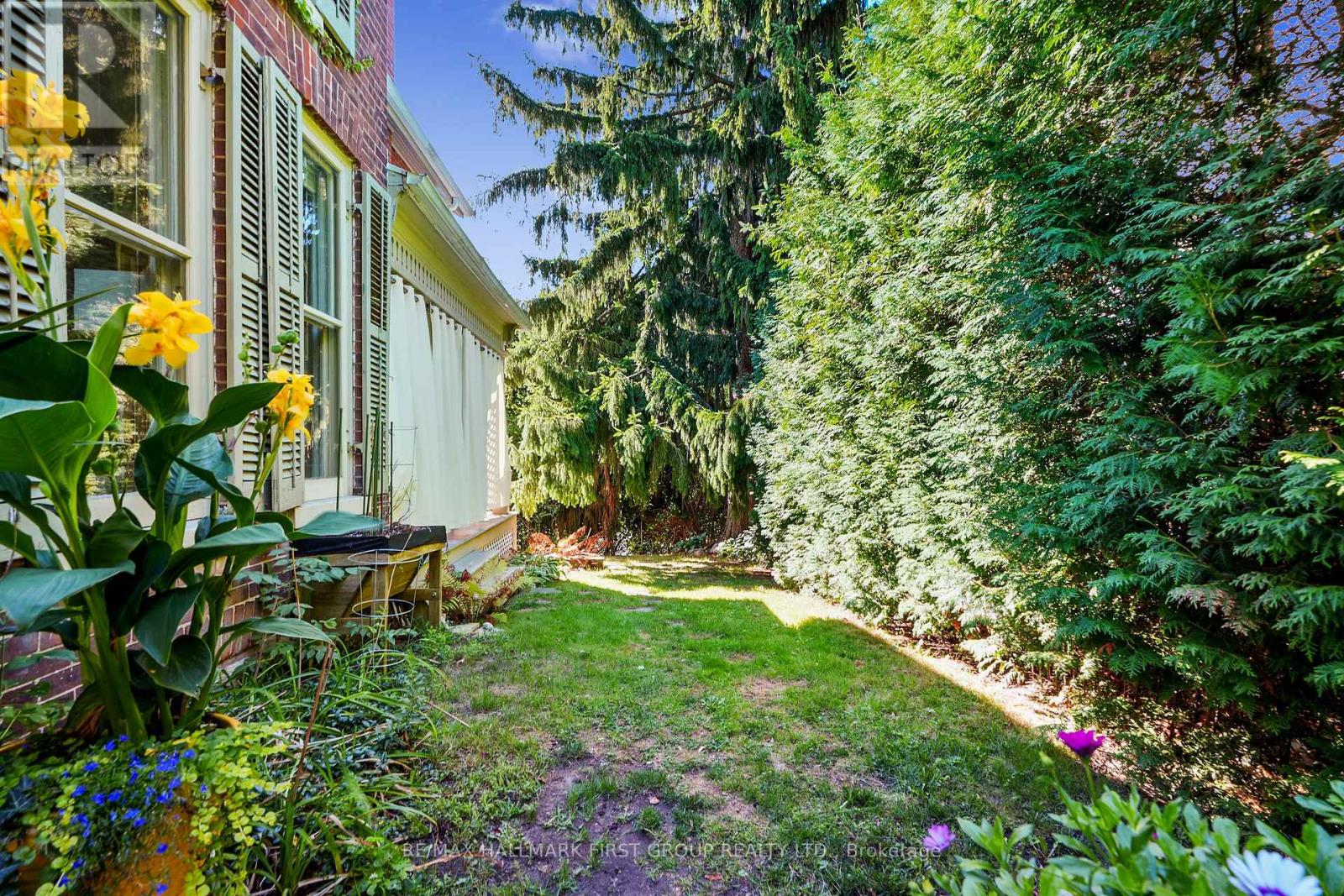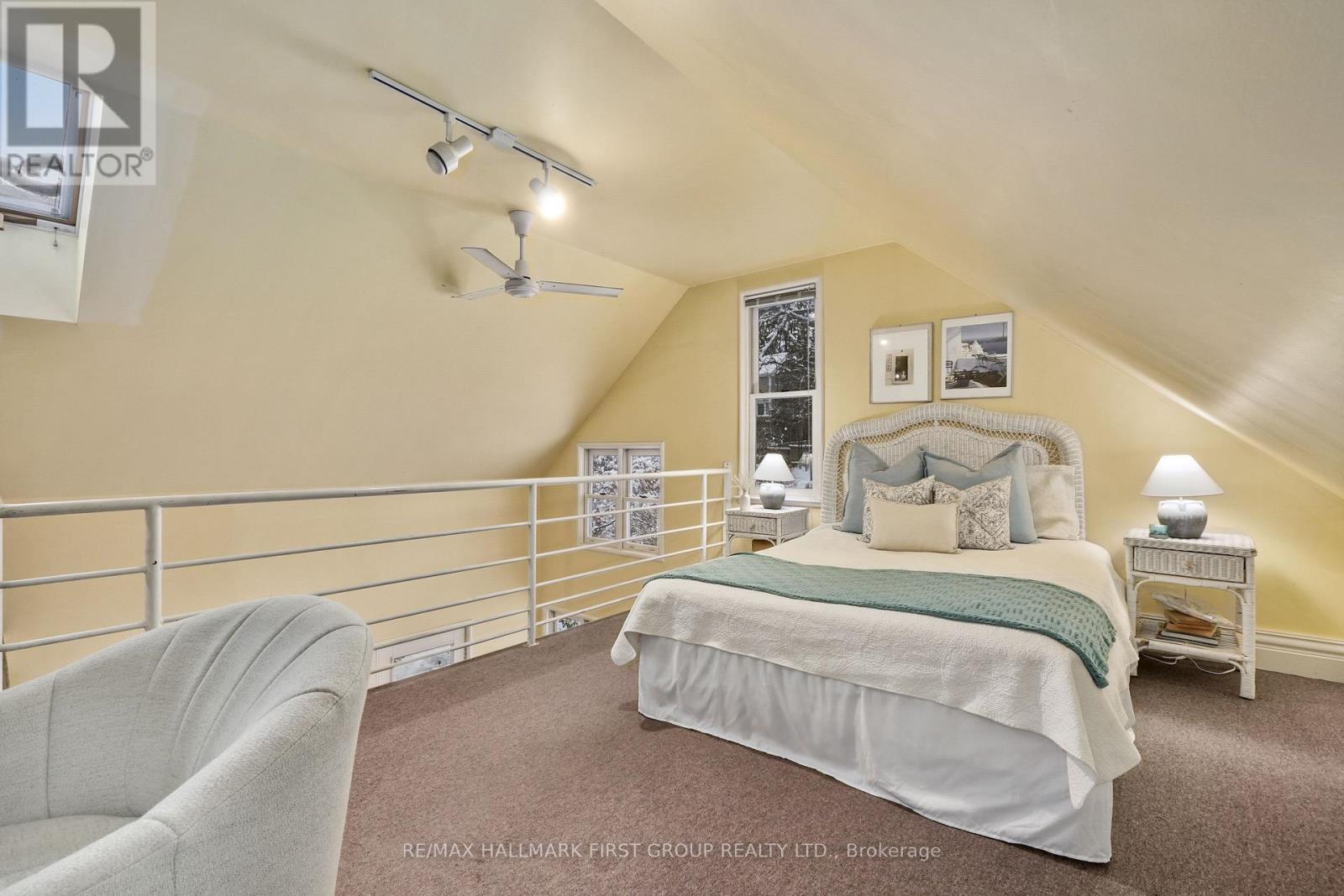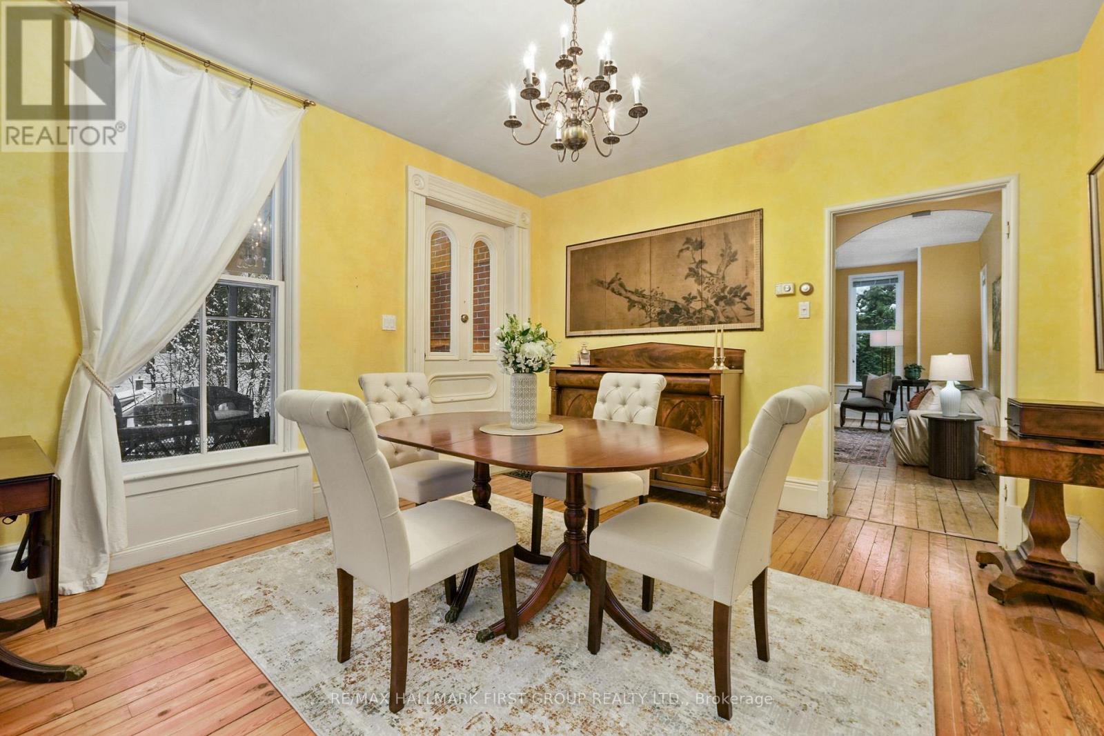 Located on a picturesque, tree-lined street in the heart of Downtown Port Hope, this distinctive 1850s-built home blends timeless character with thoughtful modern updates. Guests are greeted by a beautiful open foyer featuring a striking floor design and large windows that flood the space with natural light. The living room impresses with a sun-soaked layout, a wall of windows, and a soaring two-storey ceiling. In contrast, the spacious dining room showcases detailed trim and high baseboards, an ideal setting for holiday gatherings and year-round entertaining. The kitchen is designed for hosting, offering generous cabinet and counter space, a coffee bar area, gas stove, breakfast bar, and a prep counter accented by pendant lighting. A character-filled sitting or music room connects to the family room through an elegant arched doorway. The cozy family room features an ornate decorative fireplace and floor-to-ceiling windows overlooking the gardens. A main-floor three-piece bathroom and a convenient laundry room complete this level. Upstairs, the primary bedroom offers a spacious retreat with dual closets featuring French doors, high ceilings, and recessed lighting. The bathroom includes skylights, a glass shower enclosure, and a relaxing soaker tub. Two well-appointed bedrooms and an open loft ideal for a home office or guest space complete the upper floor plan. Outside, a private secret garden oasis awaits. Enjoy a covered porch perfect for morning coffee in any weather, a back patio ideal for alfresco dining, and lush mature trees and gardens, all complemented by a charming bunkie. Situated moments from Trinity College School local amenities, downtown shops, and restaurants, this home offers the exceptional lifestyle Port Hope is known for, with easy access to the 401. (id:4555)