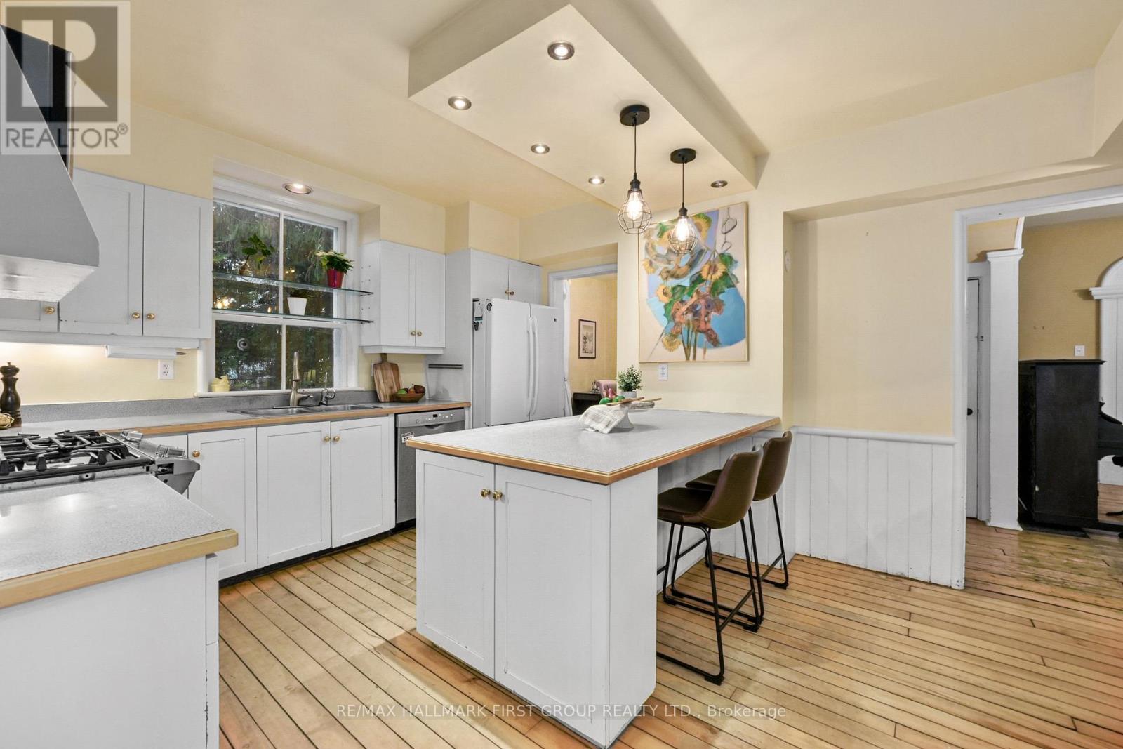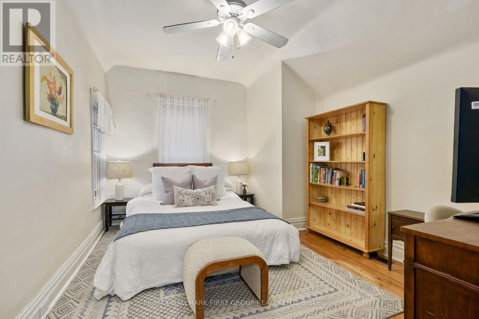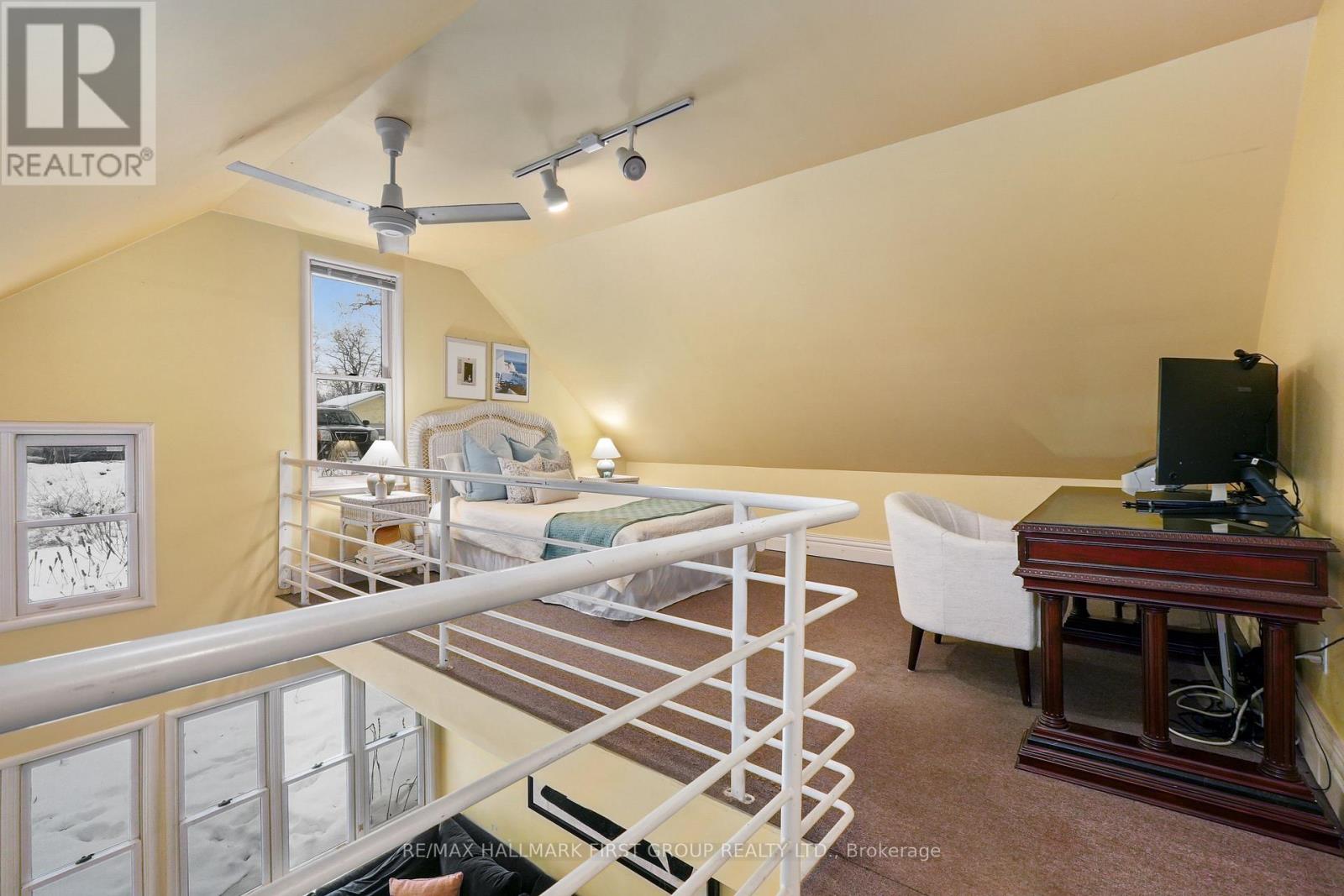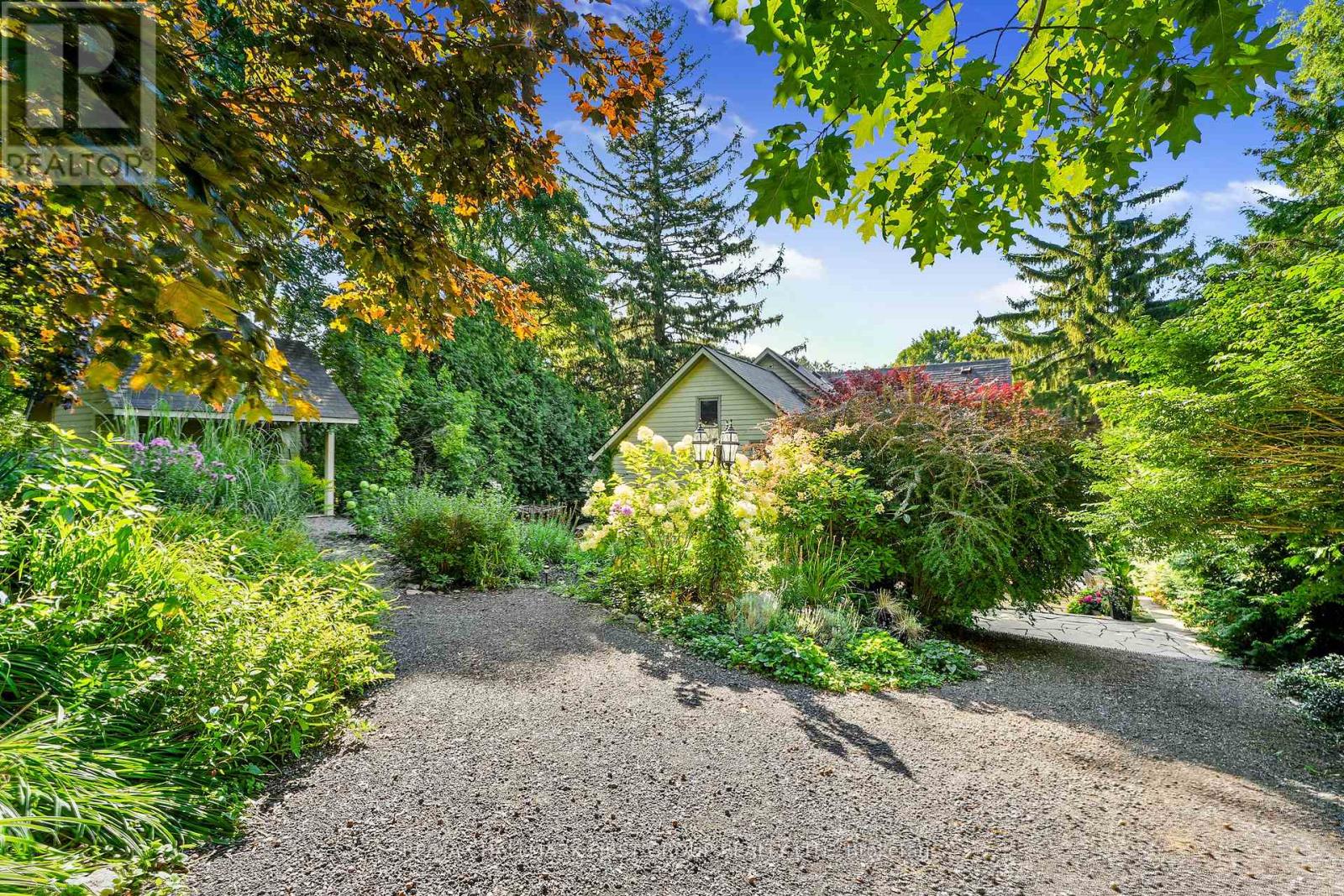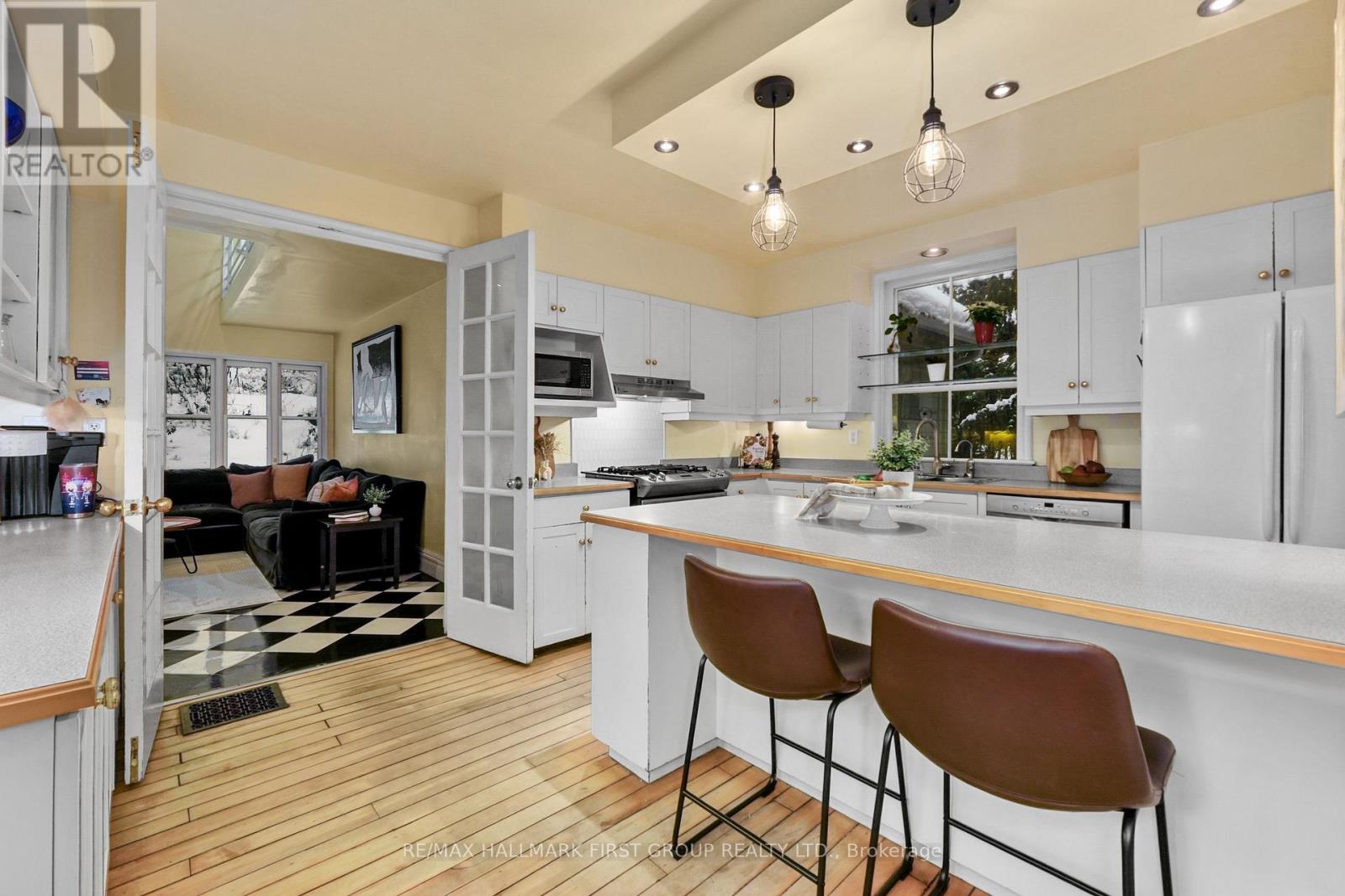 Located on a picturesque, tree-lined street in the heart of Downtown Port Hope, this distinctive 1850s-built home blends timeless character with thoughtful modern updates. Guests are greeted by a beautiful open foyer featuring a striking floor design and large windows that flood the space with natural light. The living room impresses with a sun-soaked layout, a wall of windows, and a soaring two-storey ceiling. In contrast, the spacious dining room showcases detailed trim and high baseboards, an ideal setting for holiday gatherings and year-round entertaining. The kitchen is designed for hosting, offering generous cabinet and counter space, a coffee bar area, gas stove, breakfast bar, and a prep counter accented by pendant lighting. A character-filled sitting or music room connects to the family room through an elegant arched doorway. The cozy family room features an ornate decorative fireplace and floor-to-ceiling windows overlooking the gardens. A main-floor three-piece bathroom and a convenient laundry room complete this level. Upstairs, the primary bedroom offers a spacious retreat with dual closets featuring French doors, high ceilings, and recessed lighting. The bathroom includes skylights, a glass shower enclosure, and a relaxing soaker tub. Two well-appointed bedrooms and an open loft ideal for a home office or guest space complete the upper floor plan. Outside, a private secret garden oasis awaits. Enjoy a covered porch perfect for morning coffee in any weather, a back patio ideal for alfresco dining, and lush mature trees and gardens, all complemented by a charming bunkie. Situated moments from Trinity College School local amenities, downtown shops, and restaurants, this home offers the exceptional lifestyle Port Hope is known for, with easy access to the 401. (id:4555)