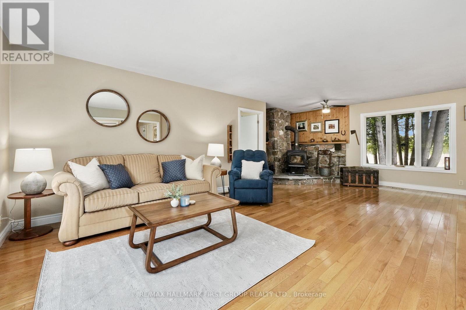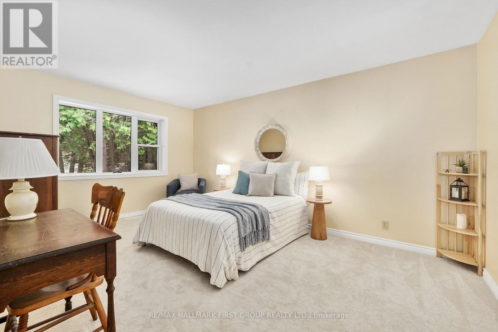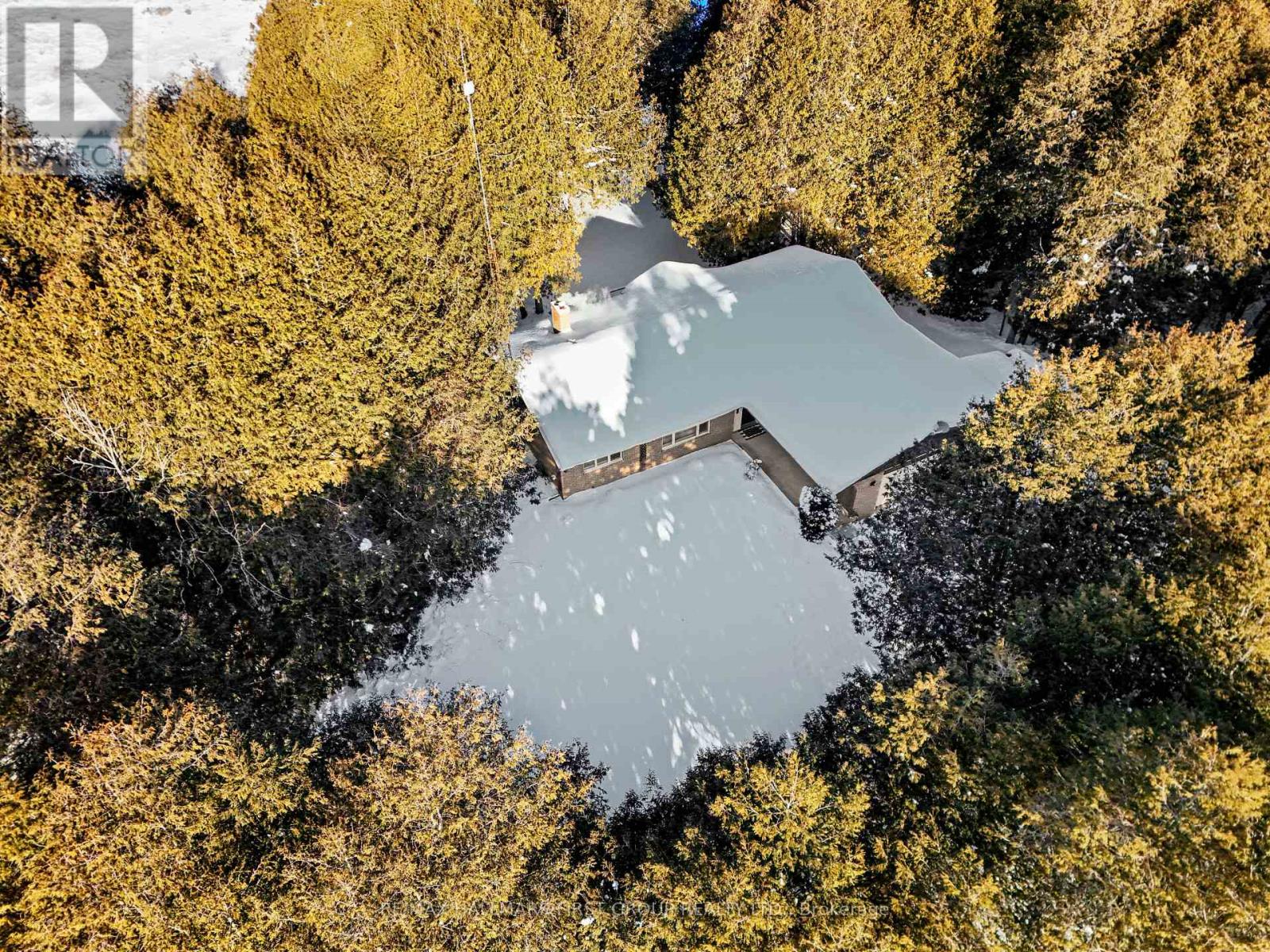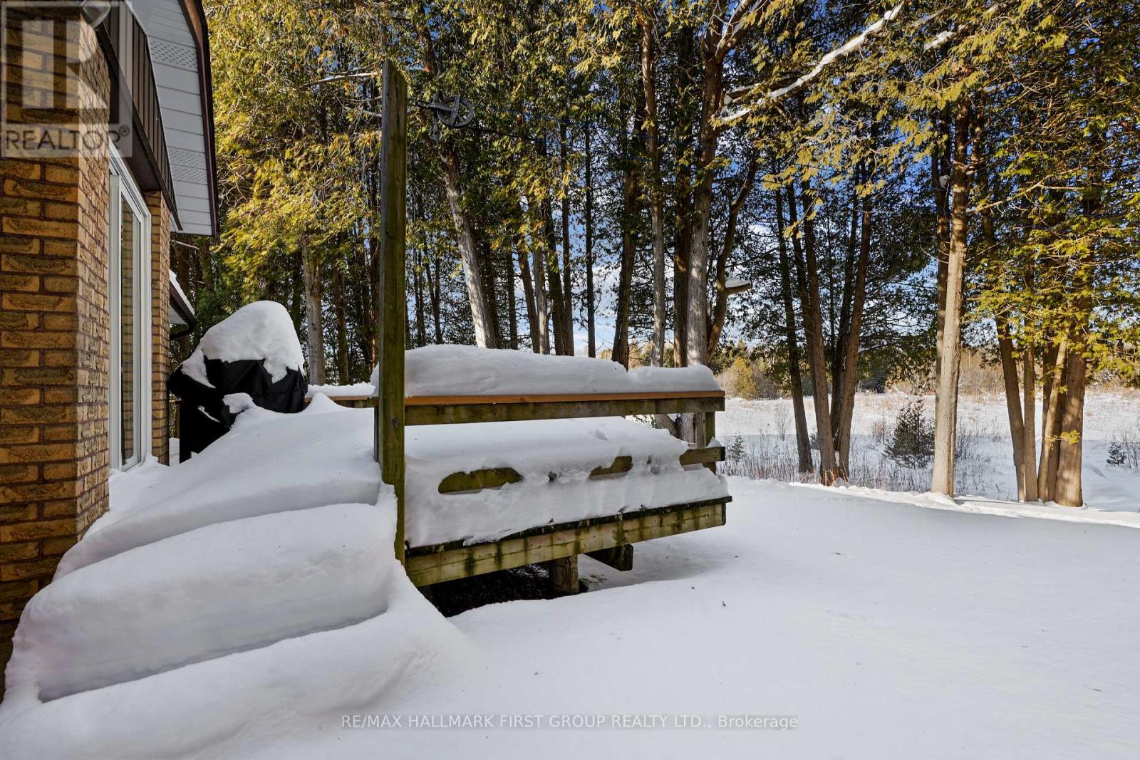 Classic charm meets country living in this timeless brick bungalow on 25 forested acres. Offering the ease of one-level living with the added flexibility of a finished lower level and separate entrance, this home suits multigenerational families or those seeking in-law potential. A covered front entrance leads into bright and airy principal rooms where natural light pours through a large picture window in the living room, framing serene views of the surrounding landscape. A cozy wood stove with a stone hearth adds warmth and character. The open-concept dining area features a walkout to the back deck, which is ideal for outdoor entertaining or simply enjoying peaceful country mornings. The kitchen is stylish and functional, with white cabinetry, matching appliances, and a classic tile backsplash. Two spacious main-floor bedrooms, each with its own full ensuite, while a powder room off the front hall serves guests comfortably. Downstairs, the finished lower level expands the living space with a generous rec room, games or media room, office area, large bedroom, and laundry room with ample storage. A separate entrance provides privacy and versatility for extended family or guests. Outdoors, take in the sights and sounds of nature from the deck or explore the surrounding forest. The attached garage includes an additional storage room, extending versatility. All this country tranquility is just 10 minutes from town amenities and convenient 401 access, a perfect blend of seclusion and accessibility. Note: NEW Furnace installed September 2025. (id:4555)