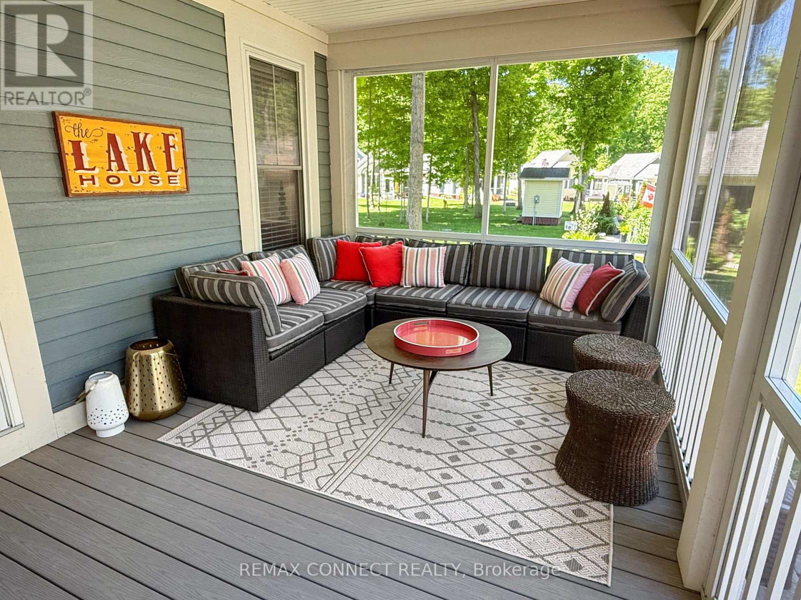 Located along the edge of the large central park in the Hollows neighbourhood of East Lake Shores, 5 Hollow Lane enjoys a front-row position overlooking open green space. Kids can run, play, and bike just steps from the front door, with the added benefit of a large side yard for extra outdoor space, while adults relax on the extra-large screened porch facing the park. This well-maintained 2-bedroom, 2-bath Milford model features a comfortable layout with good separation between spaces. The kitchen and living areas sit between the bedrooms, offering privacy for guests, different schedules, or quiet mornings. Everything is on one level, with in-suite laundry. Inside, the cottage feels bright and welcoming with tasteful furnishings and a relaxed cottage style. The primary bedroom includes a 2-piece ensuite, while the main 4-piece bath offers a full tub/shower. Sold fully furnished, including outdoor furniture, the cottage is move-in ready. A landscaped patio provides another place to gather after a day outside. The cottage is centrally located between the resort's family-focused amenities such as the playground, family pool, and sports courts, and the quieter lakeside area with the adult pool, gym, Owner's Lodge, yoga and pilates classes, and 1,500 feet of shoreline on East Lake with shared canoes, kayaks, and paddleboards. Walking trails, a leash-free dog park, putting green, and lakeside patio complete the resort experience. East Lake Shores is a 3-season (April-October) vacant-land condominium, where you own both the cottage and the land it sits on. Monthly condo fees of $663.03 include internet, cable TV, water/sewer, grounds maintenance, and use of all amenities. This cottage has been owner-occupied; new owners have the option to participate in the on-site rental program or manage their own rentals if desired. Just minutes from Sandbanks Provincial Park, wineries, shops, and dining, 5 Hollow Lane puts the best of Prince Edward County within easy reach. (id:4555)