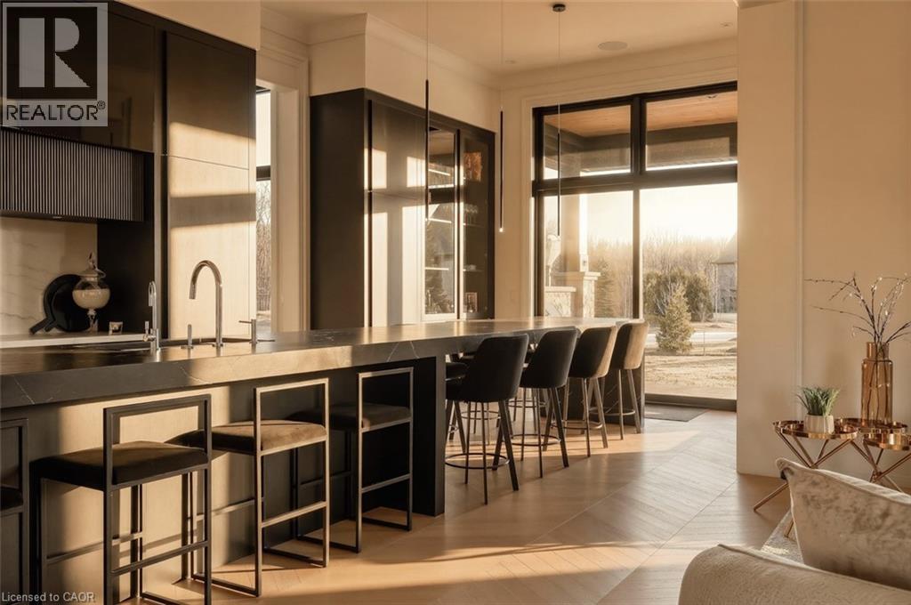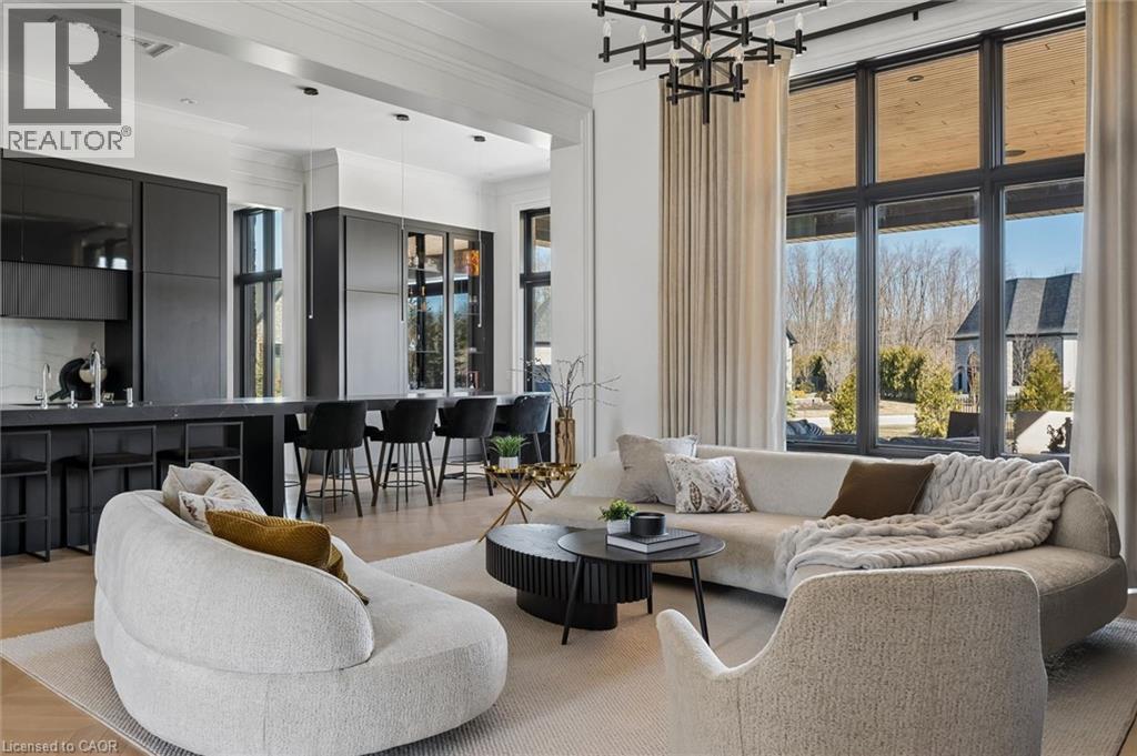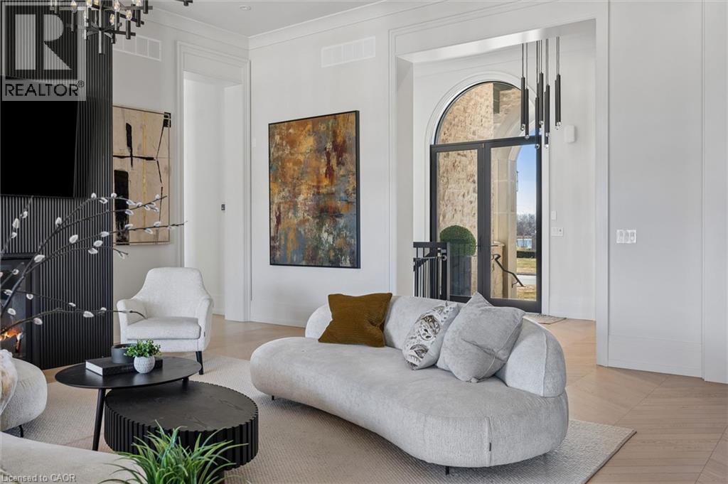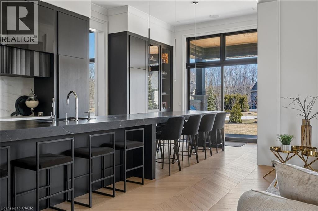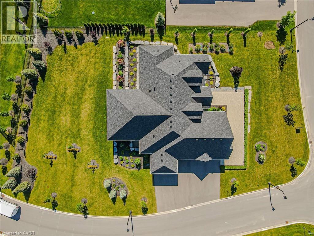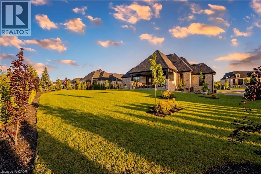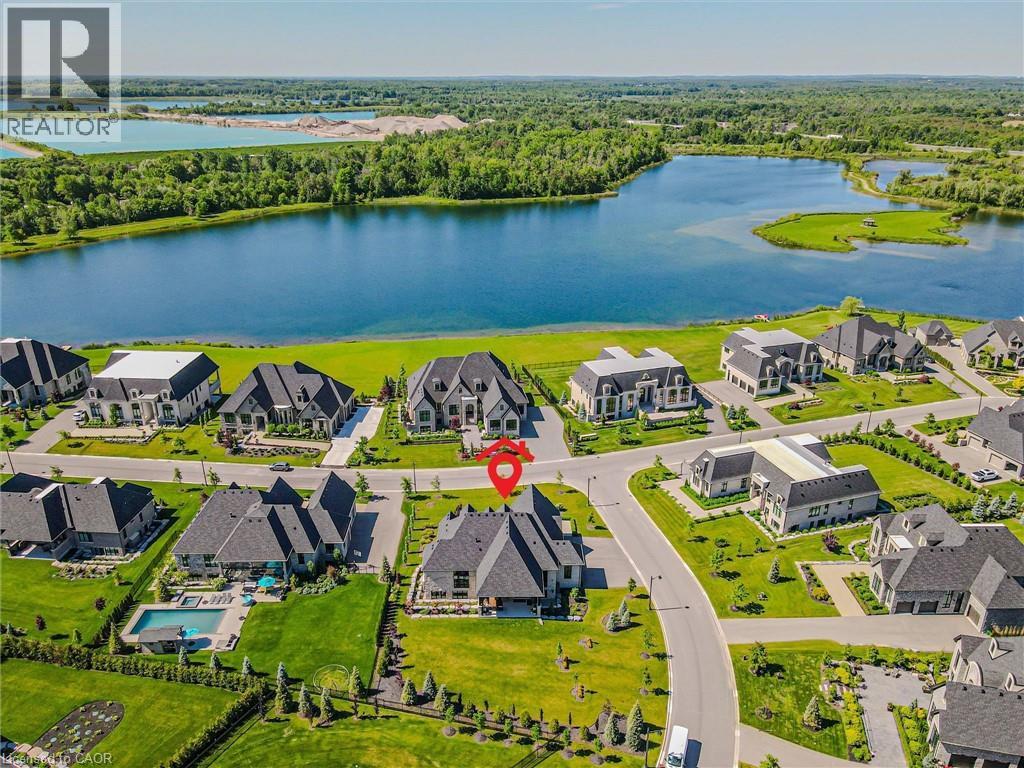 Set within the exclusive gated community of Heritage Lake Estates, this extraordinary custom-built natural stone bungalow offers refined luxury on a private half-acre lot just steps from the lake. Perfectly positioned only minutes from Highway 401 and close to schools and amenities, this home delivers both privacy and exceptional convenience. From the moment you enter, the home impresses with 12-foot ceilings, striking chevron hardwood flooring, dramatic custom lighting, and a stunning fireplace feature wall. Expansive floor-to-ceiling windows flood the home with natural light, creating an atmosphere that is both sophisticated and welcoming. With over 4,200 square feet of impeccably designed living space, the home offers 4 spacious bedrooms and 5 luxurious bathrooms, along with heated floors and premium finishes throughout. At the heart of the home is a show-stopping chef’s kitchen designed for grand entertaining, featuring built-in appliances, a walk-in pantry, and an impressive 20-foot granite island with seating for up to 15 guests. The private primary retreat offers a serene escape with a spa-inspired luxury ensuite and a custom walk-in closet with built-in cabinetry. The fully finished lower level continues the home’s exceptional design with nearly 10-foot ceilings, oversized windows, radiant heated hardwood floors, and a cozy gas fireplace, creating the perfect space for entertaining, relaxing, or hosting guests. Outdoors, enjoy the beautifully landscaped grounds, complete with irrigation, an oversized covered patio for year-round outdoor living, and an expansive three-car garage with additional driveway parking for 6–8 vehicles. Net-zero ready and fully smart-wired with fibre optics and natural gas, this forward-thinking home blends timeless craftsmanship with modern technology. A rare offering where architectural elegance, thoughtful design, and premium craftsmanship come together to create a truly exceptional home. (id:4555)