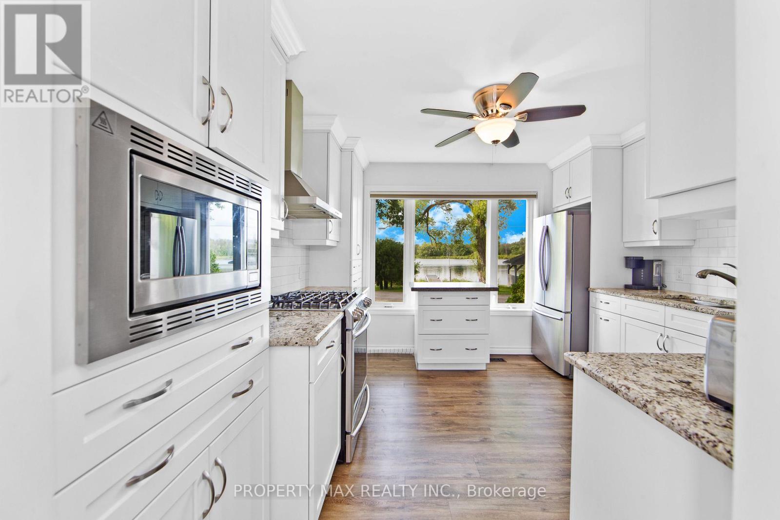 Beautifully renovated 3-bedroom, 3-bathroom waterfront bungalow located on a quiet street just 10 minutes to Highway 401 and 15 minutes to all amenities. This move-in-ready home offers a rare combination of comfort, privacy, and income potential. Enjoy a swimmable sandy shoreline with a large 40-ft roll-in dock-perfect for boating, swimming, and relaxing by the water. Inside, the home features a bright open-concept layout with a spacious, updated kitchen complete with stainless steel appliances and stunning water views. The cozy living room with woodstove flows into the dining area and den, creating an inviting space for everyday living and entertaining. There are three bright bedrooms and two full bathrooms, including a luxurious main bath with a walk-in shower, wall jets, and a rainfall showerhead. A sunroom with a second woodstove leads to a fully fenced backyard oasis featuring a heated on-ground pool, hot tub, two western red cedar gazebos, outdoor 2-piece bathroom, and two fire pits-ideal for hosting or unwinding in privacy. Additional highlights include a 4-car garage, triple-wide driveway, large tiled foyer with garage access, and front patio. This property is immaculate and offers excellent potential for short-term rental income such as Airbnb or VRBO. A perfect waterfront retreat or investment opportunity-don't miss out. (id:4555)