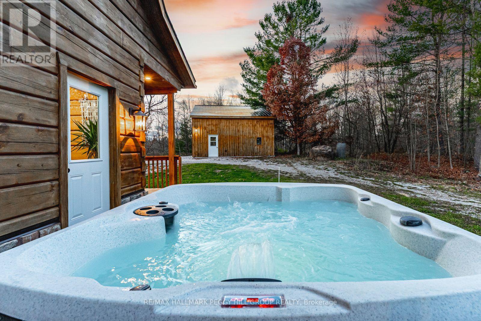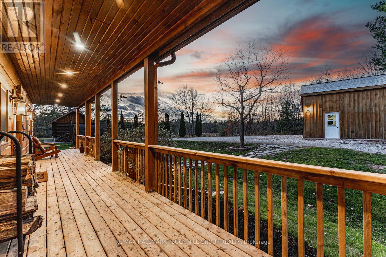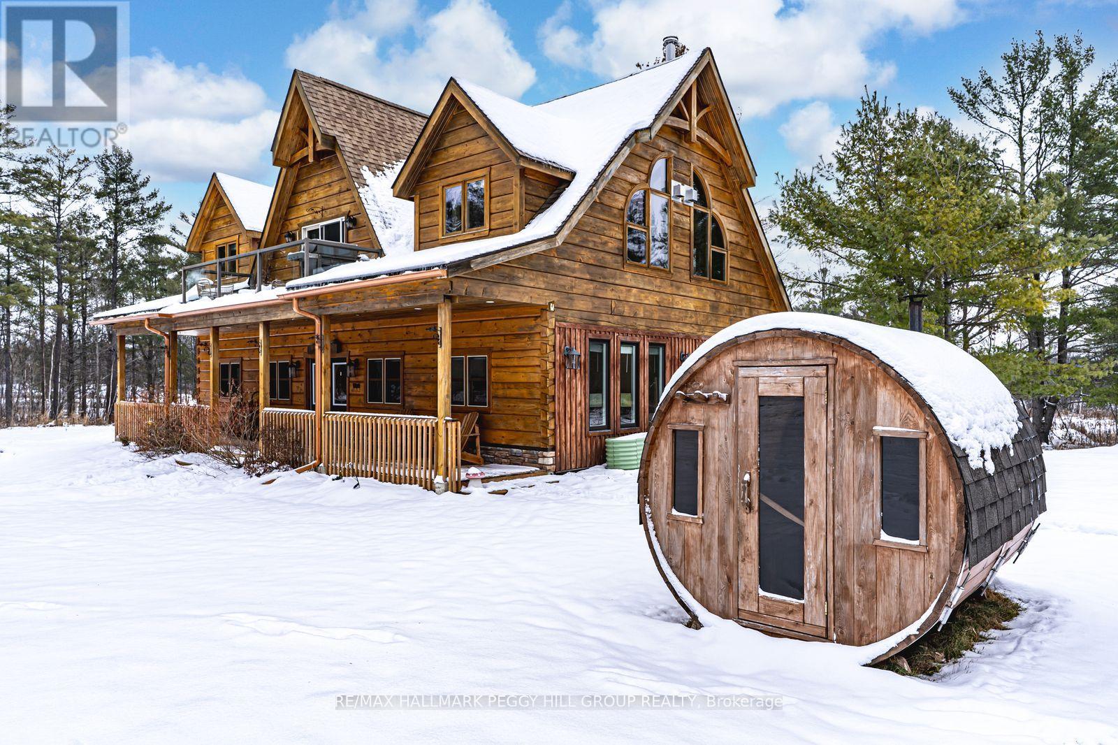 100 ACRES OF NATURAL BEAUTY & A LUXURIOUSLY UPDATED LOG HOME WITH OWNED SOLAR PANELS & VERSATILE OUTBUILDINGS INCLUDING AN OVERSIZED HEATED TRIPLE CAR GARAGE, A SAUNA, SHED, 26FT PLANTA METAL GREENHOUSE, CHICKEN COOP, PUMP HOUSE, A HUNT CAMP & BUNKIE WITH A KITCHEN, BATHROOM, HEATING & A/C! Experience true country living in this log home tucked away on 100 acres with ponds, trails, and forest views, offering the ultimate in peace, privacy, and natural beauty. Showcasing timeless rustic charm, this home features a freshly re-stained log exterior and a full-length front porch, perfect for taking in the serene surroundings. Possibilities are endless with the bunkie- ideal for business or rental use and potential for severance. Outdoor living shines with a sauna, hot tub, chicken coop, fruit trees, garden beds, and a summer gazebo for unwinding in the fresh air. The main level features a cozy family room with a propane fireplace, two bedrooms with walkouts, including a luxurious primary suite with a 5-piece ensuite, a 3-piece bathroom with heated floors, and a flexible office space. The upper level boasts vaulted ceilings, engineered hardwood, and an open-concept kitchen and dining area with quartz counters, tile backsplash, a large island, and stainless steel appliances. The great room features a wood fireplace, statement windows, and a balcony walkout with forest views, plus an additional bedroom and a renovated 5-piece bath. Recent upgrades include fresh interior paint, LED lighting, refinished stairs, brand new flooring, newer door hardware, efficient windows, central vac, and a water filtration system. A solar panel system with battery backup and generator hookups ensures dependable off-grid capability, while newly added Bell Fibe internet keeps you seamlessly connected. Discover the ultimate retreat where luxury, modern comfort, and nature unite in perfect harmony, creating a truly exceptional #HomeToStay. (id:4555)