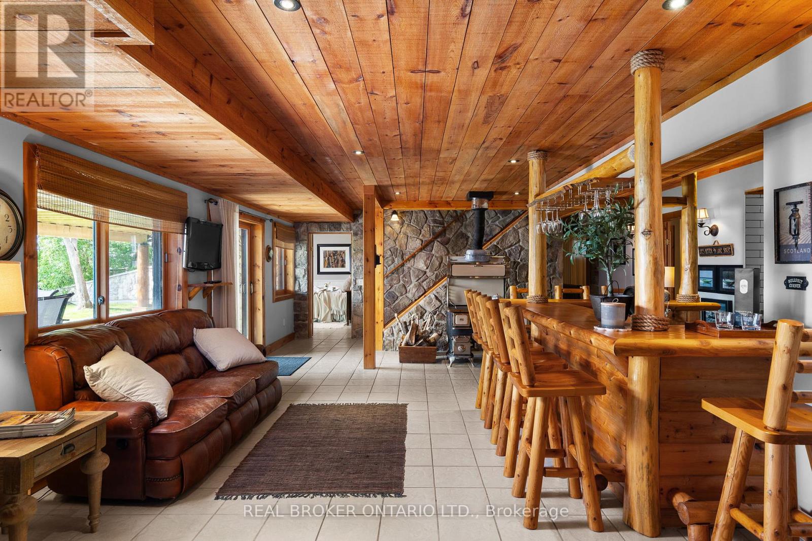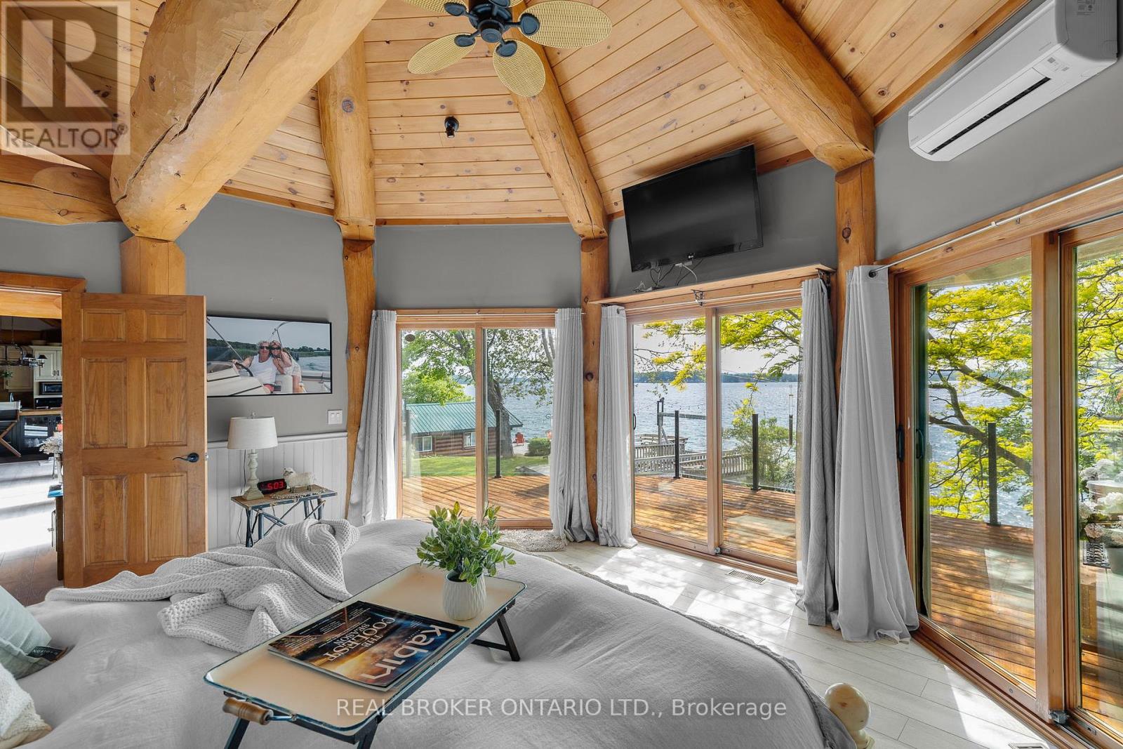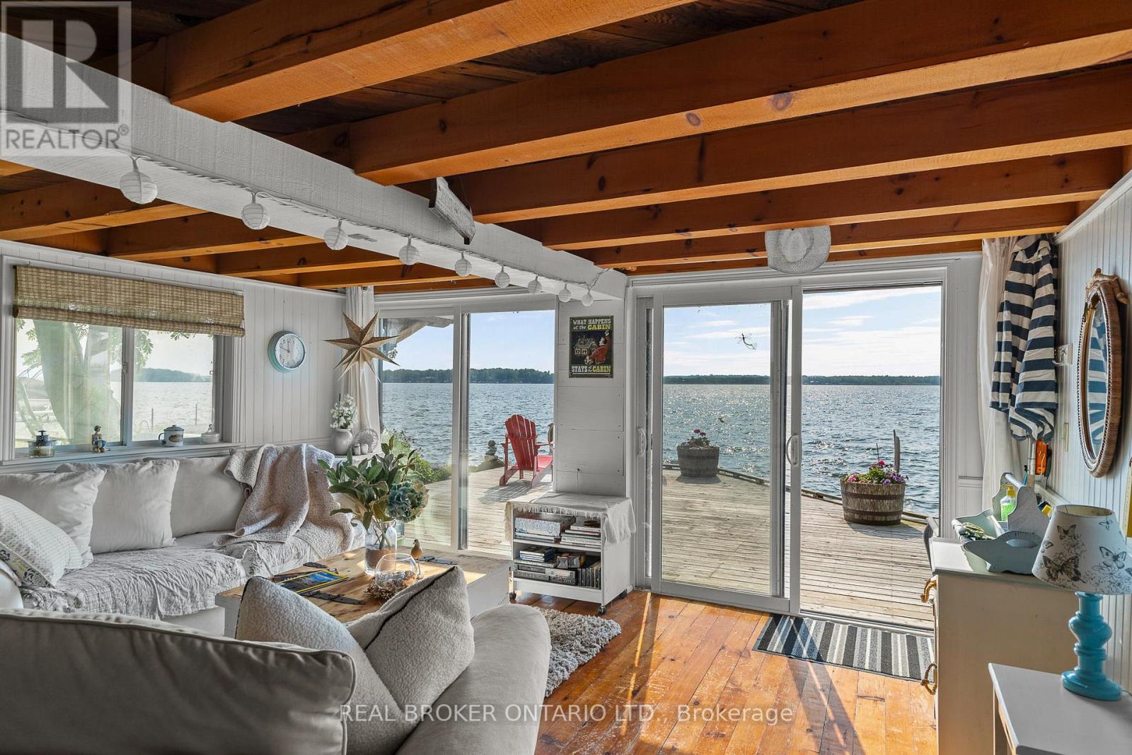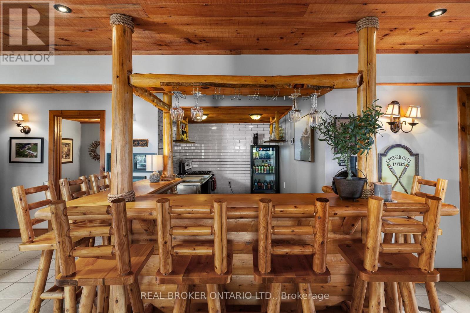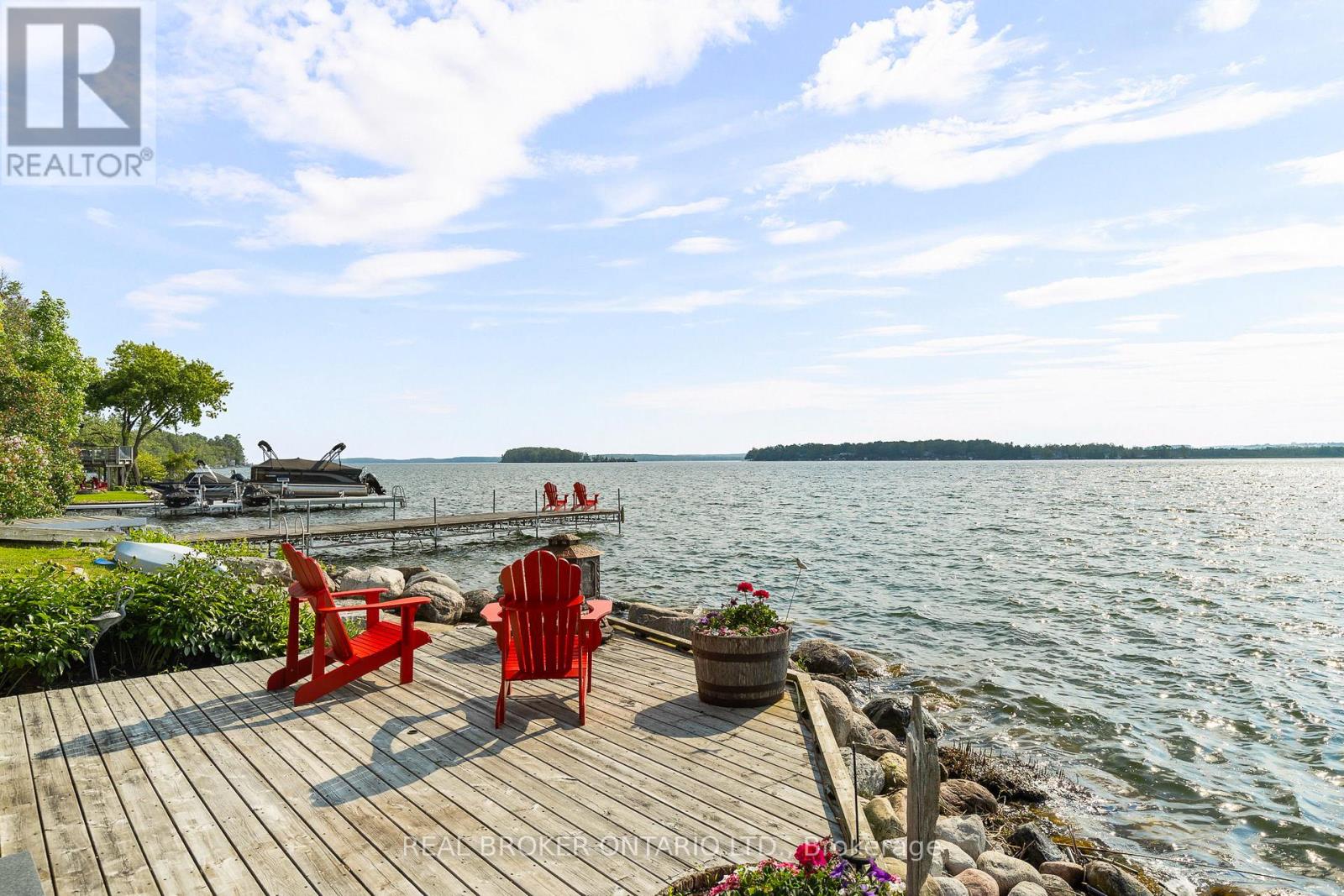 Welcome to 'Four Winds', one of Orillia's most exceptional waterfront properties located on Lake Simcoe. Situated on a rare 206 feet of private shoreline, this 2005-built round log home by Moonstone Timberframe with almost 5000 square feet of finished living space, offers timeless craftsmanship, remarkable design, and panoramic lake views from nearly every room. West-facing exposure delivers unforgettable sunsets, while the setting near the narrows connecting Lake Simcoe and Lake Couchiching offers incredible access to the Trent Severn Waterway and year-round enjoyment. Inside, a 30-ft vaulted great room showcases true log construction and stunning stonework around the gas fireplace. The chefs kitchen is a showpiece with an oversized island, high-end Elmira Heritage appliances, and wraparound views of the lake. The main floor primary suite features a 5-piece ensuite, walk-in closet, in-suite laundry, and private access to the expansive glass-railed deck overlooking the lake. Upstairs, a spacious open loft currently functions as a lounge and home office, originally designed to accommodate 2 additional bedrooms and a full bathroom. The fully finished walkout basement includes in-floor heating throughout, an entertainers bar, media room, two large guest bedrooms, full bathroom with laundry hookup, and access to a screened-in porch and covered patio. At the waters edge, a 458 sq ft finished boathouse bunkie with waterfront deck offers additional guest space. The 1,289 sq ft heated garage/workshop easily stores up to a 38-ft boat plus 2 vehicles. On the water, enjoy a 60ft cantilever dock, large observation deck, boat rail system and additional floating dock. Just 10 minutes to Orillia, under an hour to Muskoka, and only an hour from the GTA, this is lakeside living at its absolute finest. See agent website for info, additional photos and floor plans. (id:4555)