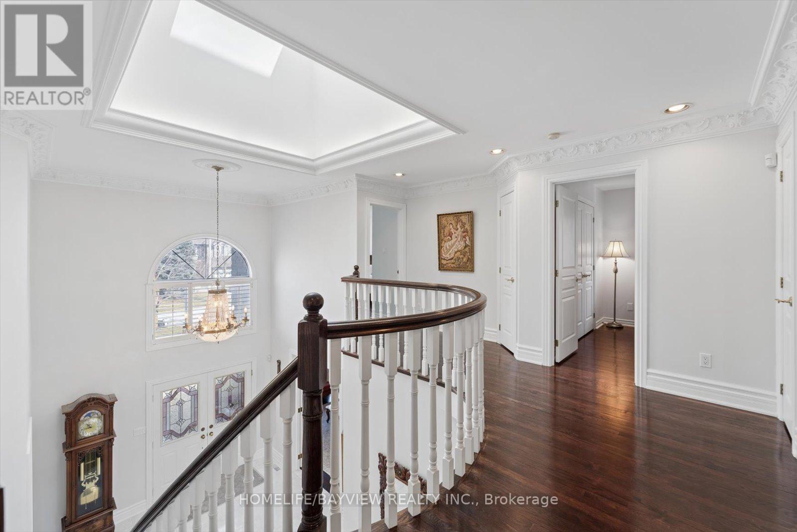 Rare opportunity to own a custom estate home on one of North Richvale's most private dead-end streets with no through-traffic. A builder's own home, this property offers superior structural integrity and excellent bones throughout, situated on an extraordinary 191-foot deep lot. The grand foyer features a large skylight that creates a bright, open feel the moment you walk in, with elegant crown moulding and high-quality hardwood and ceramic tile extending across the main level. The functional layout includes a dedicated den, a convenient main-floor laundry room, and a rare, dedicated walk-in closet near the front entrance for extra storage. The living and dining rooms are separated by elegant French doors, with additional French doors providing a subtle partition for the kitchen without losing the home's airy flow. The kitchen is a standout feature, bathed in natural light from dual skylights and finished with classic wainscotting, granite countertops, and California shutters. It offers a seamless walk-out to a large patio overlooking the massive backyard-a perfect canvas for a pool or professional landscaping. Upstairs, the home is designed for family privacy with four spacious bedrooms, including a primary suite with a 6-piece ensuite, a second bedroom with its own private 4-piece ensuite, and two additional bedrooms sharing a semi-ensuite. Located within close proximity to top-rated schools and just a 13-minute walk to Hillcrest Mall, this property combines a premium location with the lasting quality of custom construction, offering incredible potential for those looking to customize a high-end estate. (id:4555)