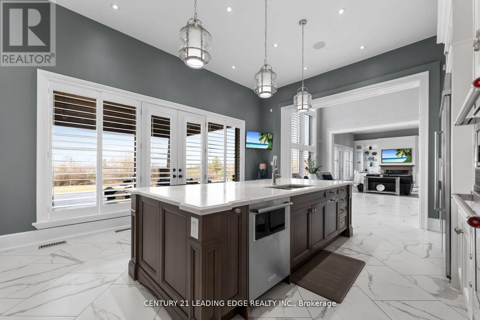 Exceptional opportunity to own a luxurious estate home in a prestigious lakeside community, perfectly suited for professionals working from home, nature lovers, and boating enthusiasts. Set on a private 7.29-acre lot with scenic views of Lake Scugog, this custom-built residence offers over 7,500 sq. ft. of elegant living space, combining timeless architecture with modern convenience. Enjoy soaring cathedral ceilings, a sun-filled layout, and a gourmet kitchen ideal for entertaining. The main floor includes multiple walkouts to terraces, while the serene primary suite features a fireplace, custom wardrobe, walk-in closet, and spa-like ensuite with views of nature. With 6 bedrooms and 7 bathrooms, the home also includes a walk-out basement with heated floors, gym, recreation space, and rough-in for a second kitchen or bar, ideal for multigenerational living or separate work/live space. Smart wiring, security cameras, dual Generac generators, intercom, dual furnaces, and a water treatment system provide modern functionality. The three-car attached garage includes heated floor rough-in and ample storage. A major highlight is the approx. 5,000 sq. ft. detached heated accessory building with three finished levels, workshop for 4+ vehicles, mezzanine, office or guest house potential, and three rough-in bathrooms. The lower level with walk-out rough-in adds even more versatility perfect for home-based businesses, studios, or in-law suites. Just around the corner from a public boat launch, this property offers convenient lake access. Whether you're seeking peace and privacy, space to grow a business, or easy access to lake life, this unique property offers endless potential in an unbeatable location. (id:4555)