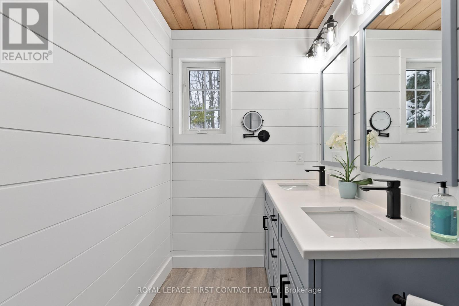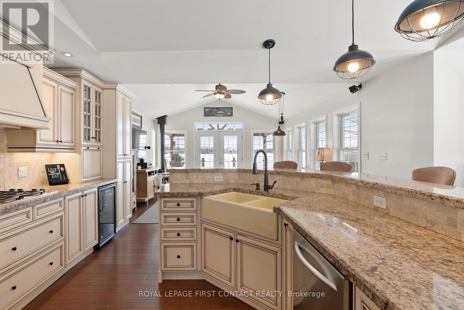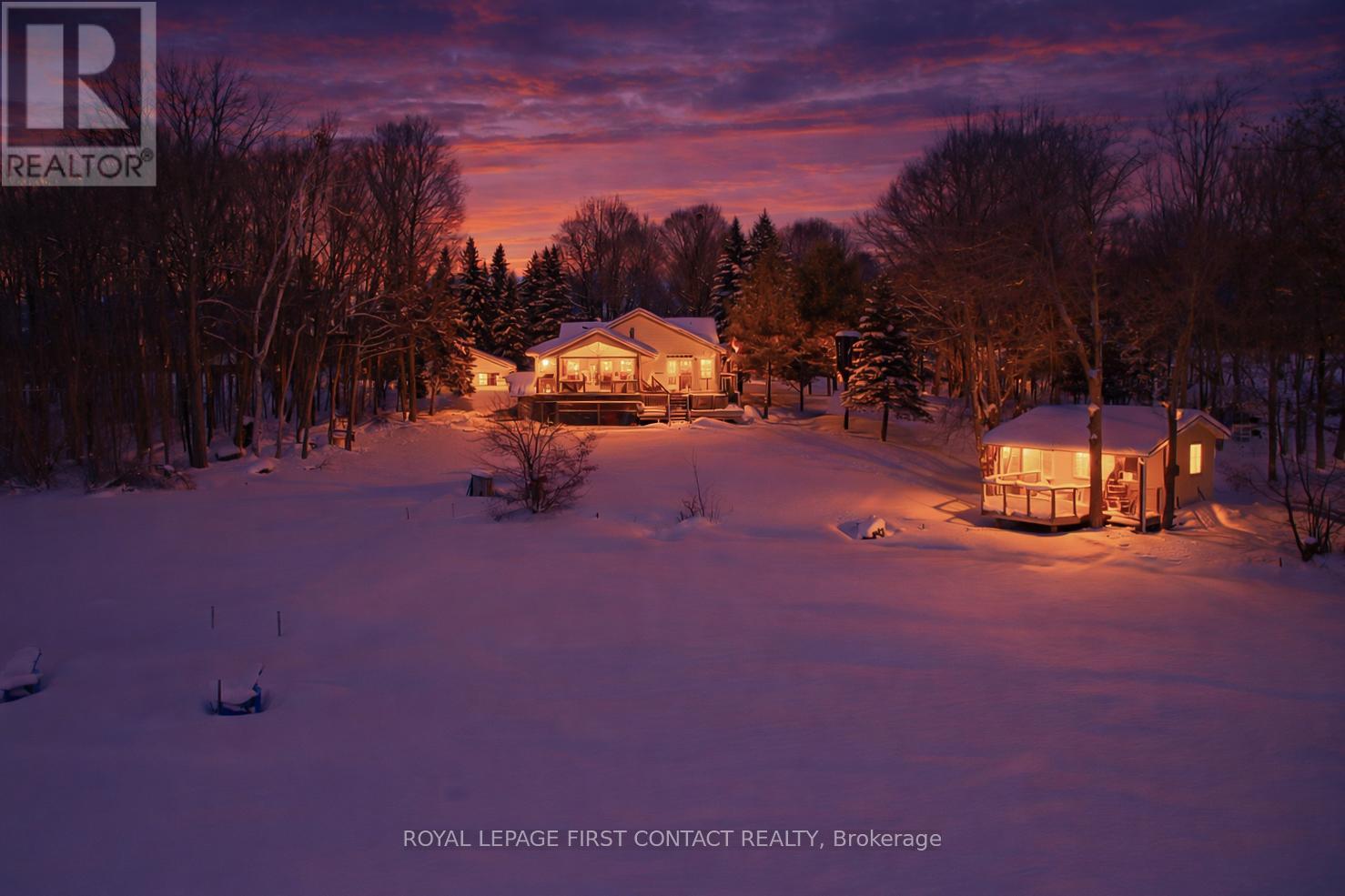 A home that feels like a getaway, with the water at your doorstep. Set on a beautiful point on Little Lake, this custom-built, year-round waterfront home offers a quiet setting, southwest exposure and unforgettable sunsets Set on a level 0.81 acres with 218 ft of private shoreline, offers direct access to the Trent-Severn Waterway, connecting Gloucester Pool to Georgian Bay opening the door to endless boating, fishing, and cruising. Enjoy 3,500 sqft with 4 bdrms, 3 baths, a gourmet kitchen and a lower-level kitchenette, along with two laundry areas, providing excellent flexibility for family living, entertaining, or extended-stay guests or multi-generational living. The main level is designed to maximize lake views and everyday comfort, offering an inviting open-concept layout flooded with natural light from oversized windows throughout. The living space flows seamlessly between cozy gathering areas with fireplaces, a sitting room, and a dedicated dining area - ideal for both entertaining and relaxed evenings by the fire. Anchoring the level is a custom gourmet kitchen, recently renovated and appointed with granite countertops, premium appliances, and abundant cabinetry. A serene primary suite with ensuite. Multiple walk outs extend the living space to a wrap-around covered porch, providing shaded outdoor enjoyment and exceptional waterfront views. The fully finished lower level is exceptionally well laid out, featuring a roomy kitchenette with dining area, a large recreation and family room, dedicated office space, generous bedrooms, a full walk-up separate entrance. Outdoors, enjoy a private dock, a peaceful bunkie with its own deck for additional sleeping space, and a spacious triple heat garage ideal for vehicles, workshop , or seasonal storage. Conveniently located minutes to marinas, LCBO, general store, Rawley Resort and Inn at Christie's Mill, with nearby skiing and golf & snowmobiling . Approx 35 minutes to Barrie with easy access to Highway 400. (id:4555)