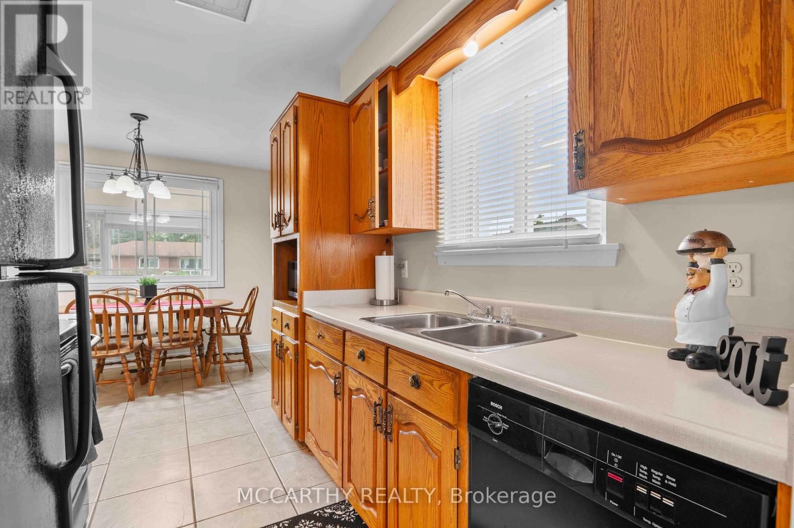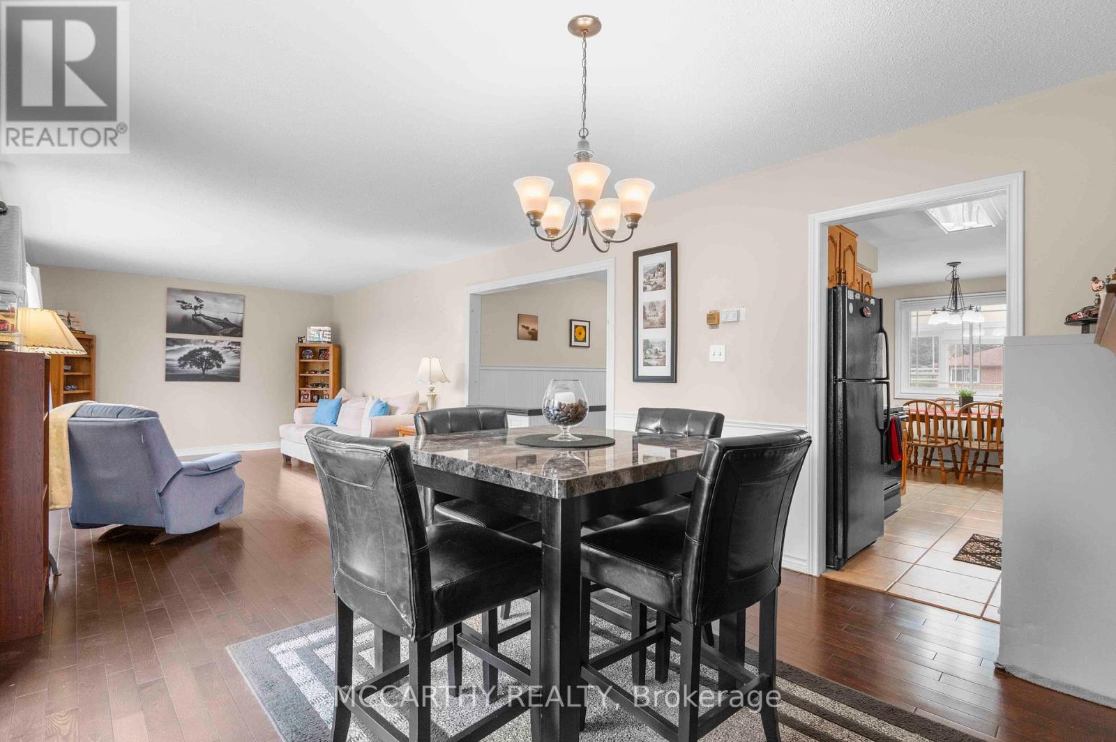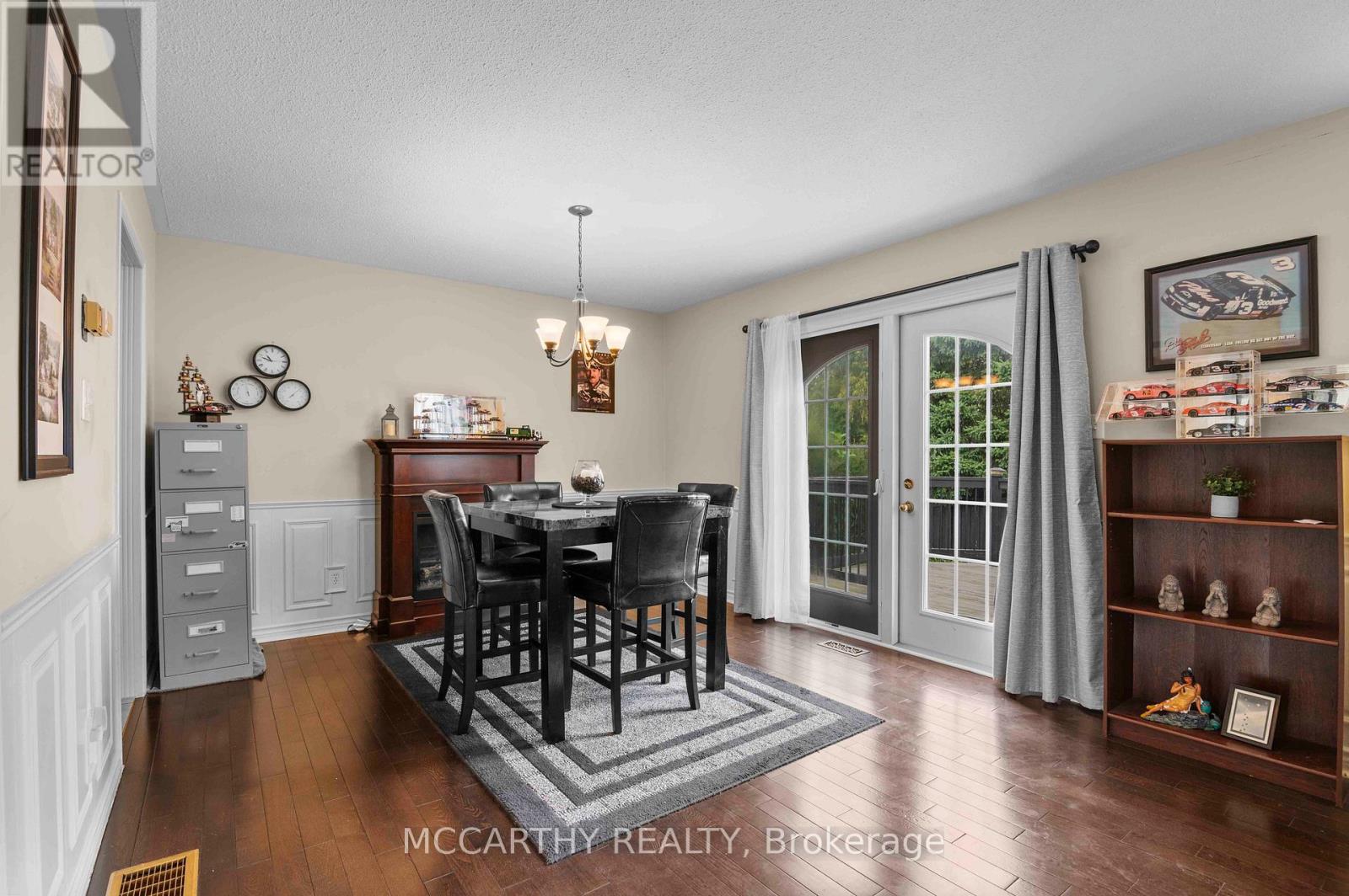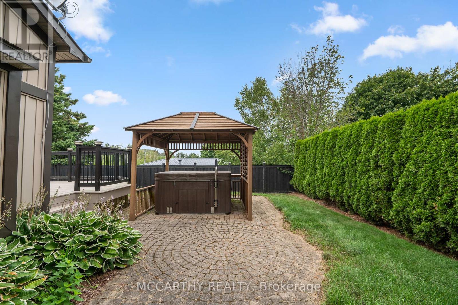 Great Curb Appeal, Large Corner lot with large lot 80 x 100ft, Large front entrance, Big back yard deck and Hot Tub with Hard cover. 3 Bedroom 2 Bathroom well maintained 3 level Side split. Pretty entrance of paving stone walkway around the house and steps up to a welcoming deck, has convenient & pretty motorized awning for shade and privacy. Come into the bright and airy 3 season sunroom entry. Door way into Large foyer with tile floor, double closet w modern sliding doors. Well Lit Eat in Kitchen with plenty of cupboards with large window over double sink. Hardwood floors in Combined Dining room and Living room. Living room has large picture window over looking the large Back Deck deck. Eat dinner in the large Dining room that is combined with the living room, Electric Fireplace. Garden Doors Walk out from the dining room to the back deck and spacious back yard, great for family time or entertaining. Enjoy evenings in your own Gazebo covered Hot Tub. Double door gate to back yard. Spacious side yard with a large wood shed approx. 10ft x 16ft with hydro. Upper level has three good sized bedrooms and a spacious 4 piece Bathroom. Lower level Rec room has cozy gas fireplace and is spacious and plenty of room for family time and entertaining. 2nd Bathroom on lower level 3pc w large walk in tiled shower. The laundry room with plenty of cabinets for storage and folding. Utility room is combined with the laundry room. Need space for parking, this is it, 2 car garage plus Concrete driveway with parking for 4 plus, total 6 parking spots, Great for the working couple, work vehicle, recreation vehicle, visitors or extended family cars. (No need to worry about winter parking spots. )Street is quiet as not a drive thru street, Corner lot is large and has good size side and back yard. Very close to Elementary and Secondary schools, parks, recreation/arena. Perfect well maintained home for family living. Desired location, Move in ready. Book showing today, Must See. (id:4555)