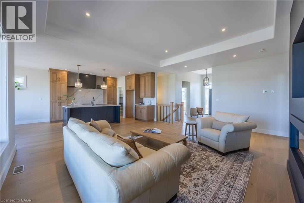 Beautiful new bungalow offering 1,658 sq. ft. of modern living, this home combines style, function, and a prime location close to shopping, dining, schools, and all the amenities Simcoe has to offer. The exterior features timeless stonework, a covered front porch with stained pine entrance, and great curb appeal. Step inside to 9 ft ceilings throughout, a stunning 10 ft tray ceiling in the living room, and an electric fireplace that adds warmth and charm. The open-concept kitchen/dining area includes an island, custom cabinetry, and a walk-in pantry—perfect for both everyday living and entertaining. Walk out from the dining area to a covered upper deck, and from the finished basement’s rec room to a lower patio—creating seamless indoor-outdoor living. The main floor offers two generous bedrooms, including a primary suite with a walk-in closet and a spa-like ensuite featuring a tiled shower with glass door. A stylish 4 pc bath completes the main level. The oversized garage with insulated doors provides direct access to the laundry room, offering both convenience and practicality. The finished basement expands your living space with a spacious rec room, bedroom, full bathroom, storage, and utility room. Don’t miss this opportunity to own a stunning new home—move-in ready and waiting for your personal touch. Book your private viewing today! (id:4555)