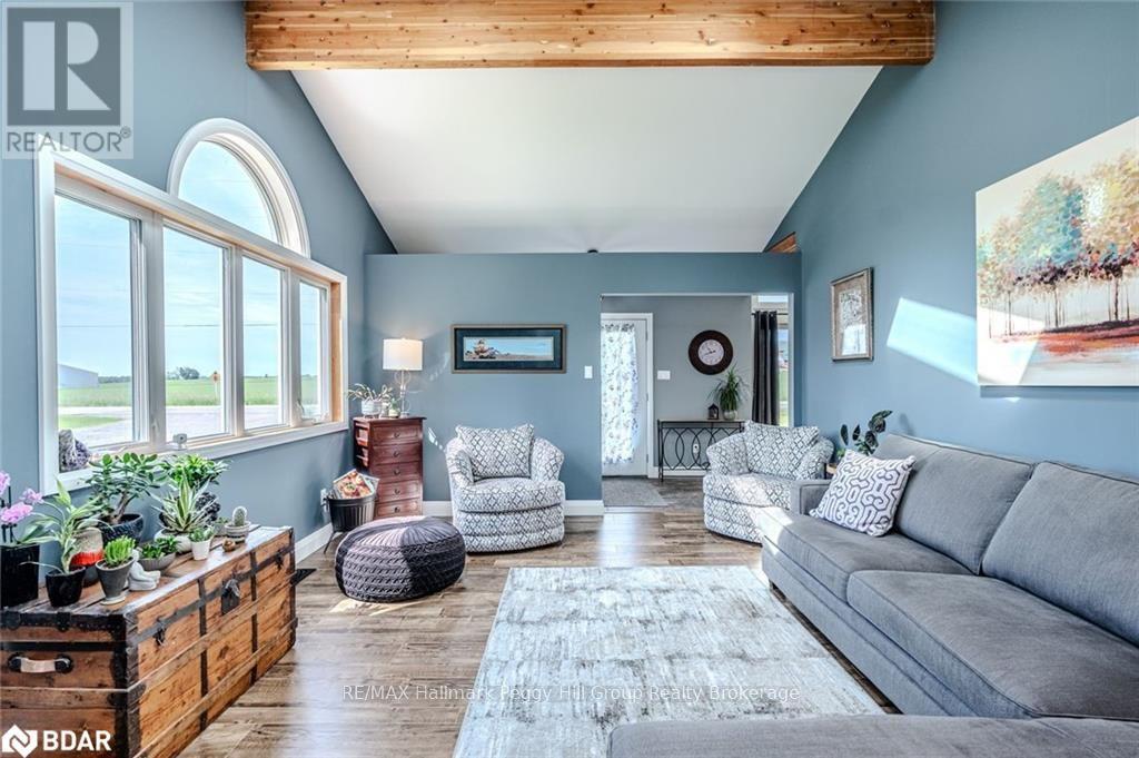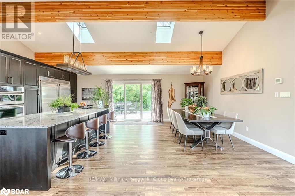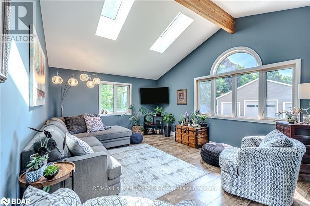 BOLD ARCHITECTURE, LUXURY UPGRADES, A HEATED 3-BAY SHOP, & SEPARATE 200 AMP SERVICE TO BOTH THE HOUSE & THE SHOP ON OVER HALF AN ACRE OF COUNTRY LIVING! Step into this 2019 Linwood home offering over 3,300 sq ft of finished living space on a beautifully landscaped half-acre lot, just minutes from downtown Elmvale. Enjoy an unmatched lifestyle close to Wasaga Beach, the Elmvale Jungle Zoo, Tiny Marsh, parks, schools, a library, an arena, and beloved community events like the Maple Syrup Festival and Fall Fair. This property is designed to impress, with a striking A-frame roofline, oversized triple-pane windows, double-door entry, manicured gardens, a stone patio, gazebo, and full landscape lighting with built-in irrigation. The heated and insulated detached shop with 3 garage doors, a commercial-grade Liftmaster opener, and dedicated 200 amp service is a dream for hobbyists and professionals alike. Inside, vaulted ceilings with exposed Douglas Fir beams, floor-to-ceiling windows, skylights, and designer LED lighting create an unforgettable interior. The modern kitchen boasts quartz counters, dark shaker cabinets, tile backsplash, an under-mount sink, island seating, and premium Jennair appliances, opening to a stylish dining space with wide patio doors, and a breathtaking living room. A skylit family room and two main floor bedrooms served by a 4-piece bath elevate everyday comfort, while a custom maple staircase with an engineered steel mono stringer leads to a loft-style primary suite with a custom walk-in closet and an ensuite with an air jet tub and imported Italian glass shower. The partially finished basement adds a rec room, bedroom, full bath, and a utility room with a tankless water heater, softener, UV system, and 4-filter water treatment. With a Generac and blown-in insulation for added efficiency, every detail is thoughtfully crafted to create an extraordinary lifestyle, and a truly rare opportunity to live and entertain in style! (id:4555)