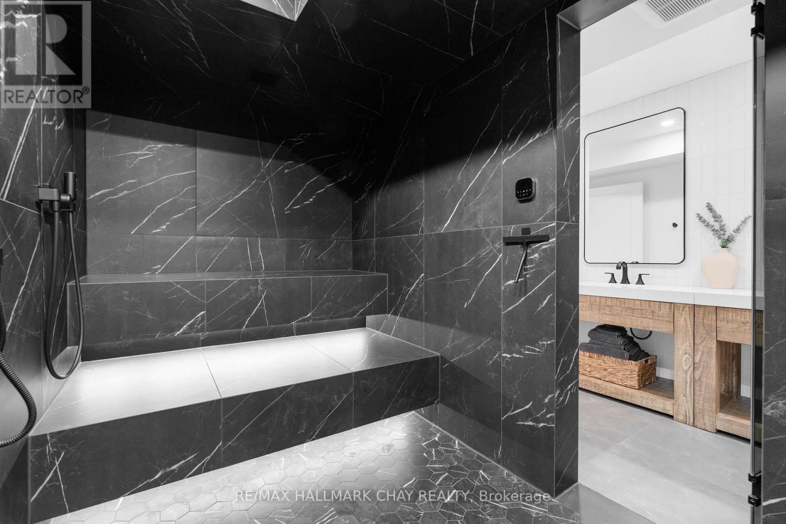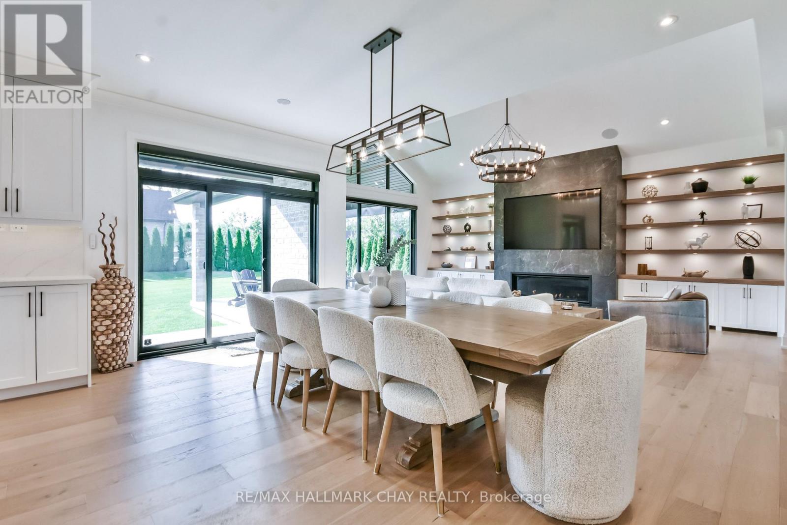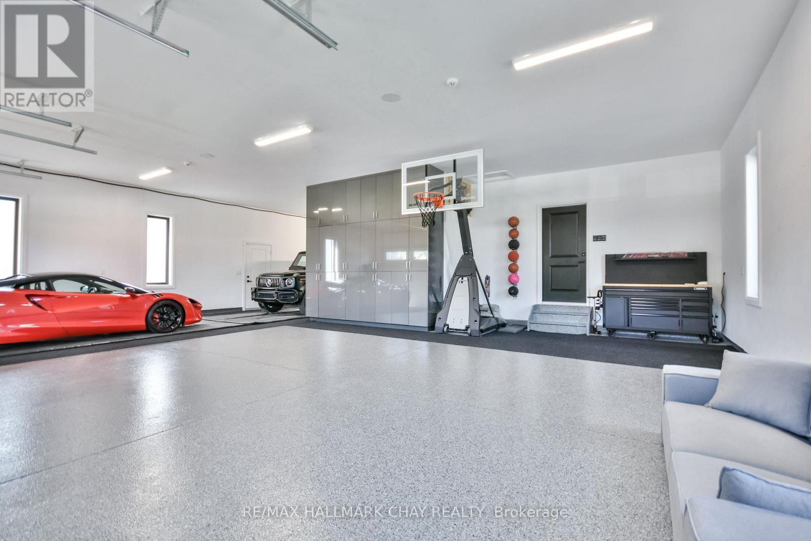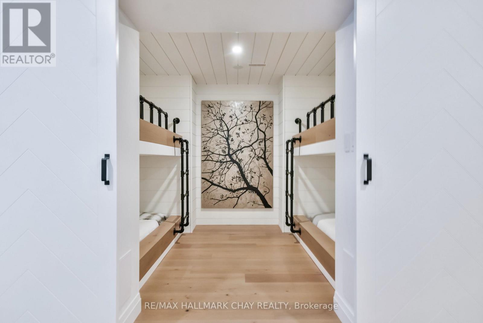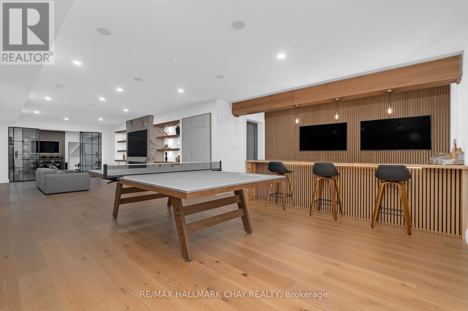 PRESENTING luxury, lifestyle, privacy, and an exquisite location-all embodied in this stunning custom executive residence in Springwater's prestigious, family centric Cameron Estates. Set on a premium half acre corner lot, this exceptional bungalow offers 5,700+ sq.ft. of finished living space and an oversized 133'x187' private backyard framed by mature cedars and one of the community's largest reclaimed greenspaces. With over $550K in recent updates/upgrades, this home delivers an elevated living experience inside & out. The main level showcases a designer Chef's kitchen with expansive prep space, oversized island with integrated beverage centre, premium Jenn Air 6 burner + griddle range, dual ovens, Dacor fridge/freezer, and walk in pantry with prep sink. Great room impresses with a striking 63" floor to ceiling gas fireplace, vaulted ceilings, and wall to wall views of the private rear yard. Additional main floor features include a dedicated home office, guest 2 pc bath, spacious laundry/mudroom, and three generous bedrooms-each with its own ensuite and walk in closet. The full, finished lower level doubles the living space and continues the home's refined neutral palette. Purpose built for relaxation and entertainment, this level features a spa inspired steam room, home gym with heated padded flooring, guest suite, custom four queen designer bunk room, rec room with linear fireplace and built ins, games room, home bar, office, soundproof gaming room, and additional 2 pc bath. Energy efficient water heated flooring runs throughout. Smart home conveniences include whole home audio (14 zones, 7 Sonos amps, 37 speakers), remote electric blinds, 7 camera security system, wall mounted TVs, and Bell Fibre internet. Car enthusiasts will appreciate the oversized 1,600+ sqft heated 5 vehicle garage, complete with epoxy floors, storage, EV ready wiring, built in audio/TV, pressure washer system, direct basement access with mud room, and rear garage door to the backyard. (id:4555)
