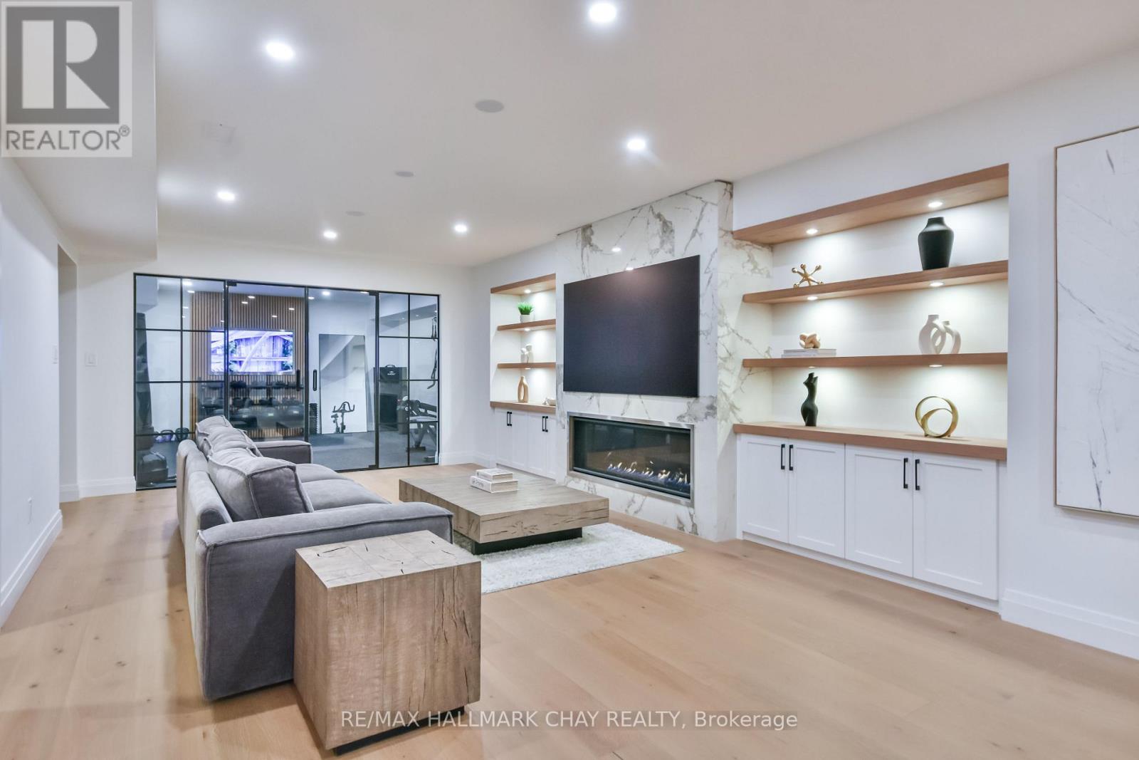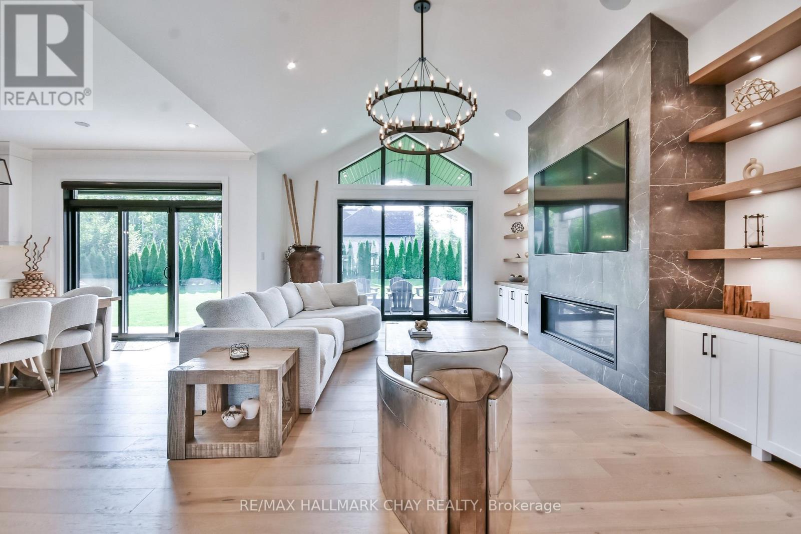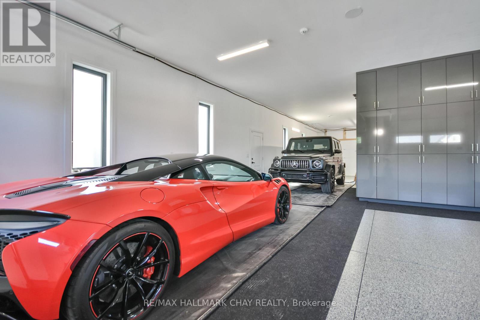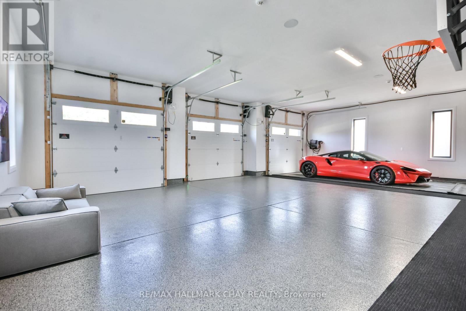 PRESENTING luxury, lifestyle, privacy, and an exquisite location-all embodied in this stunning custom executive residence in Springwater's prestigious, family centric Cameron Estates. Set on a premium half acre corner lot, this exceptional bungalow offers 5,700+ sq.ft. of finished living space and an oversized 133'x187' private backyard framed by mature cedars and one of the community's largest reclaimed greenspaces. With over $550K in recent updates/upgrades, this home delivers an elevated living experience inside & out. The main level showcases a designer Chef's kitchen with expansive prep space, oversized island with integrated beverage centre, premium Jenn Air 6 burner + griddle range, dual ovens, Dacor fridge/freezer, and walk in pantry with prep sink. Great room impresses with a striking 63" floor to ceiling gas fireplace, vaulted ceilings, and wall to wall views of the private rear yard. Additional main floor features include a dedicated home office, guest 2 pc bath, spacious laundry/mudroom, and three generous bedrooms-each with its own ensuite and walk in closet. The full, finished lower level doubles the living space and continues the home's refined neutral palette. Purpose built for relaxation and entertainment, this level features a spa inspired steam room, home gym with heated padded flooring, guest suite, custom four queen designer bunk room, rec room with linear fireplace and built ins, games room, home bar, office, soundproof gaming room, and additional 2 pc bath. Energy efficient water heated flooring runs throughout. Smart home conveniences include whole home audio (14 zones, 7 Sonos amps, 37 speakers), remote electric blinds, 7 camera security system, wall mounted TVs, and Bell Fibre internet. Car enthusiasts will appreciate the oversized 1,600+ sqft heated 5 vehicle garage, complete with epoxy floors, storage, EV ready wiring, built in audio/TV, pressure washer system, direct basement access with mud room, and rear garage door to the backyard. (id:4555)