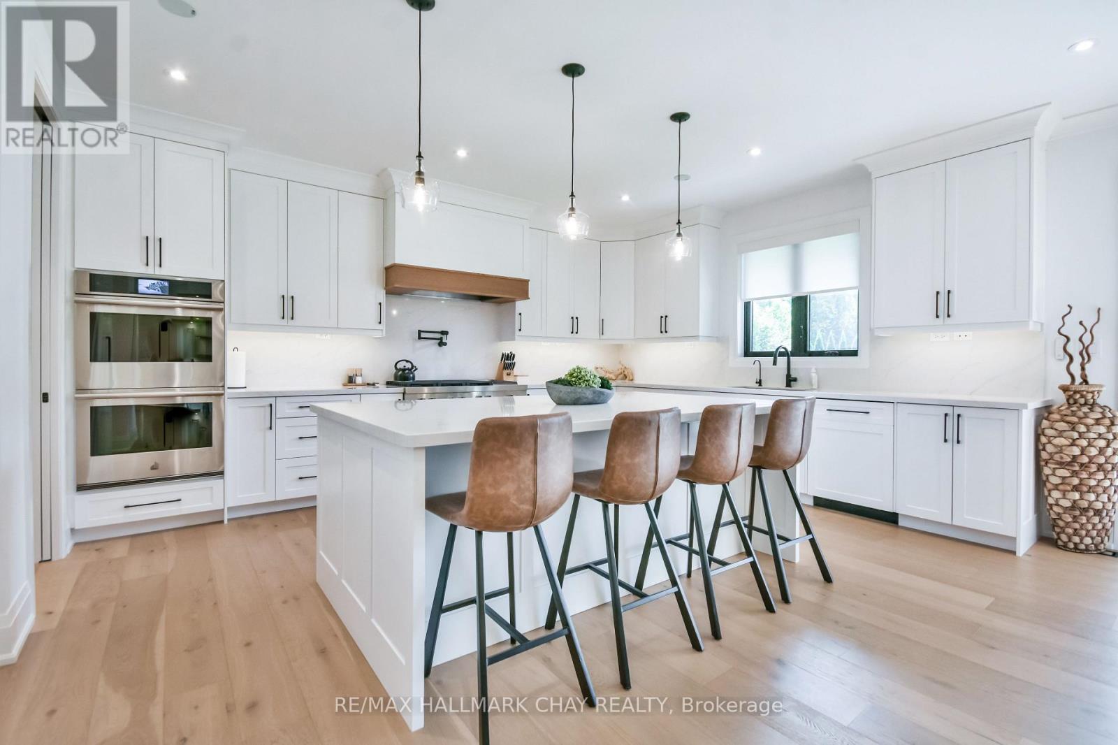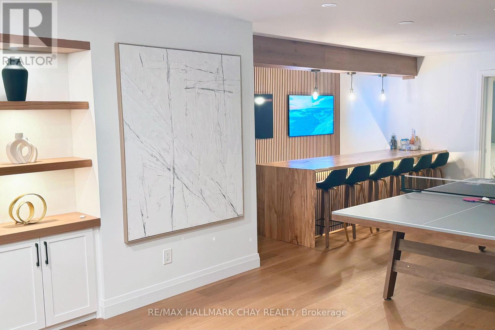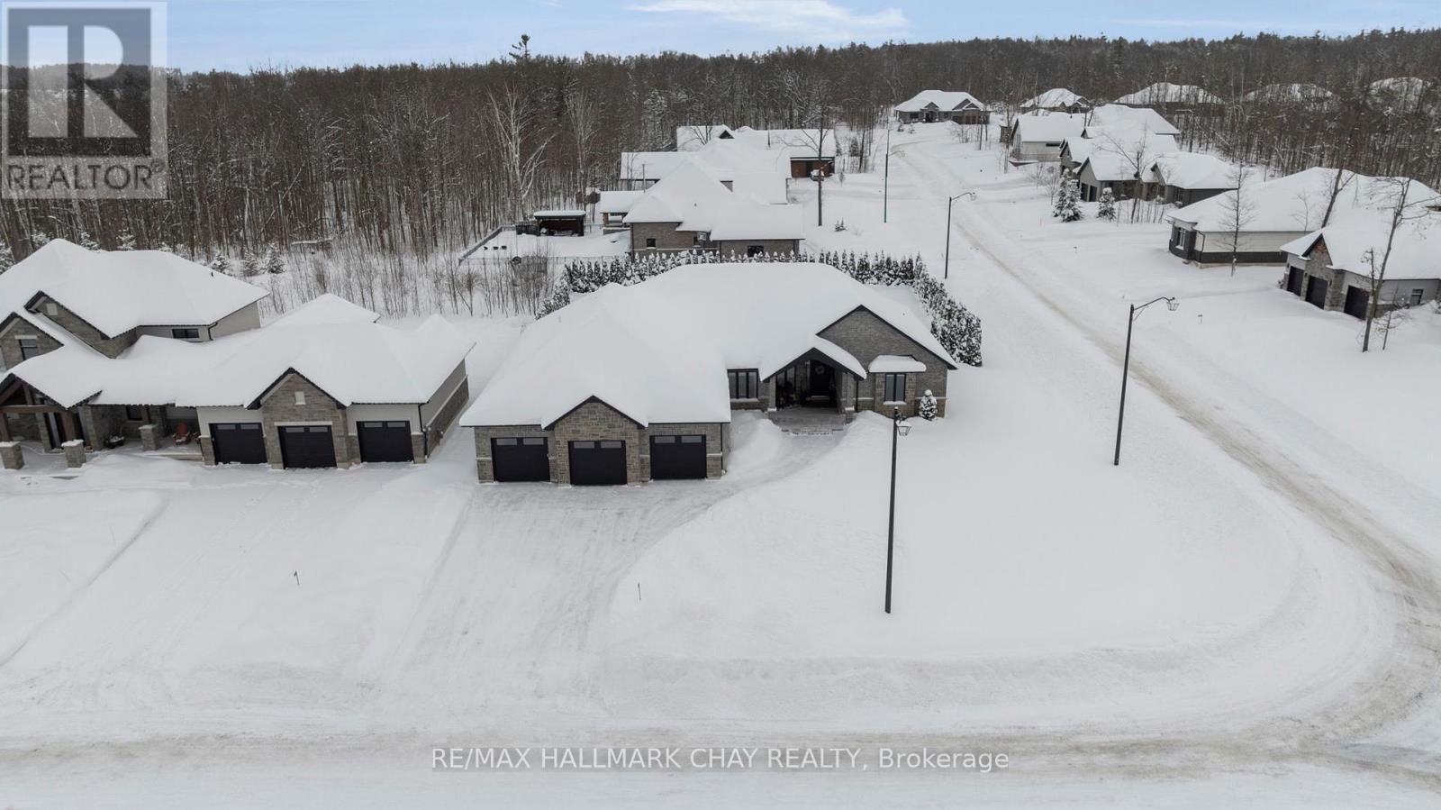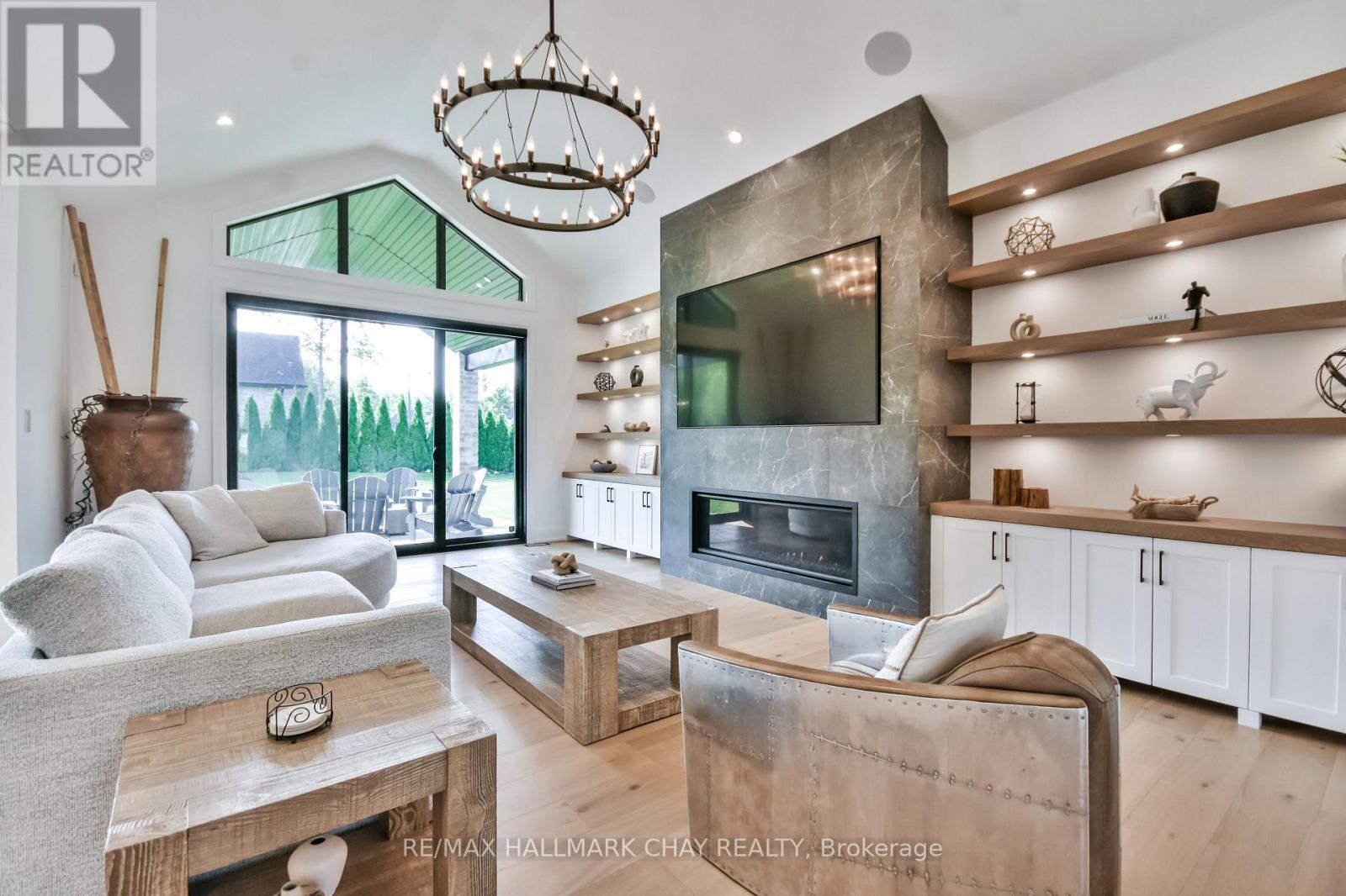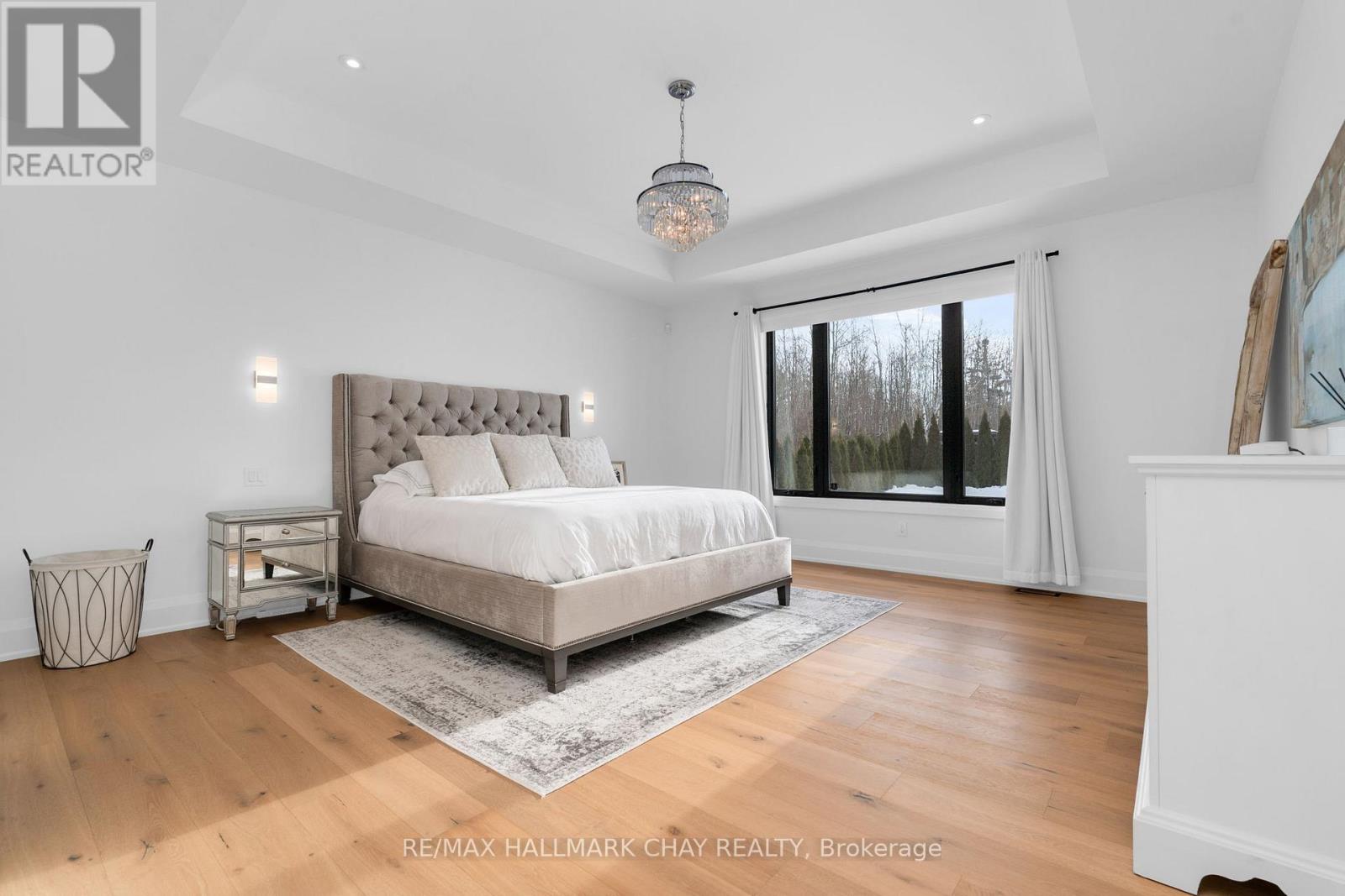 PRESENTING luxury, lifestyle, privacy, and an exquisite location-all embodied in this stunning custom executive residence in Springwater's prestigious, family centric Cameron Estates. Set on a premium half acre corner lot, this exceptional bungalow offers 5,700+ sq.ft. of finished living space and an oversized 133'x187' private backyard framed by mature cedars and one of the community's largest reclaimed greenspaces. With over $550K in recent updates/upgrades, this home delivers an elevated living experience inside & out. The main level showcases a designer Chef's kitchen with expansive prep space, oversized island with integrated beverage centre, premium Jenn Air 6 burner + griddle range, dual ovens, Dacor fridge/freezer, and walk in pantry with prep sink. Great room impresses with a striking 63" floor to ceiling gas fireplace, vaulted ceilings, and wall to wall views of the private rear yard. Additional main floor features include a dedicated home office, guest 2 pc bath, spacious laundry/mudroom, and three generous bedrooms-each with its own ensuite and walk in closet. The full, finished lower level doubles the living space and continues the home's refined neutral palette. Purpose built for relaxation and entertainment, this level features a spa inspired steam room, home gym with heated padded flooring, guest suite, custom four queen designer bunk room, rec room with linear fireplace and built ins, games room, home bar, office, soundproof gaming room, and additional 2 pc bath. Energy efficient water heated flooring runs throughout. Smart home conveniences include whole home audio (14 zones, 7 Sonos amps, 37 speakers), remote electric blinds, 7 camera security system, wall mounted TVs, and Bell Fibre internet. Car enthusiasts will appreciate the oversized 1,600+ sqft heated 5 vehicle garage, complete with epoxy floors, storage, EV ready wiring, built in audio/TV, pressure washer system, direct basement access with mud room, and rear garage door to the backyard. (id:4555)