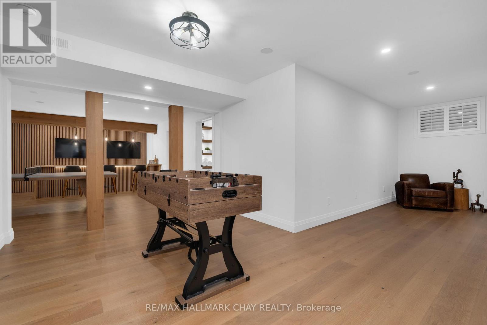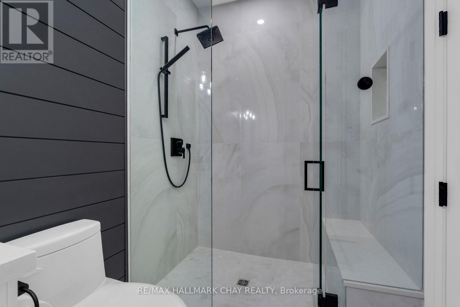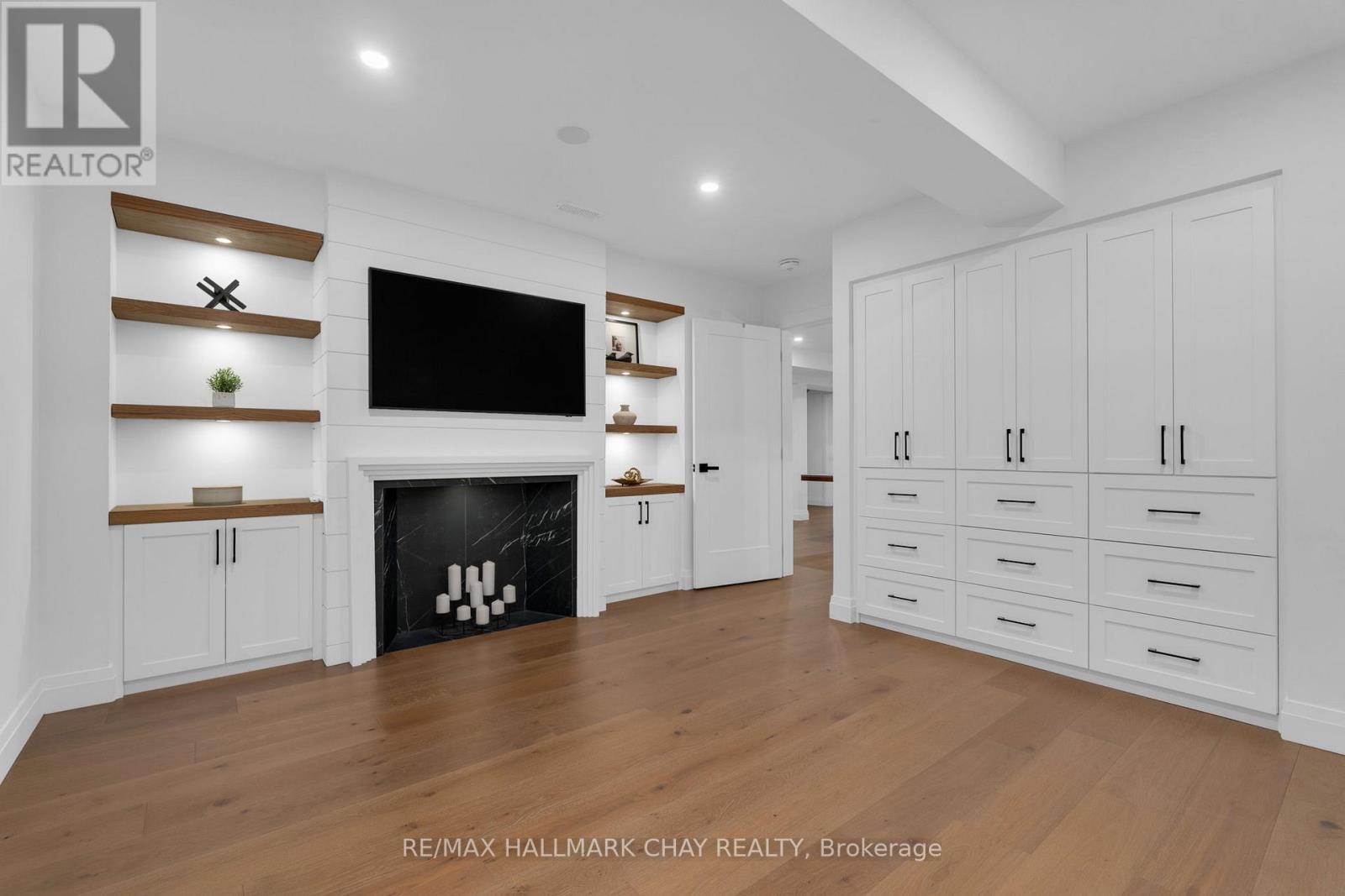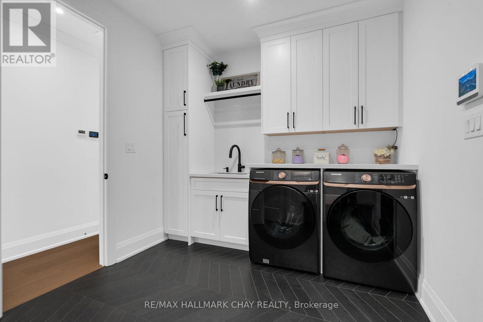 PRESENTING luxury, lifestyle, privacy, and an exquisite location-all embodied in this stunning custom executive residence in Springwater's prestigious, family centric Cameron Estates. Set on a premium half acre corner lot, this exceptional bungalow offers 5,700+ sq.ft. of finished living space and an oversized 133'x187' private backyard framed by mature cedars and one of the community's largest reclaimed greenspaces. With over $550K in recent updates/upgrades, this home delivers an elevated living experience inside & out. The main level showcases a designer Chef's kitchen with expansive prep space, oversized island with integrated beverage centre, premium Jenn Air 6 burner + griddle range, dual ovens, Dacor fridge/freezer, and walk in pantry with prep sink. Great room impresses with a striking 63" floor to ceiling gas fireplace, vaulted ceilings, and wall to wall views of the private rear yard. Additional main floor features include a dedicated home office, guest 2 pc bath, spacious laundry/mudroom, and three generous bedrooms-each with its own ensuite and walk in closet. The full, finished lower level doubles the living space and continues the home's refined neutral palette. Purpose built for relaxation and entertainment, this level features a spa inspired steam room, home gym with heated padded flooring, guest suite, custom four queen designer bunk room, rec room with linear fireplace and built ins, games room, home bar, office, soundproof gaming room, and additional 2 pc bath. Energy efficient water heated flooring runs throughout. Smart home conveniences include whole home audio (14 zones, 7 Sonos amps, 37 speakers), remote electric blinds, 7 camera security system, wall mounted TVs, and Bell Fibre internet. Car enthusiasts will appreciate the oversized 1,600+ sqft heated 5 vehicle garage, complete with epoxy floors, storage, EV ready wiring, built in audio/TV, pressure washer system, direct basement access with mud room, and rear garage door to the backyard. (id:4555)