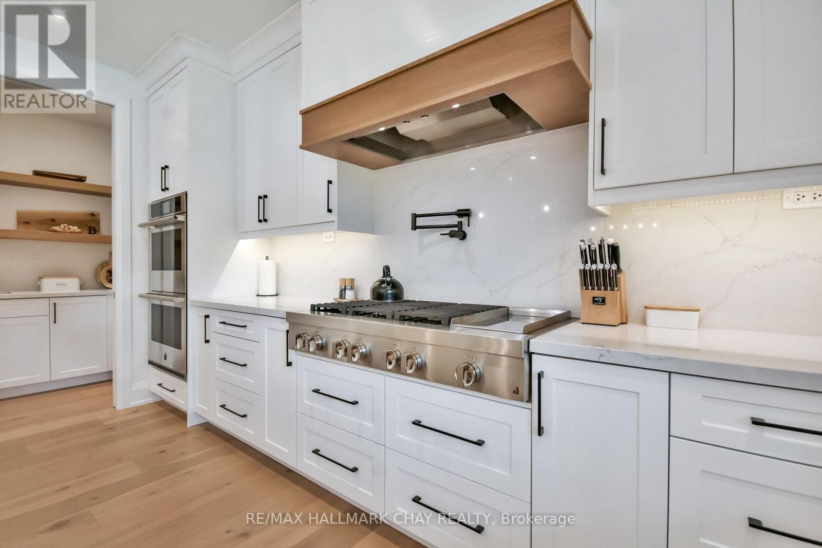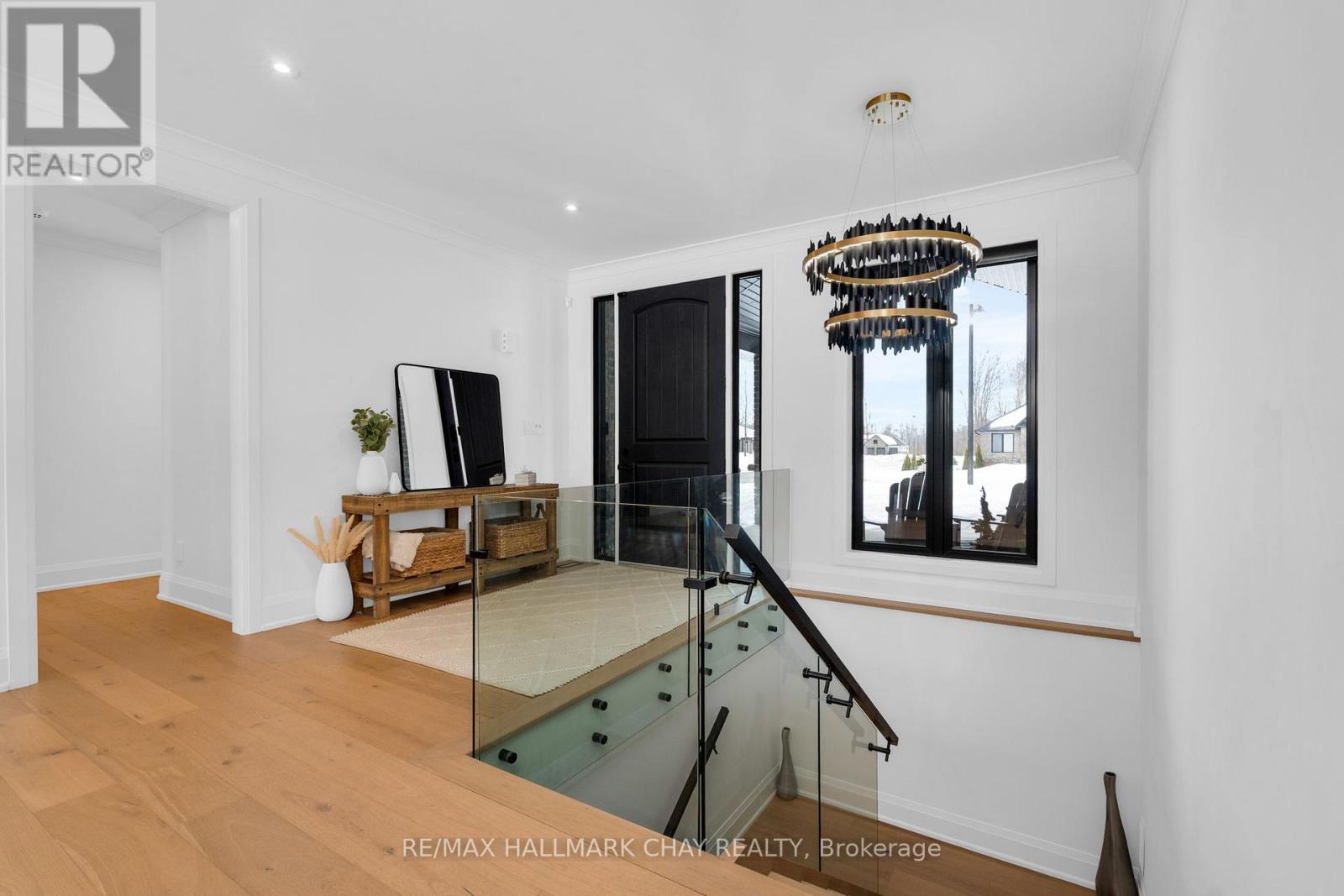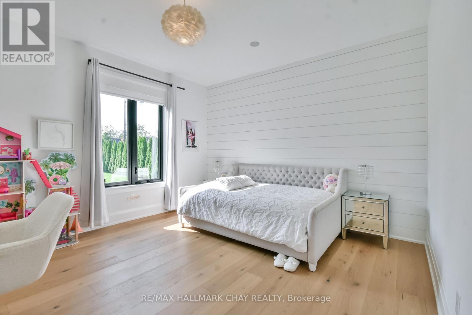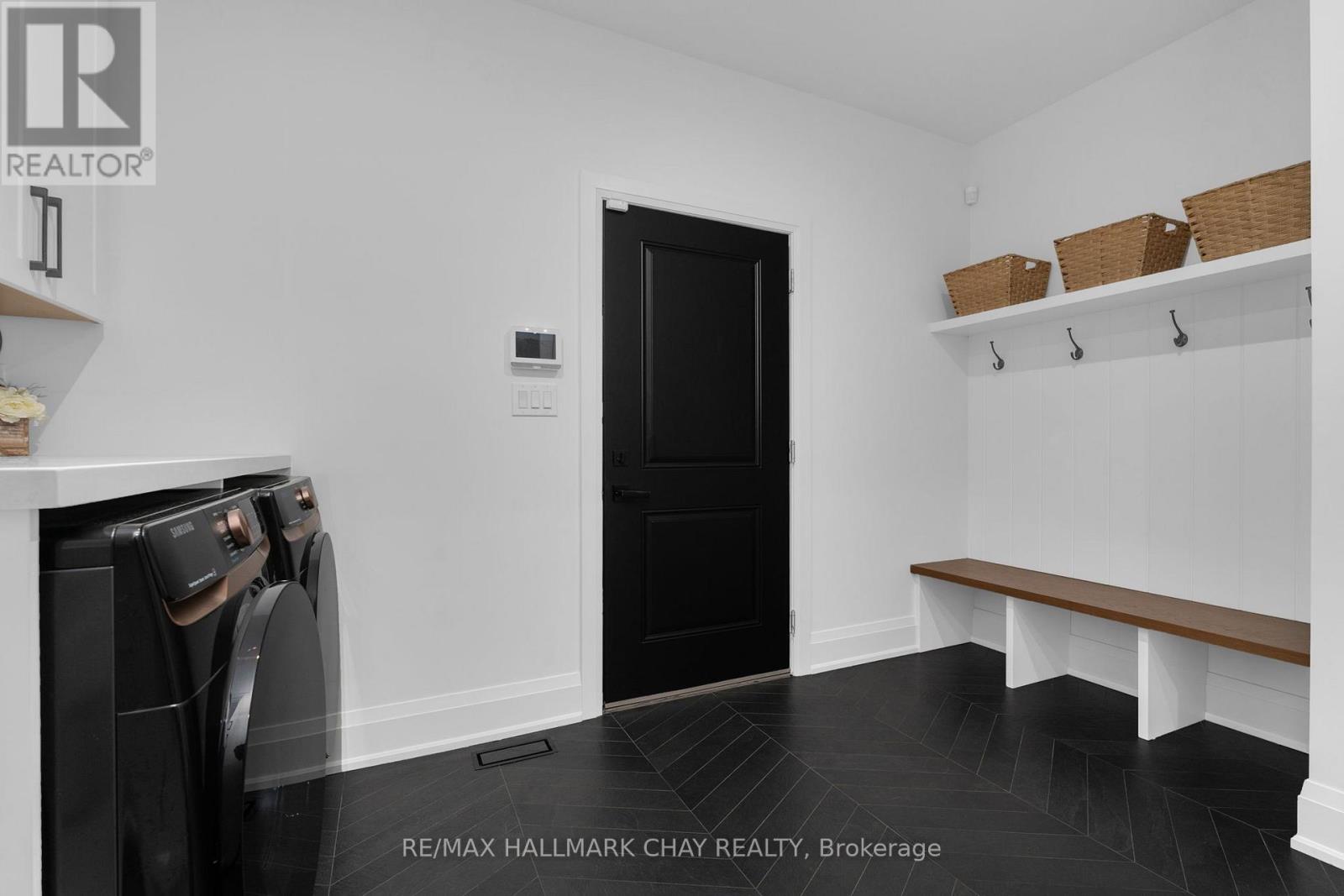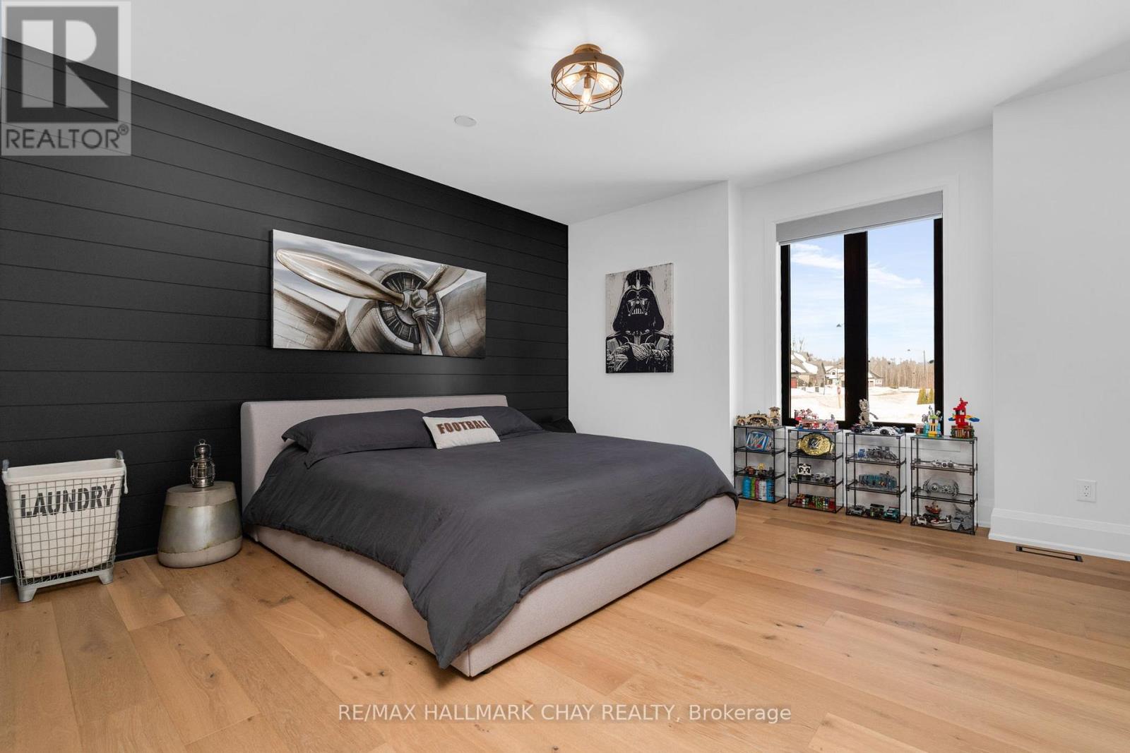 PRESENTING luxury, lifestyle, privacy, and an exquisite location-all embodied in this stunning custom executive residence in Springwater's prestigious, family centric Cameron Estates. Set on a premium half acre corner lot, this exceptional bungalow offers 5,700+ sq.ft. of finished living space and an oversized 133'x187' private backyard framed by mature cedars and one of the community's largest reclaimed greenspaces. With over $550K in recent updates/upgrades, this home delivers an elevated living experience inside & out. The main level showcases a designer Chef's kitchen with expansive prep space, oversized island with integrated beverage centre, premium Jenn Air 6 burner + griddle range, dual ovens, Dacor fridge/freezer, and walk in pantry with prep sink. Great room impresses with a striking 63" floor to ceiling gas fireplace, vaulted ceilings, and wall to wall views of the private rear yard. Additional main floor features include a dedicated home office, guest 2 pc bath, spacious laundry/mudroom, and three generous bedrooms-each with its own ensuite and walk in closet. The full, finished lower level doubles the living space and continues the home's refined neutral palette. Purpose built for relaxation and entertainment, this level features a spa inspired steam room, home gym with heated padded flooring, guest suite, custom four queen designer bunk room, rec room with linear fireplace and built ins, games room, home bar, office, soundproof gaming room, and additional 2 pc bath. Energy efficient water heated flooring runs throughout. Smart home conveniences include whole home audio (14 zones, 7 Sonos amps, 37 speakers), remote electric blinds, 7 camera security system, wall mounted TVs, and Bell Fibre internet. Car enthusiasts will appreciate the oversized 1,600+ sqft heated 5 vehicle garage, complete with epoxy floors, storage, EV ready wiring, built in audio/TV, pressure washer system, direct basement access with mud room, and rear garage door to the backyard. (id:4555)