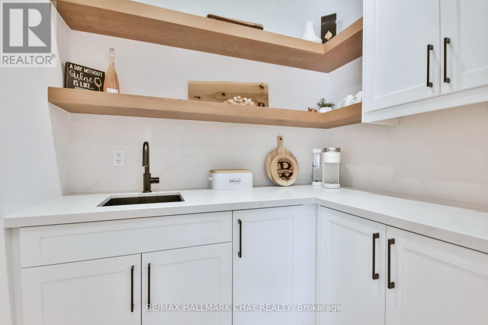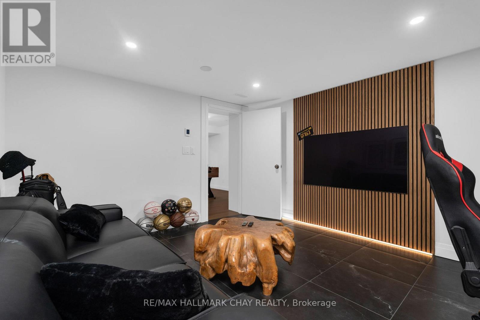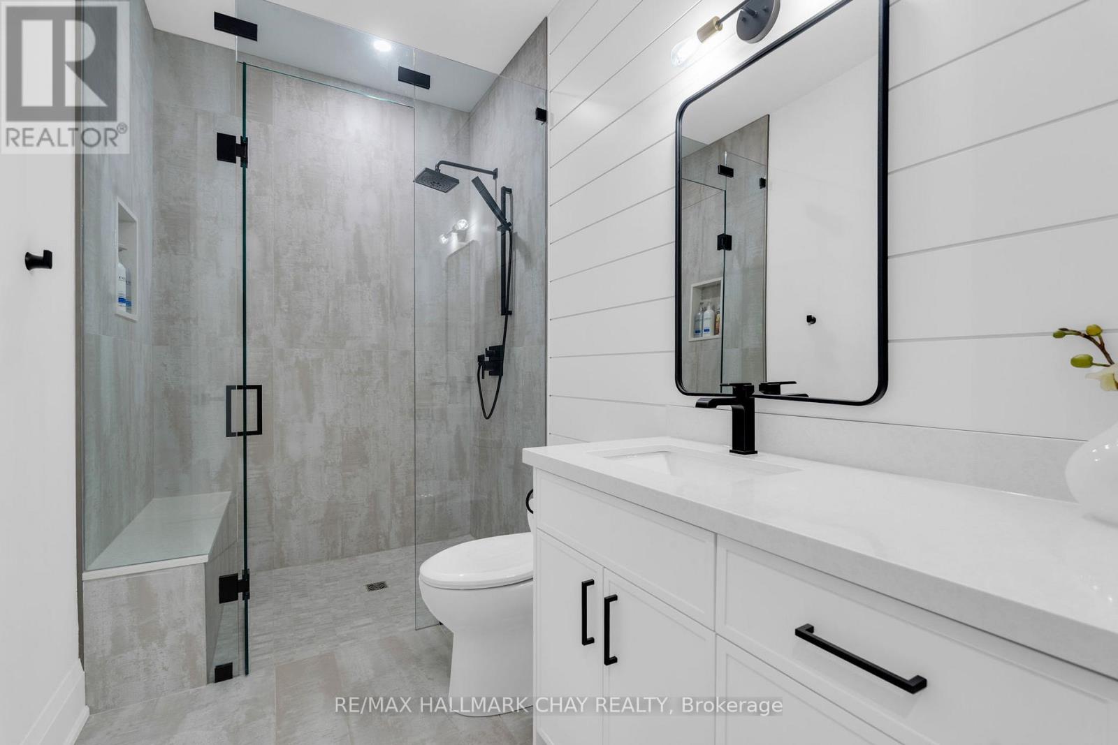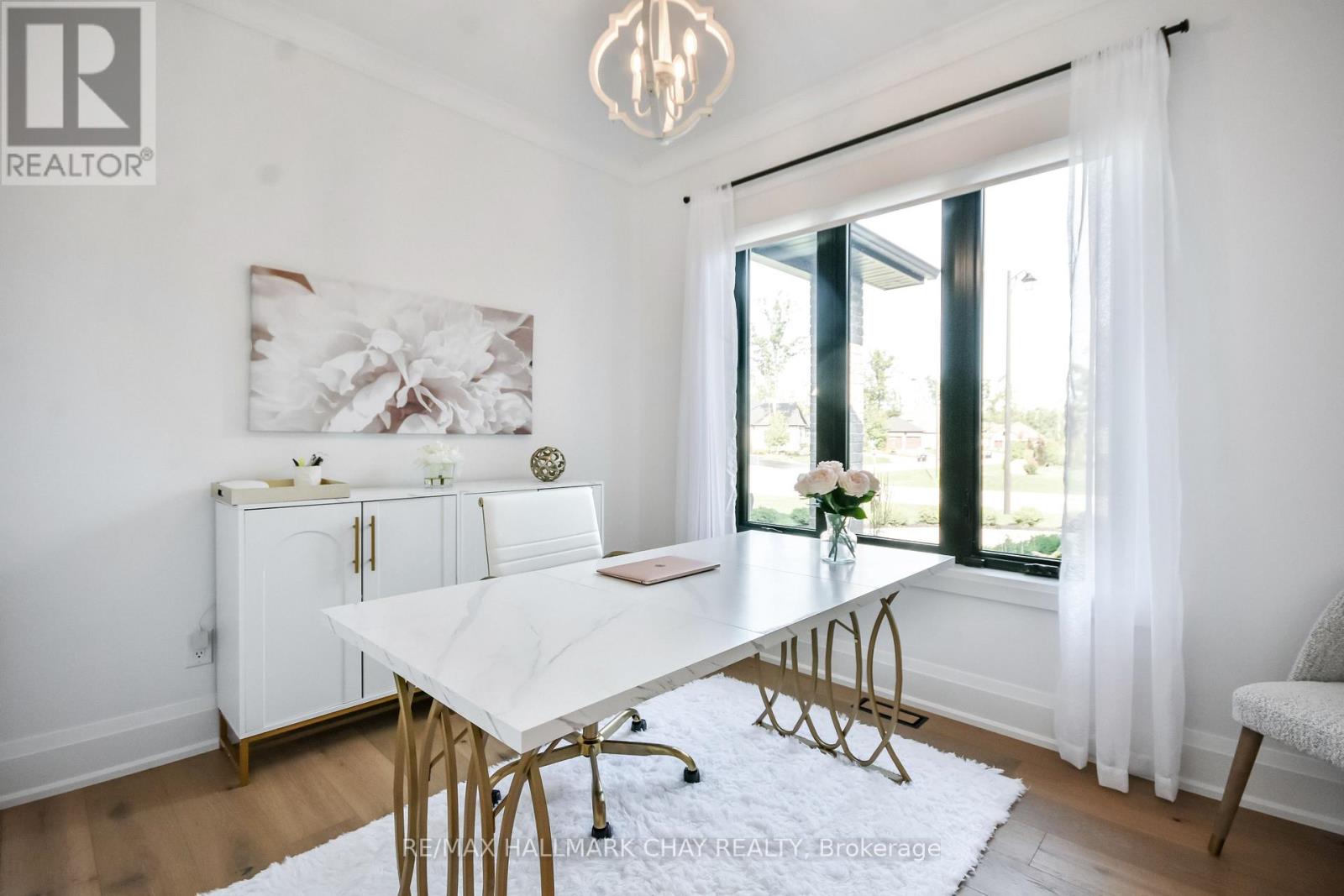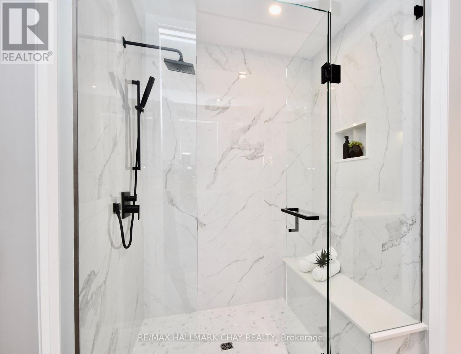 PRESENTING luxury, lifestyle, privacy, and an exquisite location-all embodied in this stunning custom executive residence in Springwater's prestigious, family centric Cameron Estates. Set on a premium half acre corner lot, this exceptional bungalow offers 5,700+ sq.ft. of finished living space and an oversized 133'x187' private backyard framed by mature cedars and one of the community's largest reclaimed greenspaces. With over $550K in recent updates/upgrades, this home delivers an elevated living experience inside & out. The main level showcases a designer Chef's kitchen with expansive prep space, oversized island with integrated beverage centre, premium Jenn Air 6 burner + griddle range, dual ovens, Dacor fridge/freezer, and walk in pantry with prep sink. Great room impresses with a striking 63" floor to ceiling gas fireplace, vaulted ceilings, and wall to wall views of the private rear yard. Additional main floor features include a dedicated home office, guest 2 pc bath, spacious laundry/mudroom, and three generous bedrooms-each with its own ensuite and walk in closet. The full, finished lower level doubles the living space and continues the home's refined neutral palette. Purpose built for relaxation and entertainment, this level features a spa inspired steam room, home gym with heated padded flooring, guest suite, custom four queen designer bunk room, rec room with linear fireplace and built ins, games room, home bar, office, soundproof gaming room, and additional 2 pc bath. Energy efficient water heated flooring runs throughout. Smart home conveniences include whole home audio (14 zones, 7 Sonos amps, 37 speakers), remote electric blinds, 7 camera security system, wall mounted TVs, and Bell Fibre internet. Car enthusiasts will appreciate the oversized 1,600+ sqft heated 5 vehicle garage, complete with epoxy floors, storage, EV ready wiring, built in audio/TV, pressure washer system, direct basement access with mud room, and rear garage door to the backyard. (id:4555)