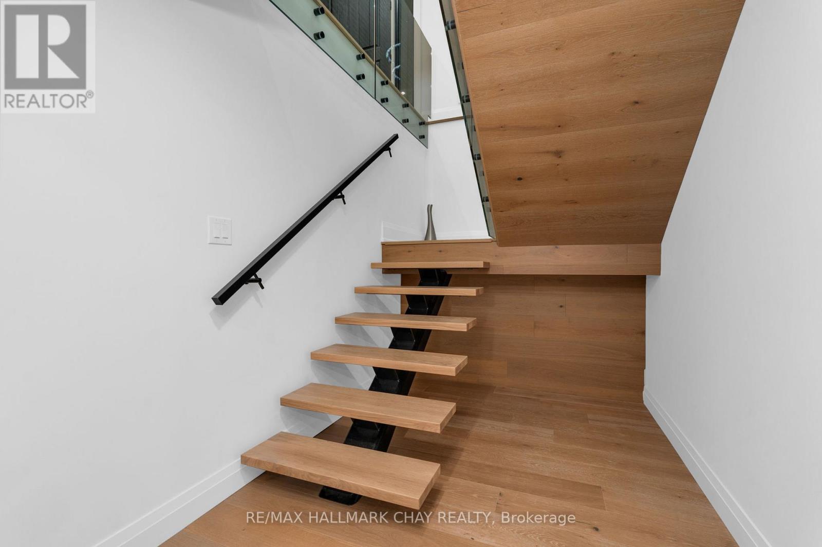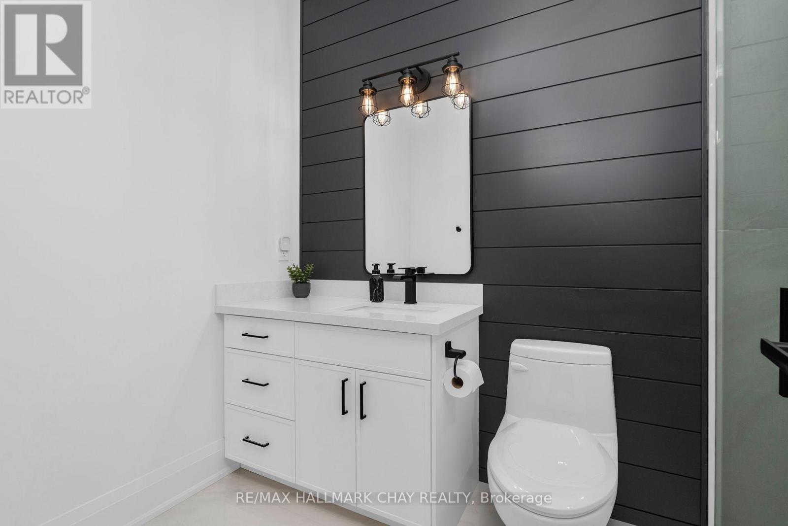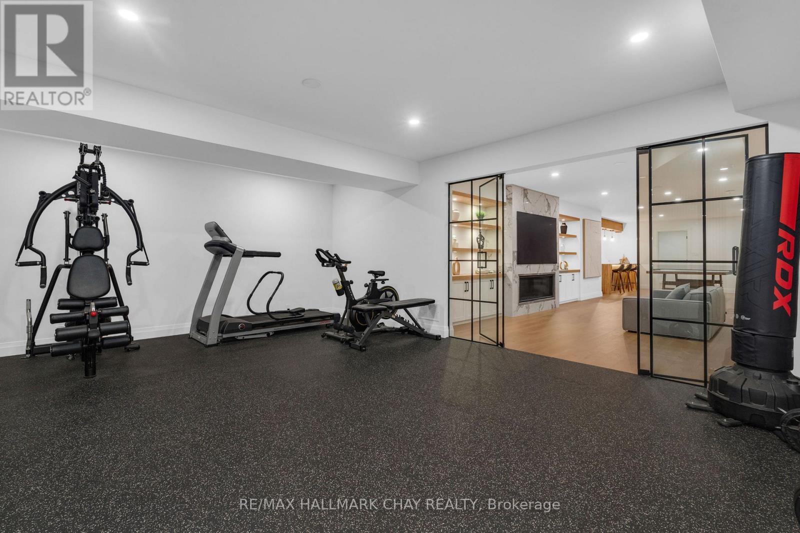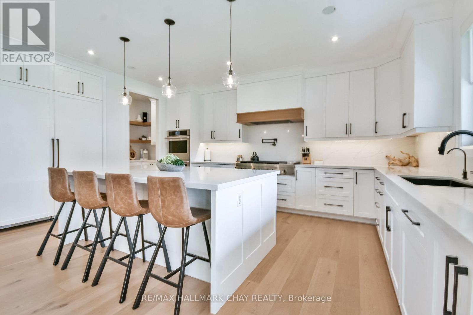 PRESENTING luxury, lifestyle, privacy, and an exquisite location-all embodied in this stunning custom executive residence in Springwater's prestigious, family centric Cameron Estates. Set on a premium half acre corner lot, this exceptional bungalow offers 5,700+ sq.ft. of finished living space and an oversized 133'x187' private backyard framed by mature cedars and one of the community's largest reclaimed greenspaces. With over $550K in recent updates/upgrades, this home delivers an elevated living experience inside & out. The main level showcases a designer Chef's kitchen with expansive prep space, oversized island with integrated beverage centre, premium Jenn Air 6 burner + griddle range, dual ovens, Dacor fridge/freezer, and walk in pantry with prep sink. Great room impresses with a striking 63" floor to ceiling gas fireplace, vaulted ceilings, and wall to wall views of the private rear yard. Additional main floor features include a dedicated home office, guest 2 pc bath, spacious laundry/mudroom, and three generous bedrooms-each with its own ensuite and walk in closet. The full, finished lower level doubles the living space and continues the home's refined neutral palette. Purpose built for relaxation and entertainment, this level features a spa inspired steam room, home gym with heated padded flooring, guest suite, custom four queen designer bunk room, rec room with linear fireplace and built ins, games room, home bar, office, soundproof gaming room, and additional 2 pc bath. Energy efficient water heated flooring runs throughout. Smart home conveniences include whole home audio (14 zones, 7 Sonos amps, 37 speakers), remote electric blinds, 7 camera security system, wall mounted TVs, and Bell Fibre internet. Car enthusiasts will appreciate the oversized 1,600+ sqft heated 5 vehicle garage, complete with epoxy floors, storage, EV ready wiring, built in audio/TV, pressure washer system, direct basement access with mud room, and rear garage door to the backyard. (id:4555)