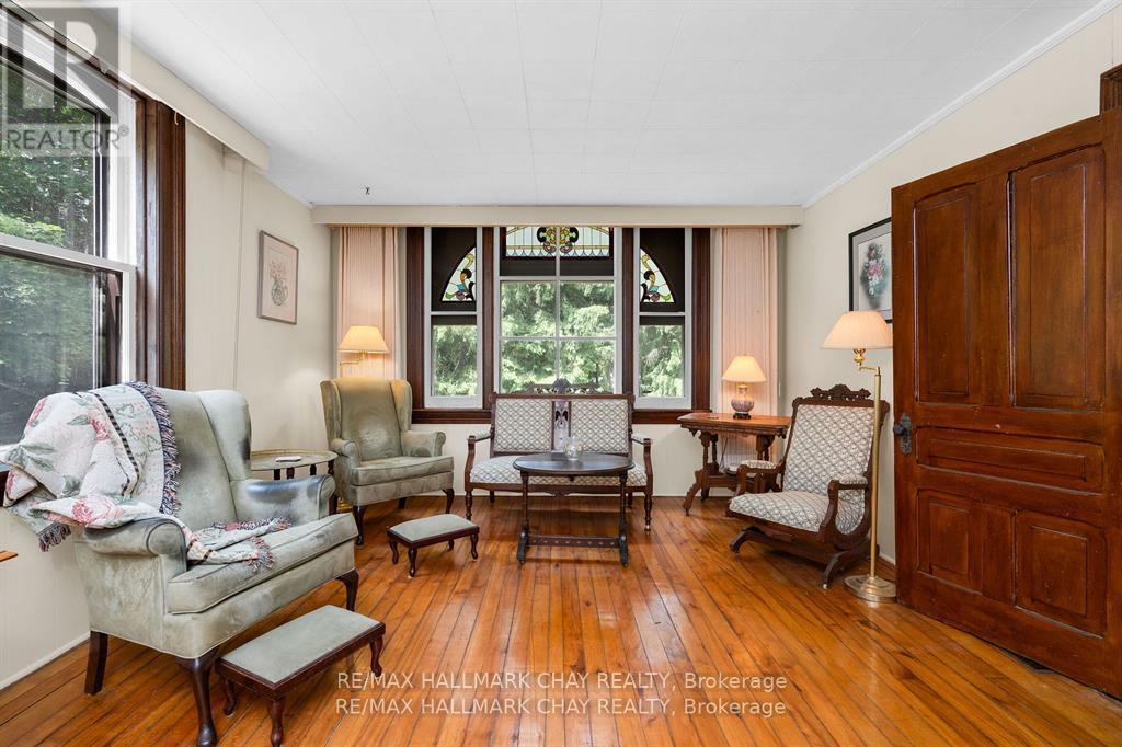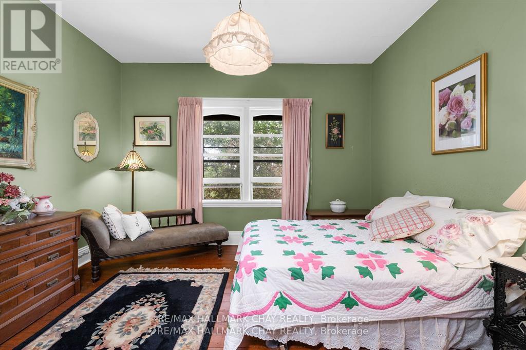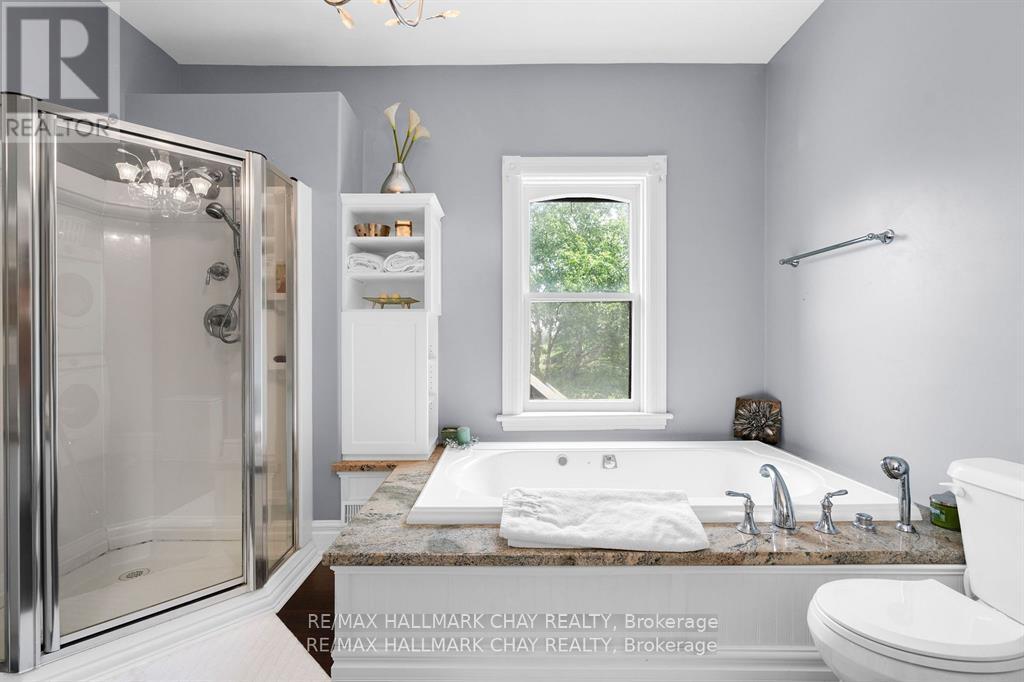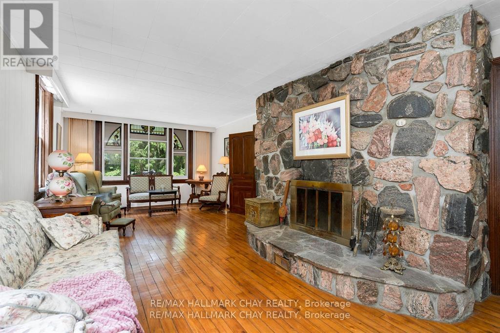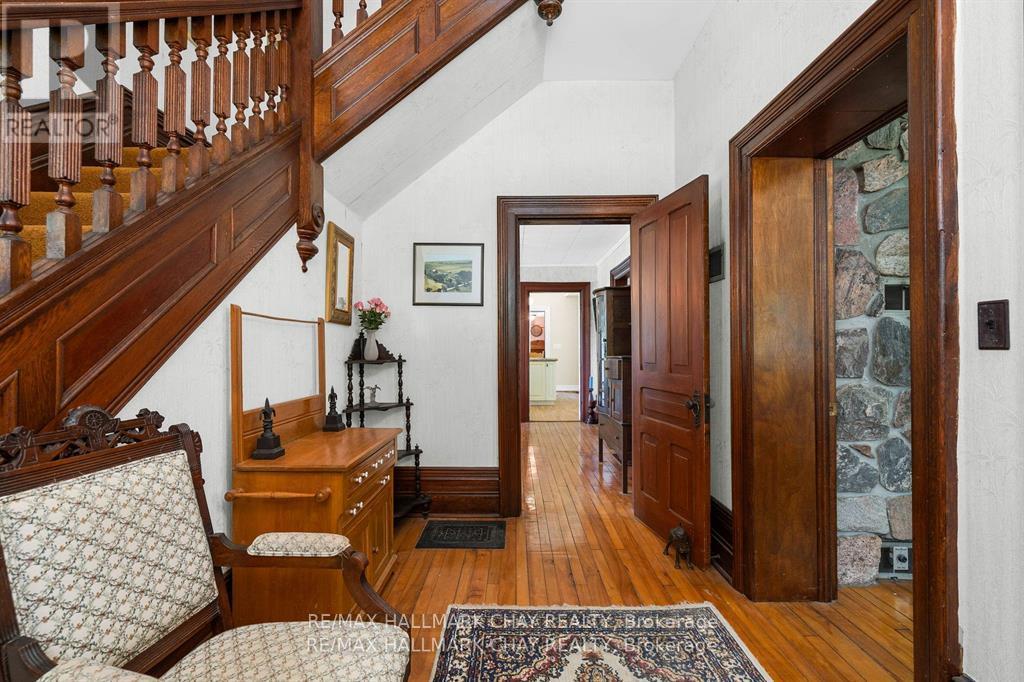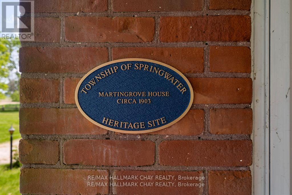 Welcome to Martingrove! One of springwaters designated Heritage homes. The handcrafted details are stunning, this home will call you... Built in 1906 on a private 2.57 acre property surrounded by mature trees and backing and siding onto a farm field. Sound of birds and tanquility. Original Wavy stained glass windows and stained glass transom windows with Fleur-de-lis above doorways. Hardwood flooring on main and upper. Solid field stone wood fireplace surround. Two bathrooms 3 piece on main and very large spa size bathroom on upper. Updated electrical, metal roof. The hand crafted railing and balusters are breath taking.Back staircase from kitchen with a gorgeous amber glass fixture and fleur de lis transom window. Wrap around porch for serene outdoor seating. Hot Tub off the back deck. Solar panel contract that draws income. This home is charming and grand. (id:4555)