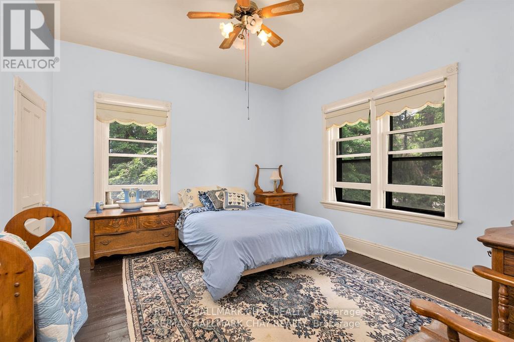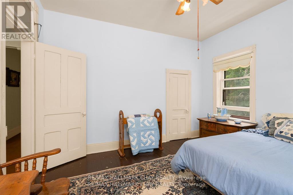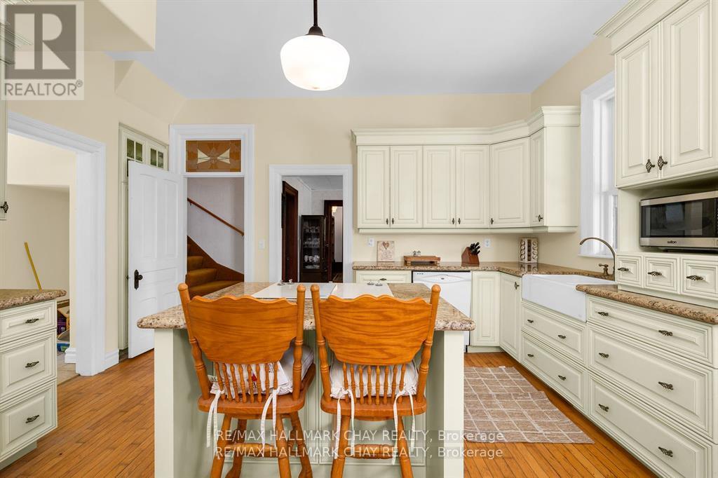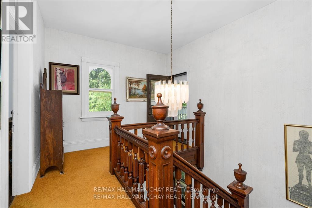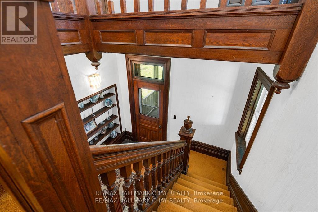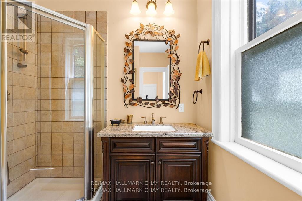 Welcome to Martingrove! One of springwaters designated Heritage homes. The handcrafted details are stunning, this home will call you... Built in 1906 on a private 2.57 acre property surrounded by mature trees and backing and siding onto a farm field. Sound of birds and tanquility. Original Wavy stained glass windows and stained glass transom windows with Fleur-de-lis above doorways. Hardwood flooring on main and upper. Solid field stone wood fireplace surround. Two bathrooms 3 piece on main and very large spa size bathroom on upper. Updated electrical, metal roof. The hand crafted railing and balusters are breath taking.Back staircase from kitchen with a gorgeous amber glass fixture and fleur de lis transom window. Wrap around porch for serene outdoor seating. Hot Tub off the back deck. Solar panel contract that draws income. This home is charming and grand. (id:4555)