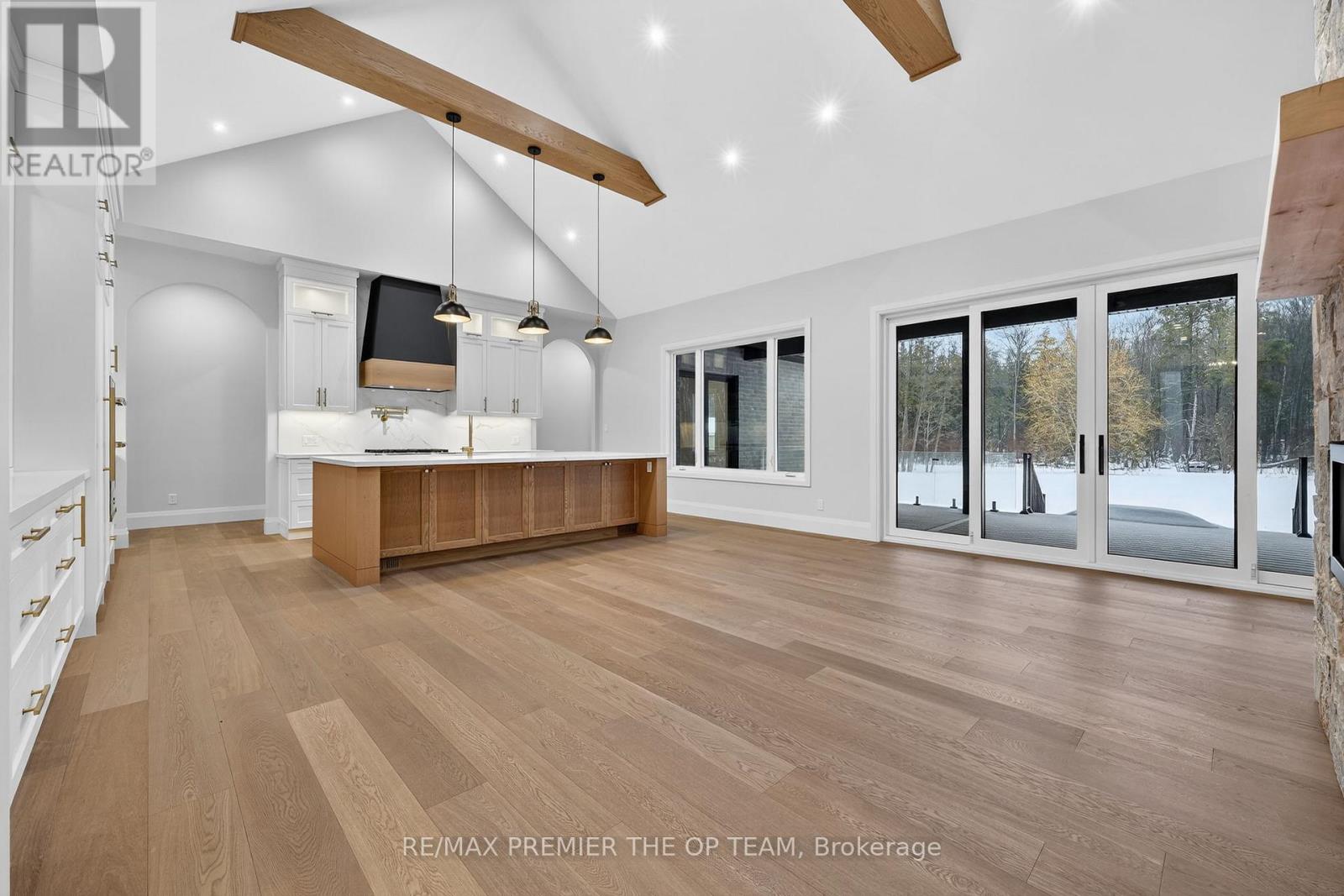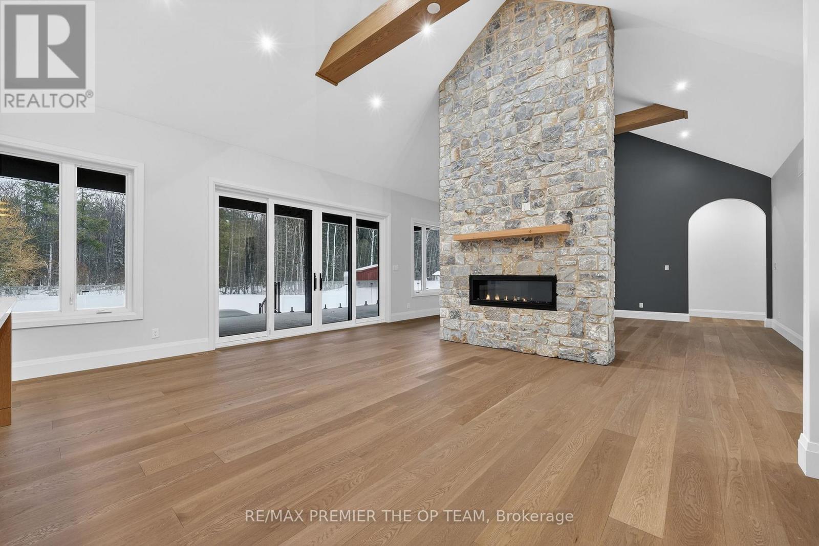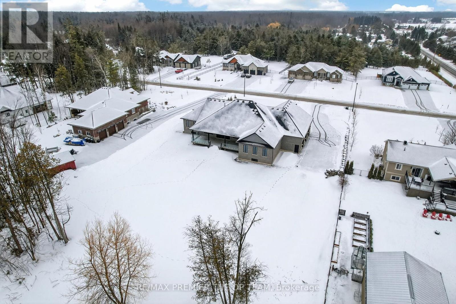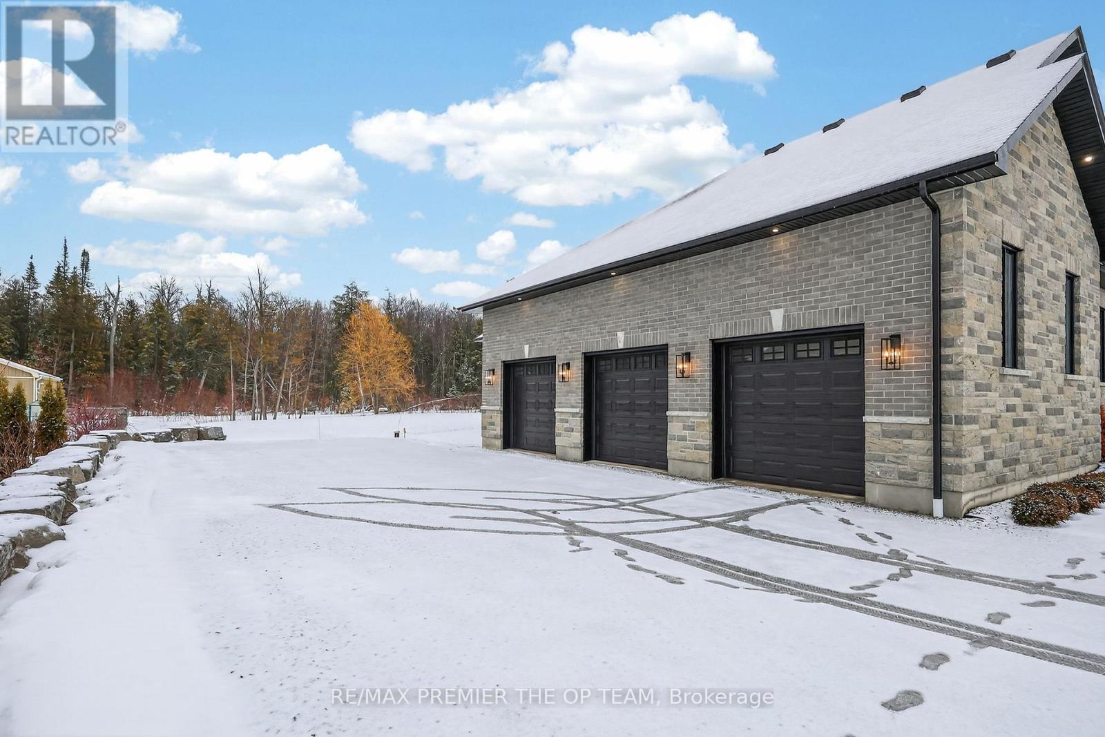 New 3,200 sq. ft. custom stone and brick bungalow on over an acre, built by a quality builder and backed by Tarion warranty. This stunning home features wide plank hardwood floors, high-end light fixtures, JennAir appliances, and Riobel bathroom fixtures throughout. The open-concept kitchen and living area is highlighted by a massive island, butler's pantry with espresso bar, and a dramatic floor-to-ceiling double-sided stone fireplace, with walkout to a covered back deck overlooking a pool-sized yard and forest backdrop. The principal suite offers a feature wall, walk-through custom closet, and spa-inspired ensuite. Separate bedroom wing with 3 bedrooms and 2 full baths. Main floor laundry and mudroom off the impressive 40' x 30' garage with oversized doors, high ceilings for car lifts, and basement walk-up. Basement features 9 ft ceilings and rough-in for additional bath. Landscaping package includes exposed stone concrete walkway, entrance garden with two trees, sodded front yard, and hydro-seeded backyard. Excellent commuter location with easy access to Barrie and Hwy 400. (id:4555)