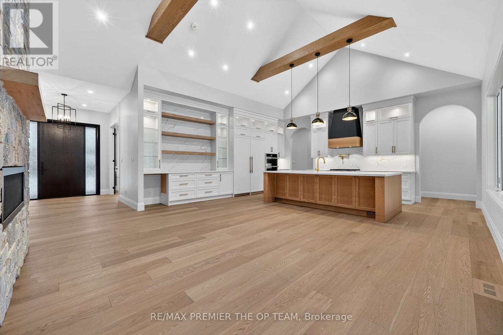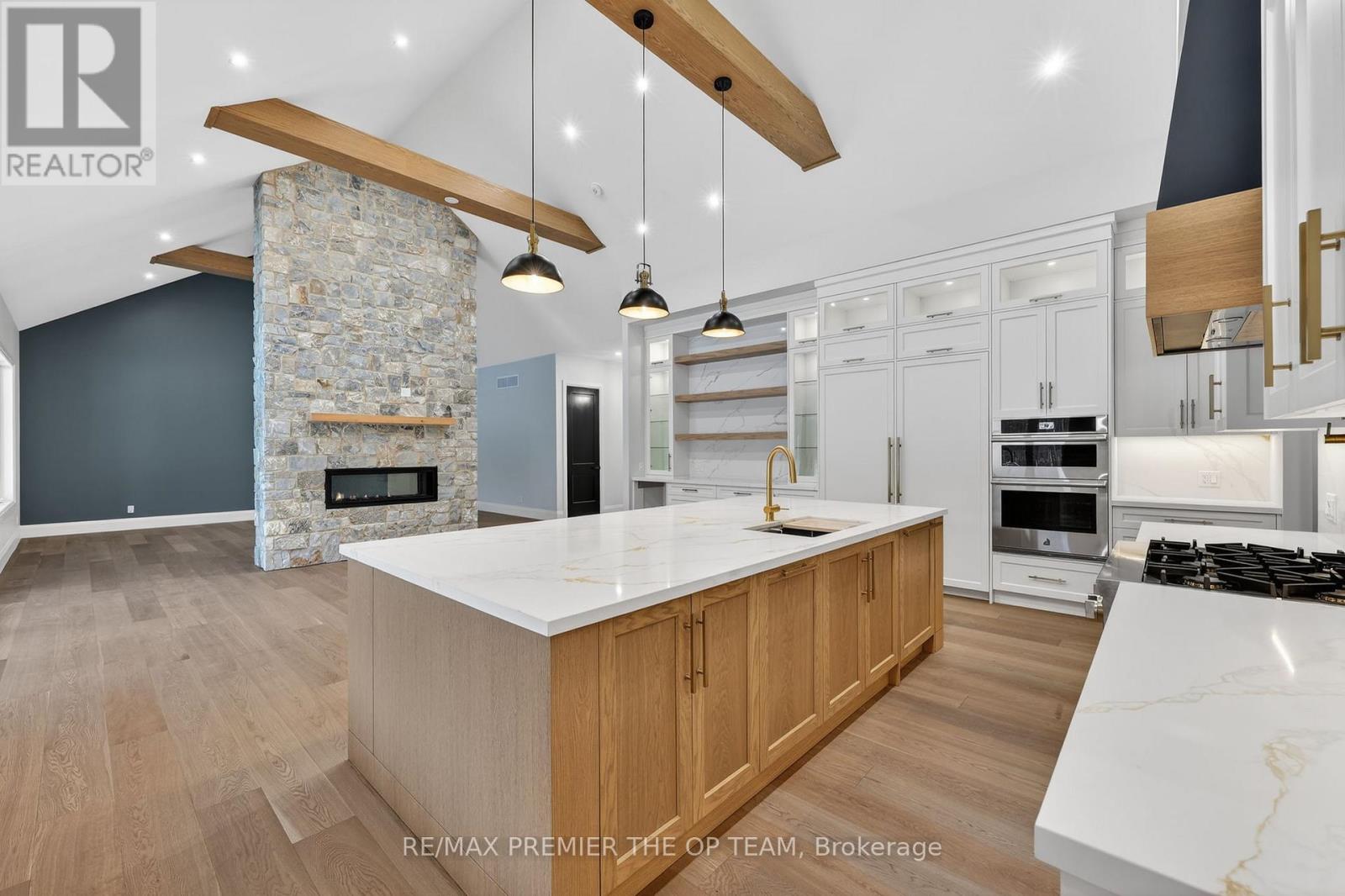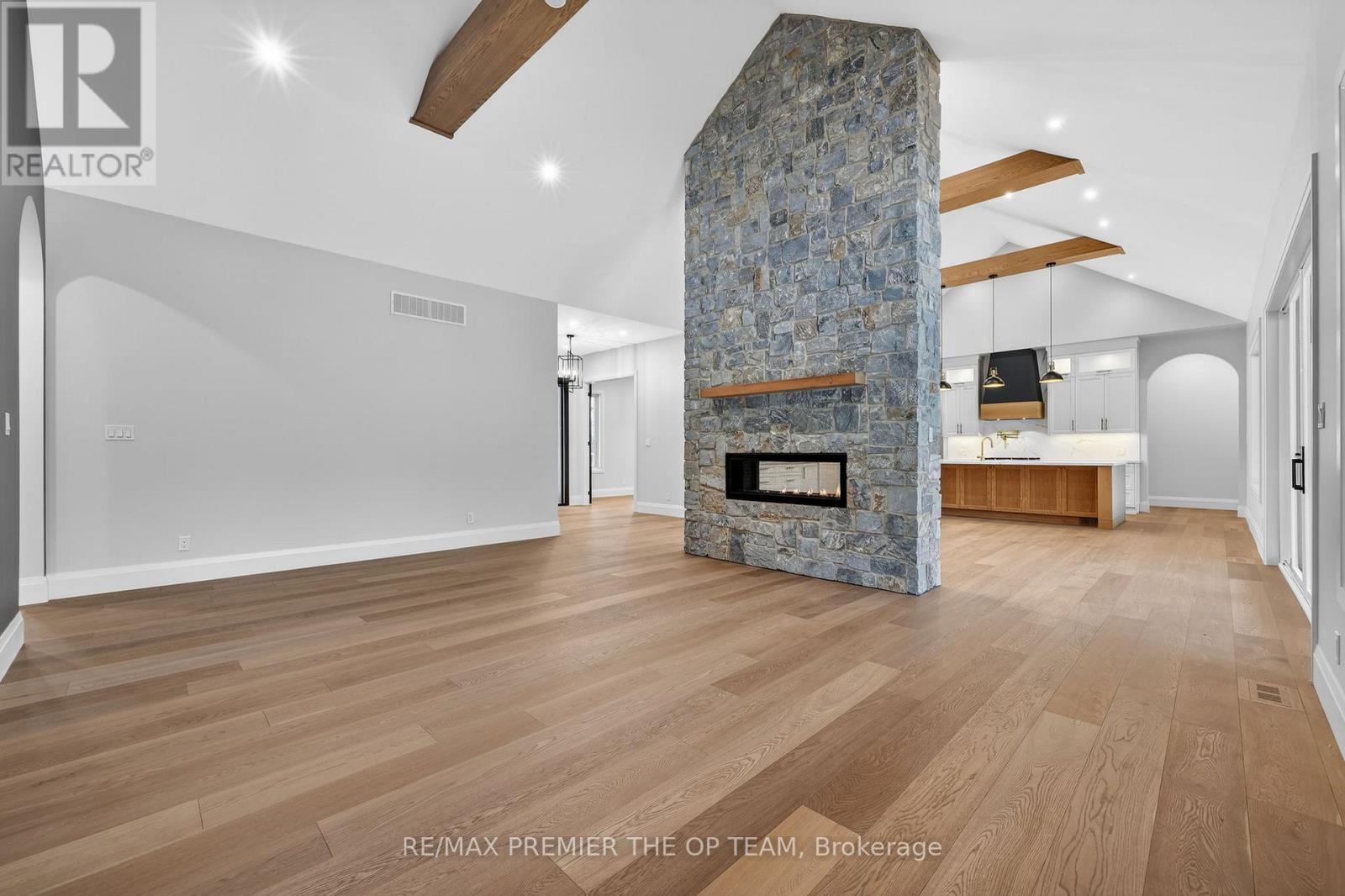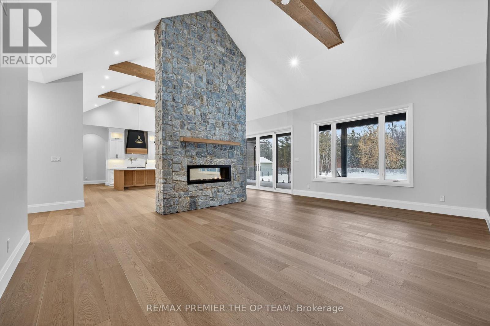 New 3,200 sq. ft. custom stone and brick bungalow on over an acre, built by a quality builder and backed by Tarion warranty. This stunning home features wide plank hardwood floors, high-end light fixtures, JennAir appliances, and Riobel bathroom fixtures throughout. The open-concept kitchen and living area is highlighted by a massive island, butler's pantry with espresso bar, and a dramatic floor-to-ceiling double-sided stone fireplace, with walkout to a covered back deck overlooking a pool-sized yard and forest backdrop. The principal suite offers a feature wall, walk-through custom closet, and spa-inspired ensuite. Separate bedroom wing with 3 bedrooms and 2 full baths. Main floor laundry and mudroom off the impressive 40' x 30' garage with oversized doors, high ceilings for car lifts, and basement walk-up. Basement features 9 ft ceilings and rough-in for additional bath. Landscaping package includes exposed stone concrete walkway, entrance garden with two trees, sodded front yard, and hydro-seeded backyard. Excellent commuter location with easy access to Barrie and Hwy 400. (id:4555)