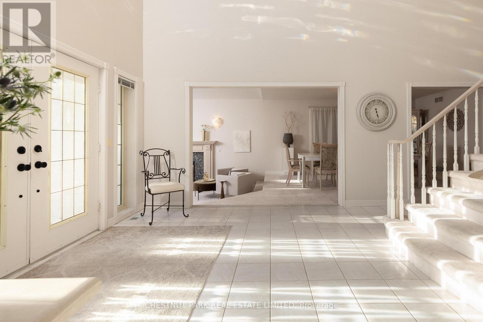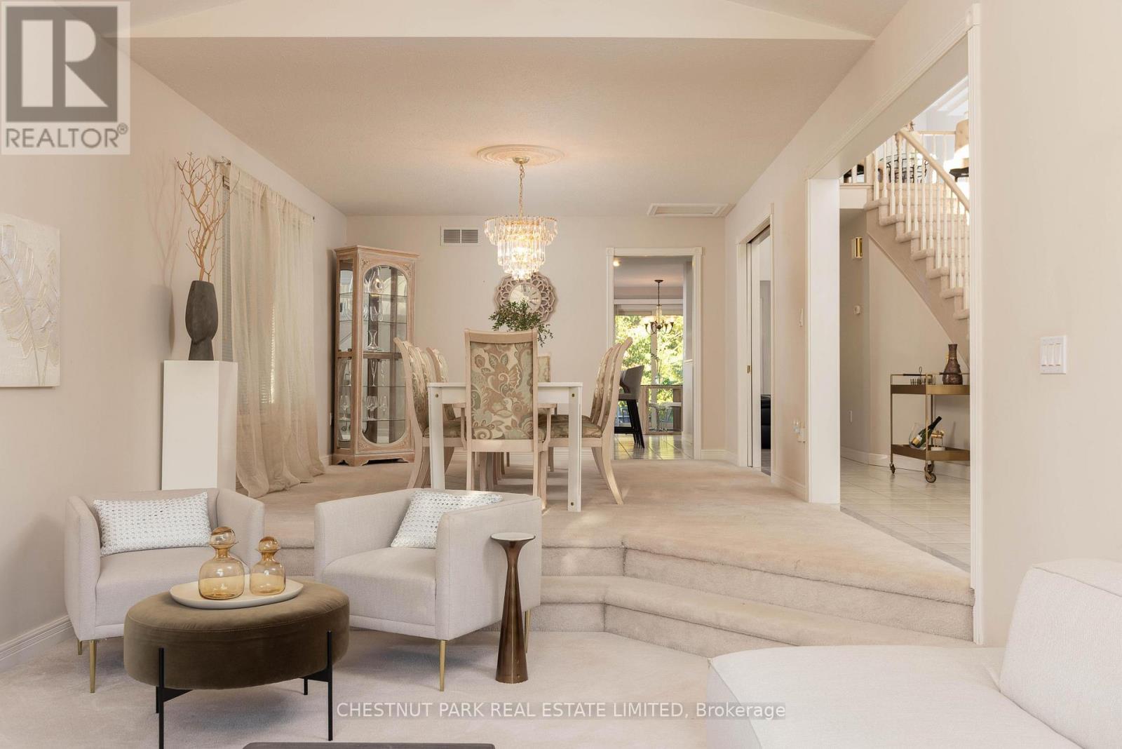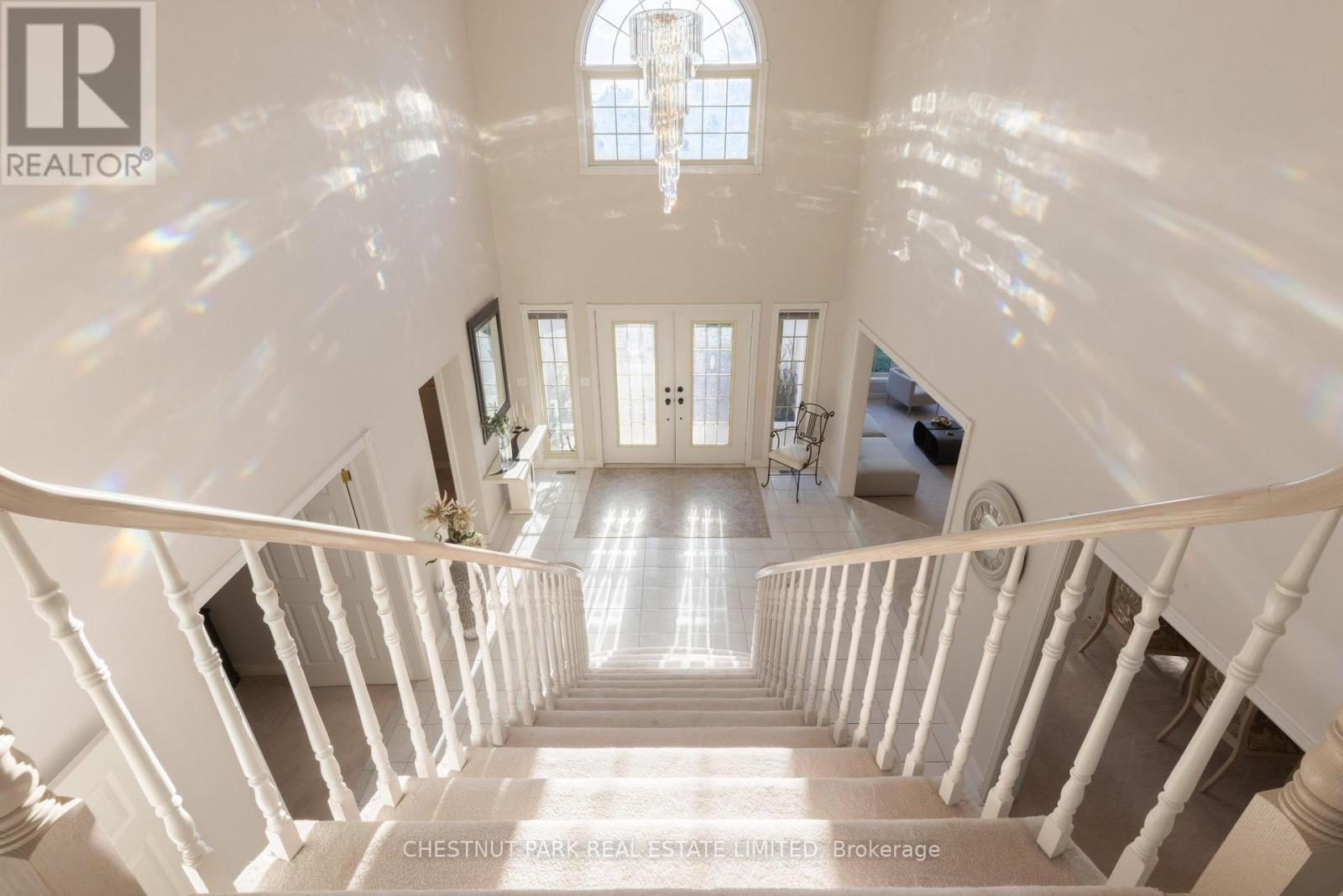 A Rare Ravine lot, custom home in Erion Estates, surrounded by mature trees. This bungaloft feels private, peaceful, and grand all at once. From the moment you walk through the front door, the home opens up with 2-story ceilings, large windows, and an abundance of natural light. Designed for easy main-floor living, the layout flows effortlessly with everything you need on one level. The spacious kitchen sits at the back of the home overlooking the ravine, offering a large island and a dining nook surrounded by views of your oasis yard. The family room feels open and inviting with double-height windows framing the treetops with a gas fireplace and has direct access to backyard patio through the siding door. The main floor primary suite is a true retreat featuring two walk-in closets and a generous ensuite with double sinks, a jetted tub, and shower. You also find a formal dining area, a bright living room with a wood-burning fireplace, main floor laundry with access to the double-wide heated garage, and a powder room for guests. Upstairs overlooks both the foyer and family room, along with two additional bedrooms and a full bathroom. The basement is partly finished with just under 8-foot ceilings. There are two additional bedrooms in the basement with walk-in closets. Rough-in plumbing is also in place in the basement if you wish to add an additional washroom or kitchen to create separate living accommodations. The backyard oasis is what truly sets this property apart with the lush, private ravine setting and established gardens with an irrigation system to keep it looking its best year-round. Homes like this, combining a ravine lot, timeless design, and a main-floor lifestyle, rarely come to market in Erion Estates. (id:4555)