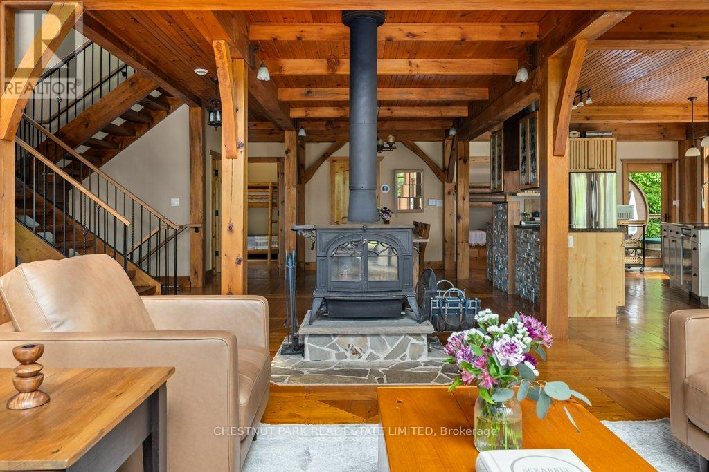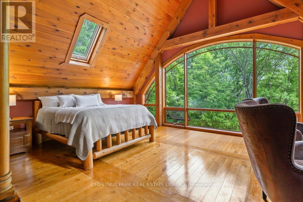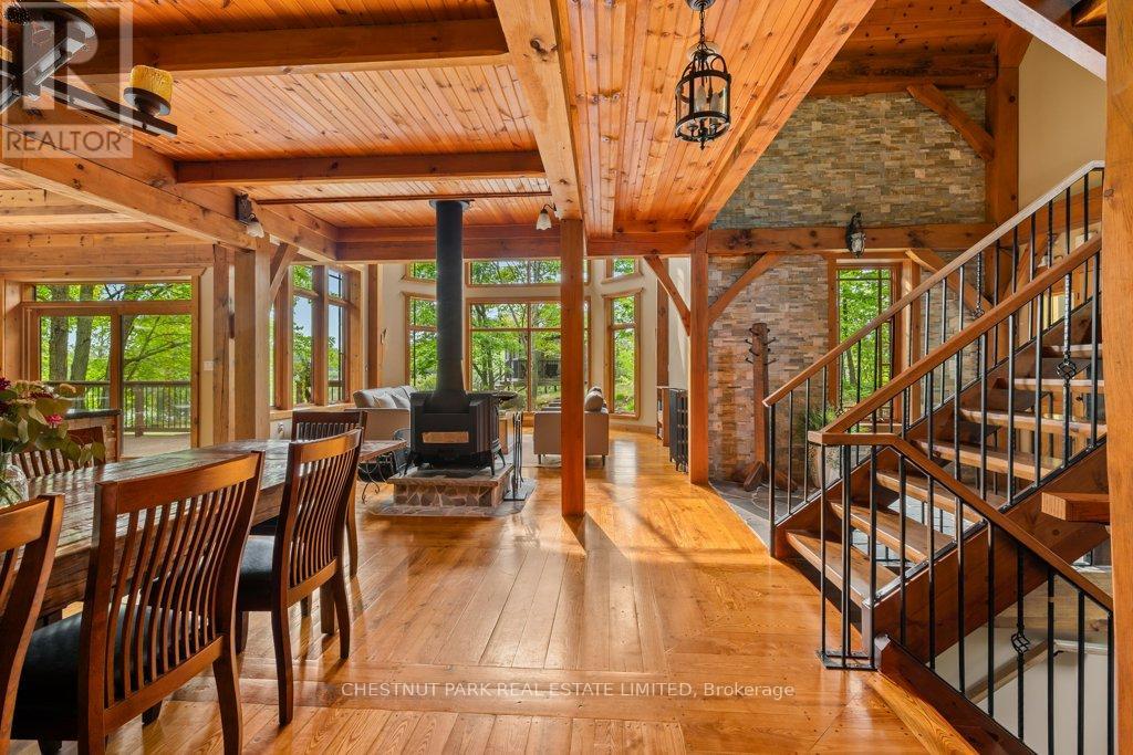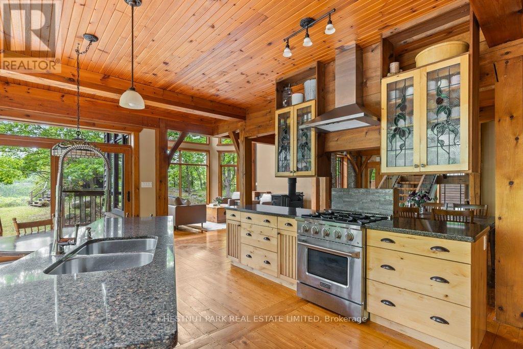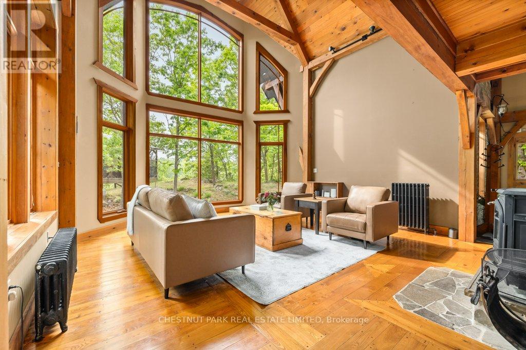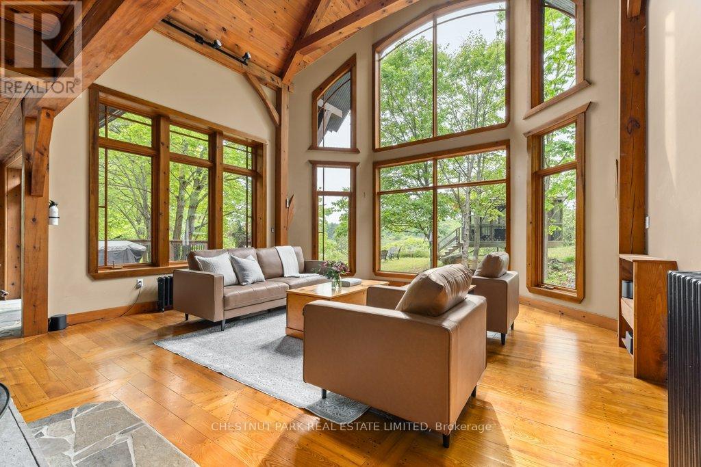 Welcome home to 488 Gull Creek Lane! A stunning timber frame home that features over 4,000 sq ft of living space, 5 bedrooms, 3 bathrooms on the crystal-clear waters of Sheffield Long Lake, just north of Tamworth. Expertly crafted with true timber joinery and no nails, this one-of-a-kind architectural gem features soaring cathedral ceilings, massive floor-to-ceiling windows, beautiful hardwood floors, and an open-concept layout filled with natural light. The chef's kitchen offers granite countertops, stainless steel appliances, and abundant workspace, flowing seamlessly to a wrap-around deck complete with sauna, hot tub, cold plunge, BBQ, and plenty of seating. The walkout basement includes a large rec room, two additional bedrooms, and a flex space ideal for a gym or studio. Enjoy two acres of property with over 350 feet of pristine private waterfront with a large dock and swim platform, plus a charming bunkie/art studio and a screened, covered patio perfect for entertaining. Completely off-grid, this property boasts a $100K solar and battery system, radiant in-floor heating, a drilled well, and a metal roof for year-round comfort. Located just 2h 45m from Toronto, 2h from Ottawa, and 45 minutes from Kingston, this is lakeside living at its finest! (id:4555)