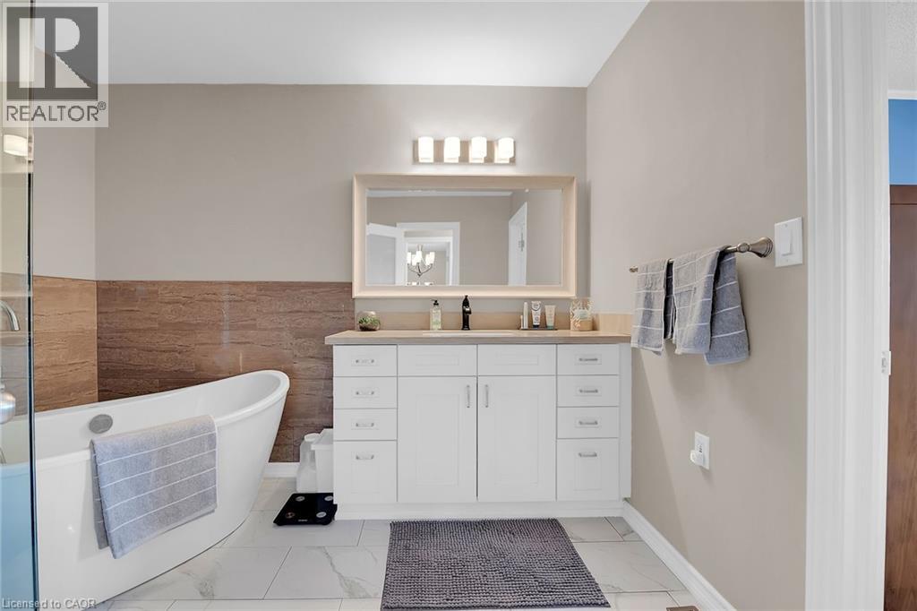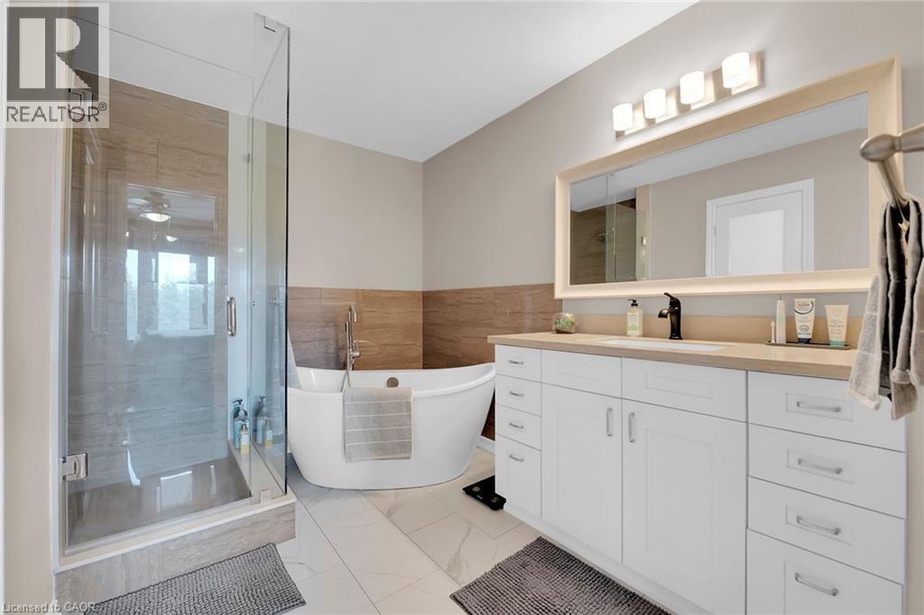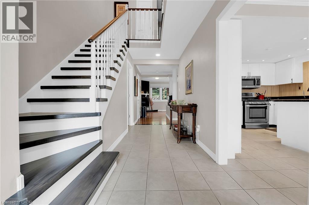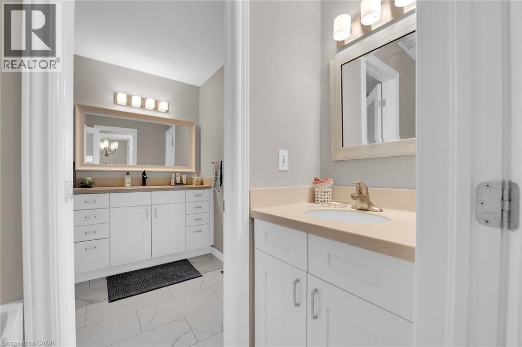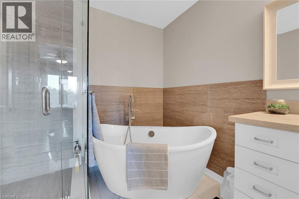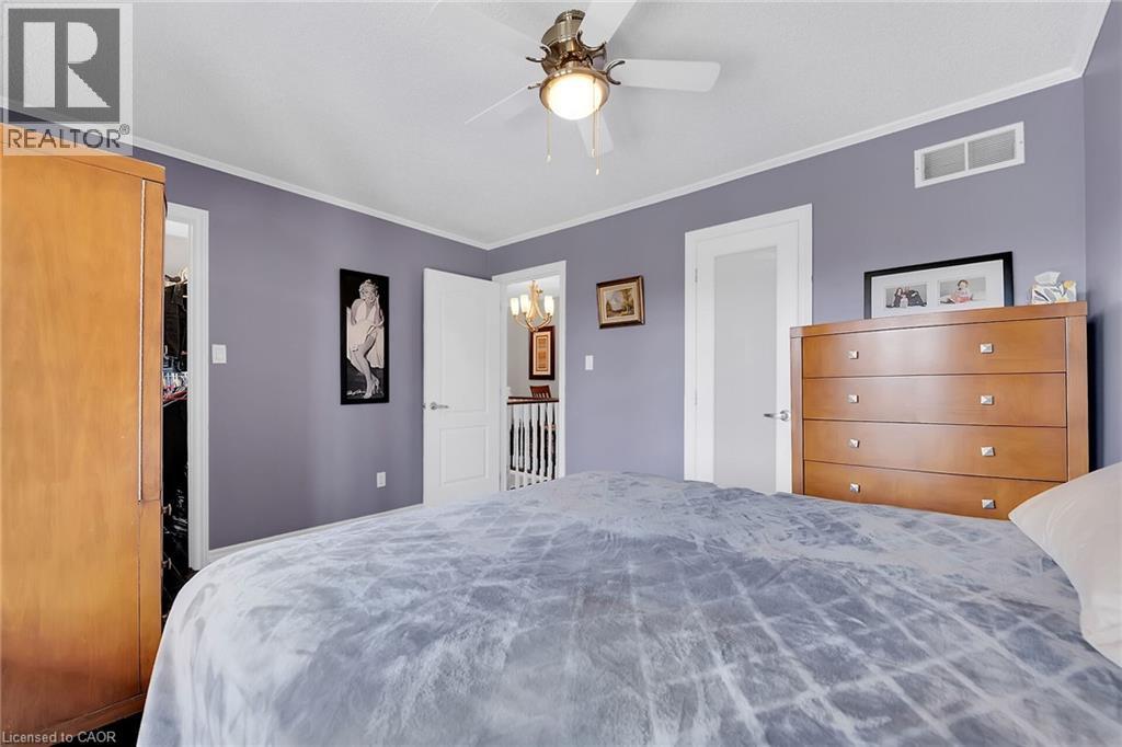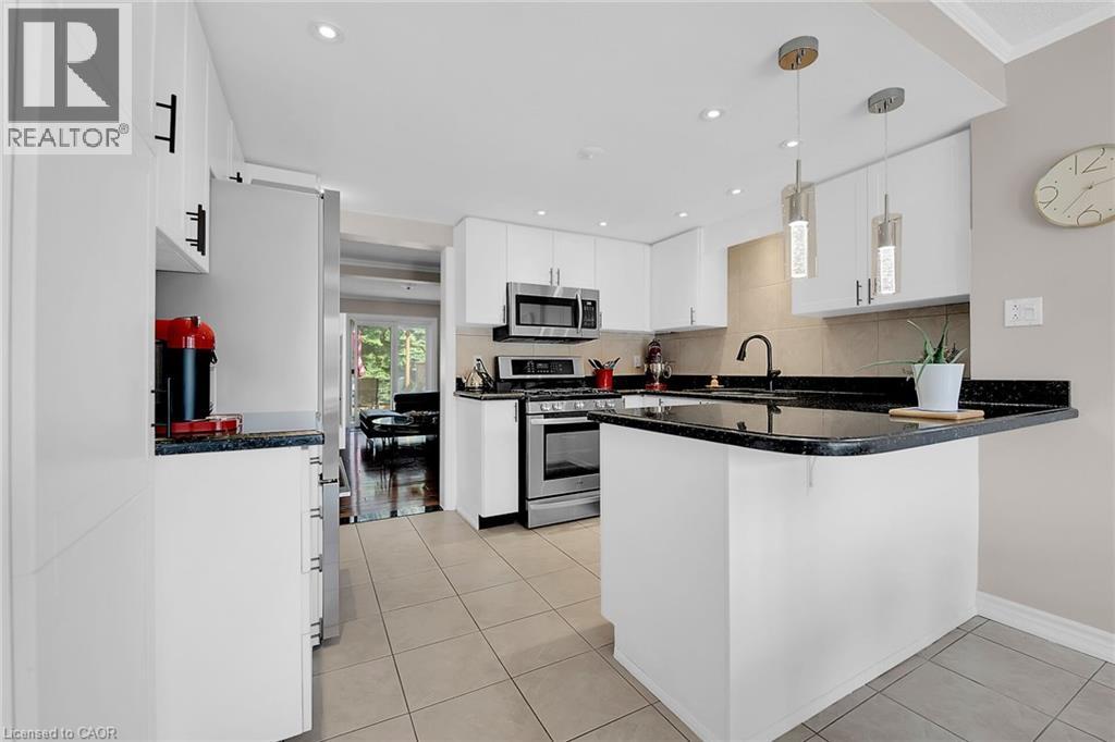 Beautiful three bedroom, three bathroom, with double garage Freehold Townhouse, just steps to the lake. Elegant features throughout, including crown molding, and a Juliette balcony, Eat-in kitchen, granite, counter tops, breakfast bar, custom cabinetry, pots and pans drawers, stainless steel appliances, ceramic tile floors and pot lights. Living room is graced with decorative columns, gas stove, gas fireplace, hardwood floors and walkout to spacious backyard oasis that includes patio with bbq area and mature trees. Back inside, the primary bedroom features a generous walk-in closet and ensuite privileges to the five piece bathroom. The fully finished lower level offers three piece bathroom, laundry area and laminate flooring. Double car garage with automatic garage door and inside entry, One minute to QEW, close to Costco and all amenities. (id:4555)