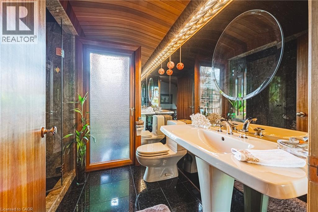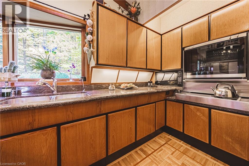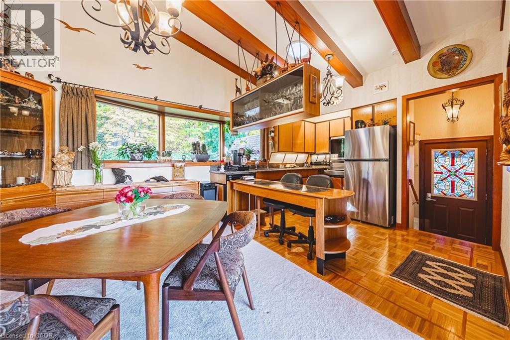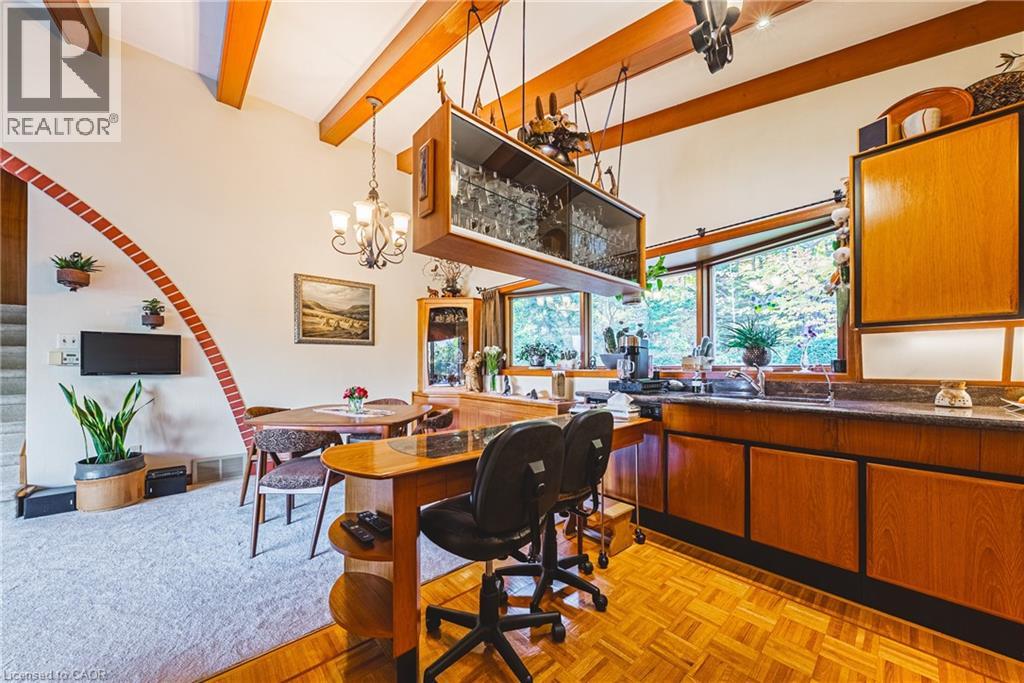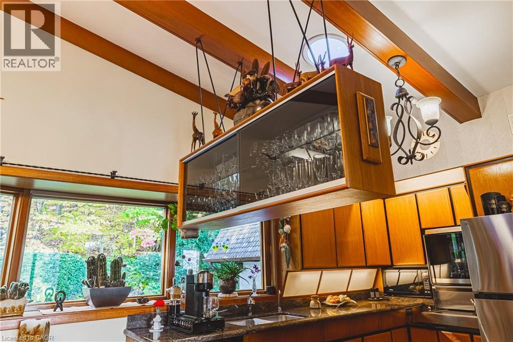 A true artists home rich in craftsmanship, history and heart. Perfectly positioned along the Niagara Escarpment with direct access to the Bruce Trail, this custom built home, one owner sprawling side split is a rare find. Set on a 70 ft x 244 lot, it has been celebrated with 24 Trillium Awards & 6 Prestigious Pink Awards for its exceptional landscaping & design, a testament to the pride of ownership found throughout. Enjoy unobstructed views of Lake Ontario & the Toronto skyline framed by mature trees & vibrant perennials, featuring a pond filled with golden orfes, goldfish, and blooming water lilies. Across the street a community park with playground & basketball court adds to the settings appeal, while GO Transit & QEW access are just minutes away, offering easy connectivity to surrounding communities. Inside, artistry meets function with thoughtful touches & custom details. The gourmet teak kitchen boasts granite counters & built in Miele & Gaggenau appliances, perfect for those who value fine craftsmanship. Warm living spaces with a fireplace, intricate carved woodwork & timeless architectural detail, creating a home as comfortable as it is inspiring. Recent updates include a tarmac roof (2017), air conditioning (2023), furnace (2011), washer and dryer (2023). With parking for nine & a full workshop with hot & cold running water, this extraordinary home blends artistry, nature & convenience in perfect harmony. (id:4555)