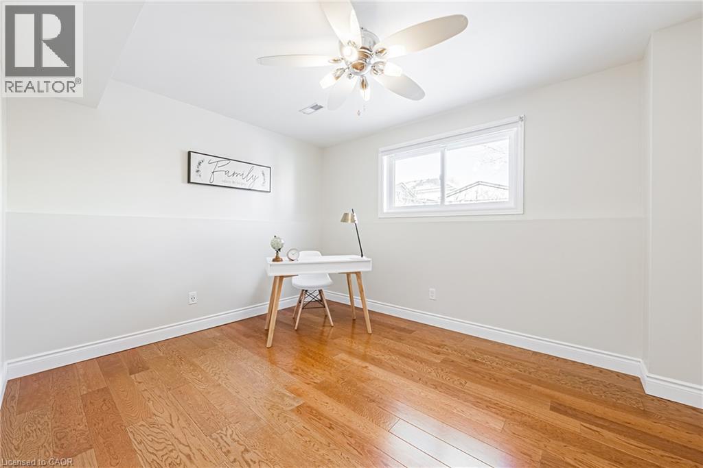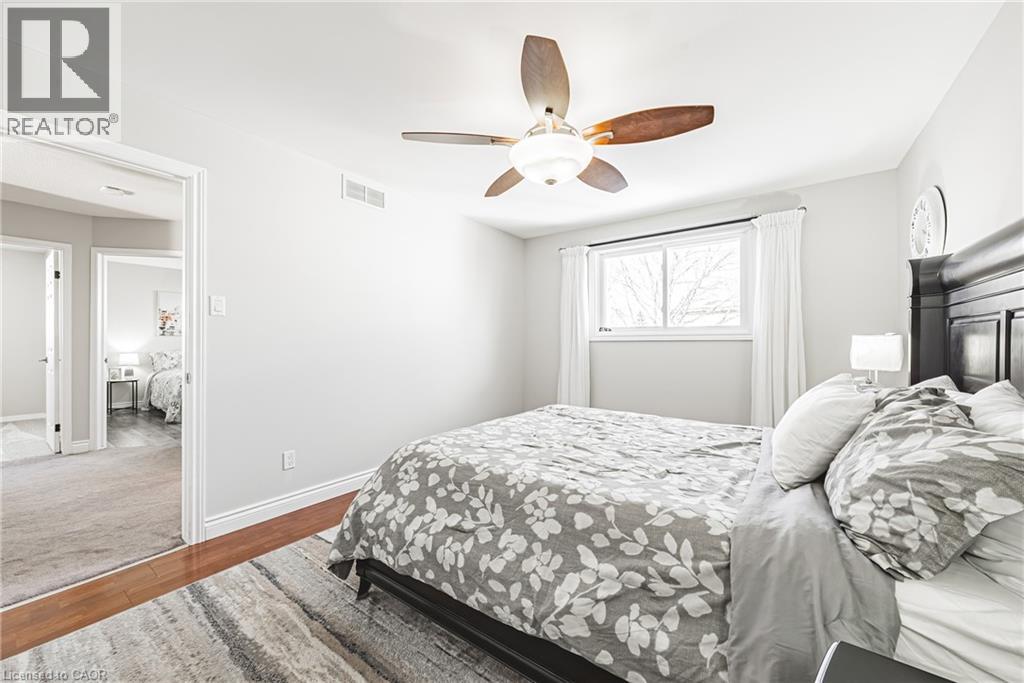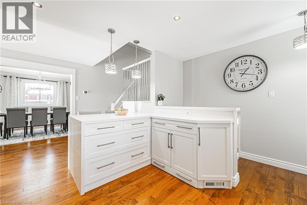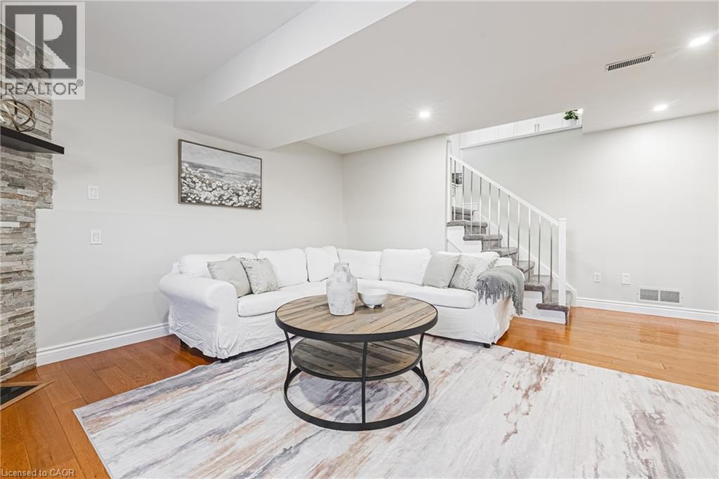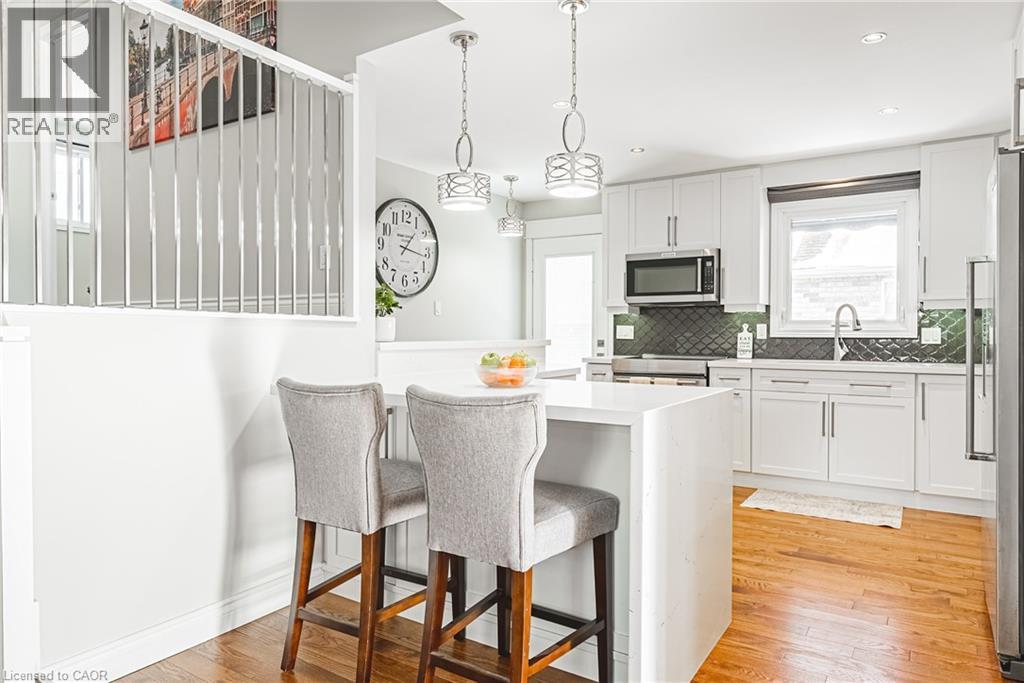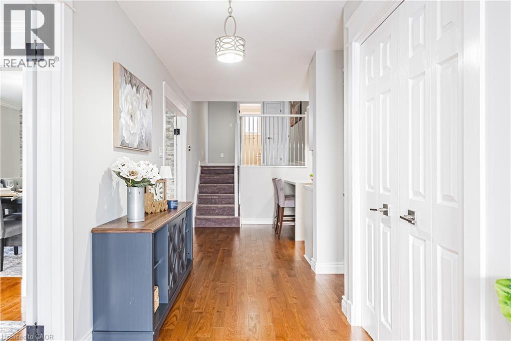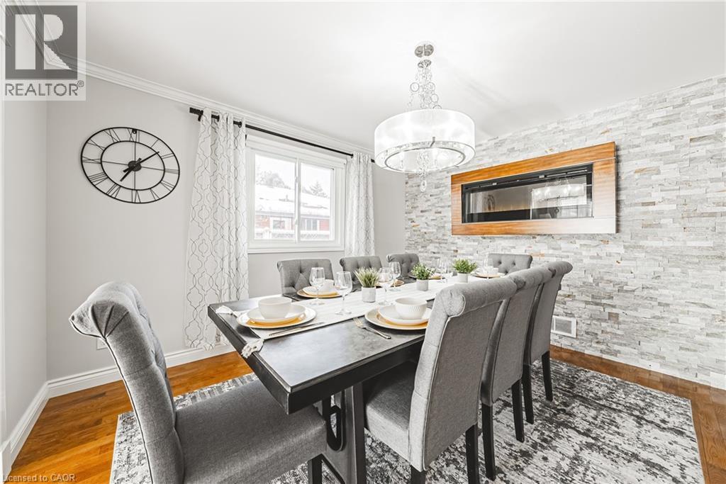 Beautifully maintained 4-bedroom, 2-bathroom backsplit with double garage, offering an impressive amount of finished living space across four levels in the prestigious Leckie Park community of Upper Stoney Creek. This home delivers a bright, functional layout with designated living, dining, and kitchen areas that create an ideal flow for everyday living and entertaining. The updated white kitchen showcases quartz countertops, stainless steel appliances, an island, custom cabinetry, crown moulding, and thoughtful storage touches, including a built-in spice drawer. The dining area is warm and inviting with hardwood floors throughout and ambient fireplace providing a turnkey setup for hosting family and friends. The upper level offers three comfortable bedrooms and a stylish 4-piece bathroom. The lower levels offer exceptional versatility, featuring a spacious family room with a gas fireplace, an additional bedroom, and a full 4-piece bathroom. The basement continues to impress with an updated laundry room, separate utility room, and an additional recreation space. Outside, the property boasts excellent curb appeal with a double-wide driveway and a fully fenced backyard complete with cedar decking, green space, garden shed and two electric retractable awnings for effortless comfort. The attached double garage is a standout feature with its epoxy finished flooring, clean, durable and ideal for storage or a workshop setup. Ideally located near parks, trails, grocery stores, restaurants, community centre, Cineplex theatres, and offering quick access to the Linc, Redhill, and QEW. A must see home with exceptional value! (id:4555)