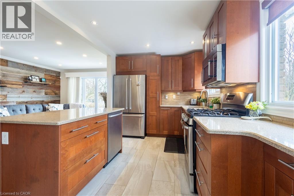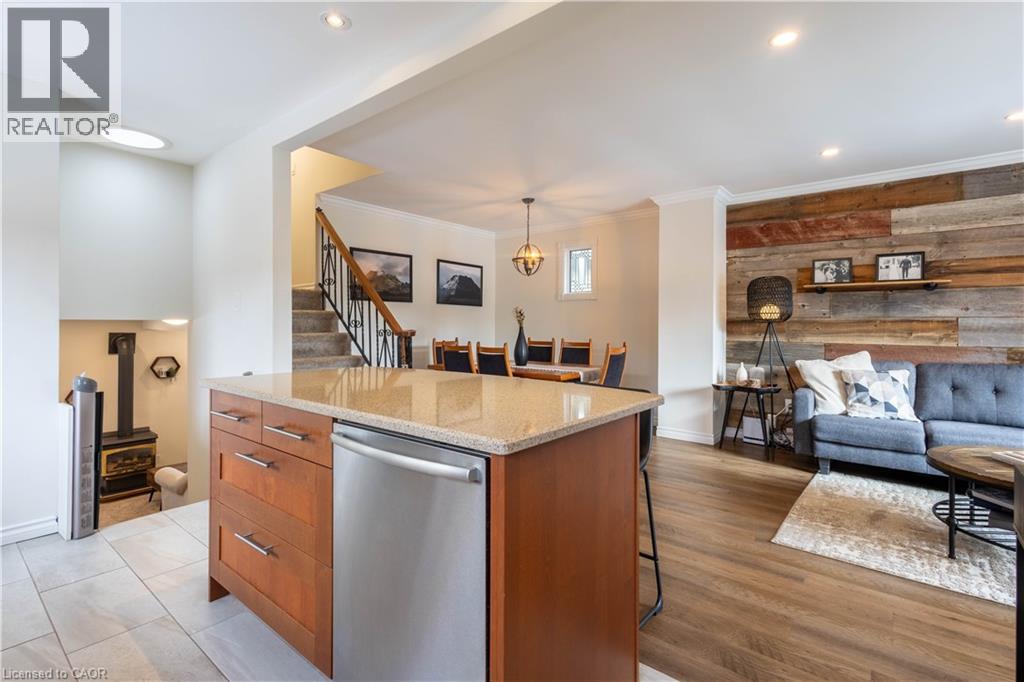 Welcome to this beautifully updated 4-level back-split nestled in a prime location on Stoney Creek Mountain. Step inside to discover an inviting living room and dining area that seamlessly flow into a newer kitchen, all with brand-new flooring throughout the main level and heated kitchen flooring. The bedroom level features a spacious primary bedroom, a second bedroom, and an updated 4-piece bathroom also with in-floor heat. The lower level offers a welcoming family room with a gas fireplace, and a convenient 2-piece bath. In the basement, you’ll find a versatile bonus room equipped with a wet bar, an additional bedroom, laundry facilities, and a 3-piece bathroom. This area presents an ideal opportunity for a potential in-law suite or additional living space. Located close to the scenic Bruce Trail, a variety of shopping options, schools, and restaurants. Don't miss out on the opportunity to make this beautiful home your own. (id:4555)