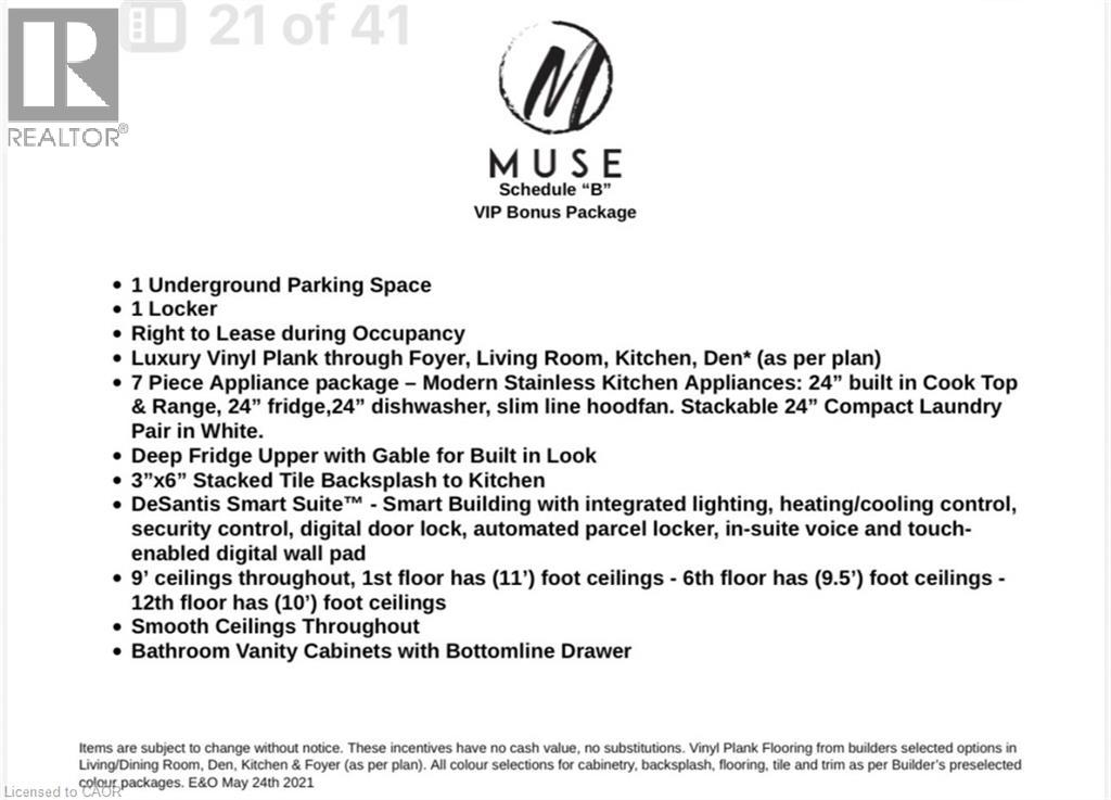 Be the First to Live in this 4th Floor Unit in The Muse Condos in Stoney Creek. Unit #422 offers 525 sq/ft plus a Large 82 sq/ft West facing balcony. This modern 1 Bedroom, 1 Bathroom has it all with 9' Ceilings, Floor-to-Ceiling Windows, Luxury vinyl plank flooring throughout, Quartz countertops, Pot lights, Brand New Stainless Steel Appliances with in-suite stackable Laundry. One underground Parking space & One Locker included. Bell Internet is FREE for the first year. Smart Building with Smart Suite includes integrated lighting, heating/cooling control, security control, digital door lock, automated parcel locker in front entrance, in-suite voice and touch enabled digital wall pad. The Smart Home features include app-based climate control, security, energy tracking, and digital access. Great Location for Commuters being just minutes from the new GO Station, Confederation Park, Van Wagner's Beach, scenic lakeview trails, shopping & restaurants. Ground floor commercial space and resident amenities, including a stunning 6th-floor lakeview terrace with BBQ(s) and seating areas, studio space, media lounge club room with chef's kitchen, art gallery, and pet spa. Great Condo For Lease in Stoney Creek and Condo to add to your Property Search. Smoke Free Building. RSA. (id:4555)