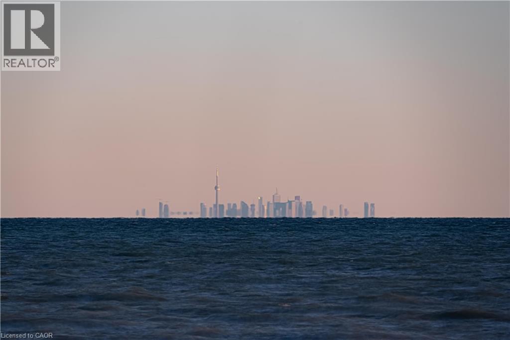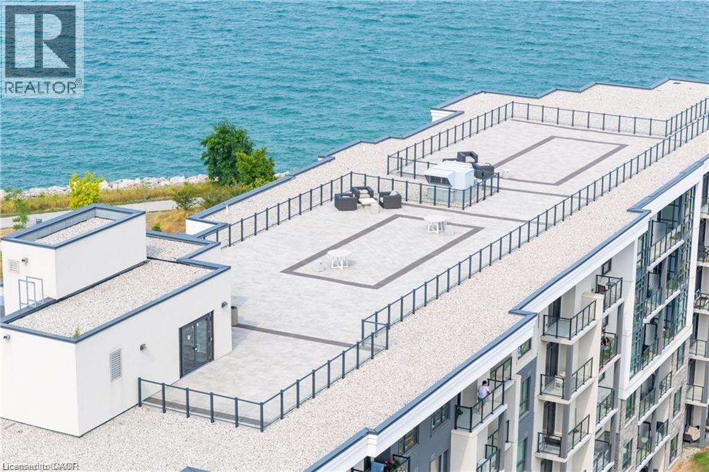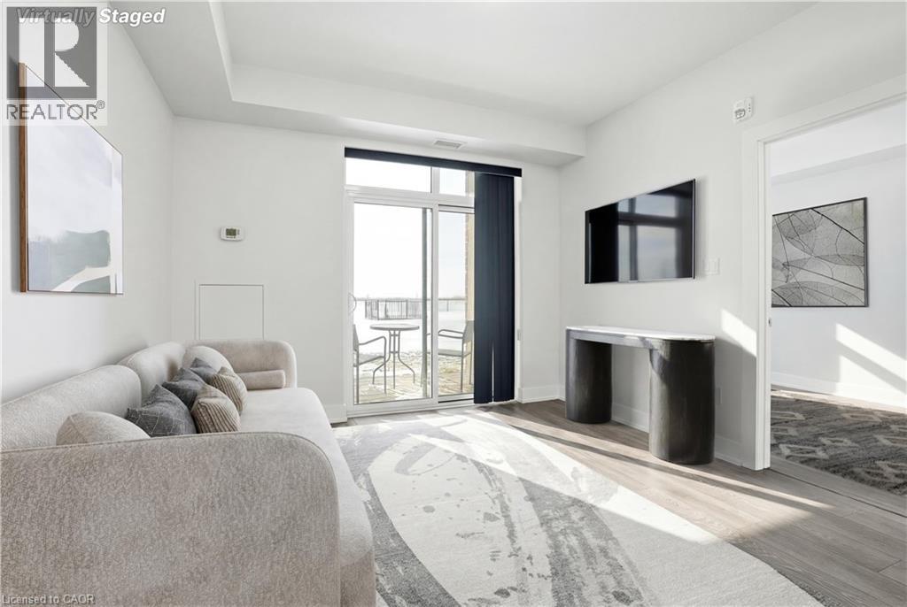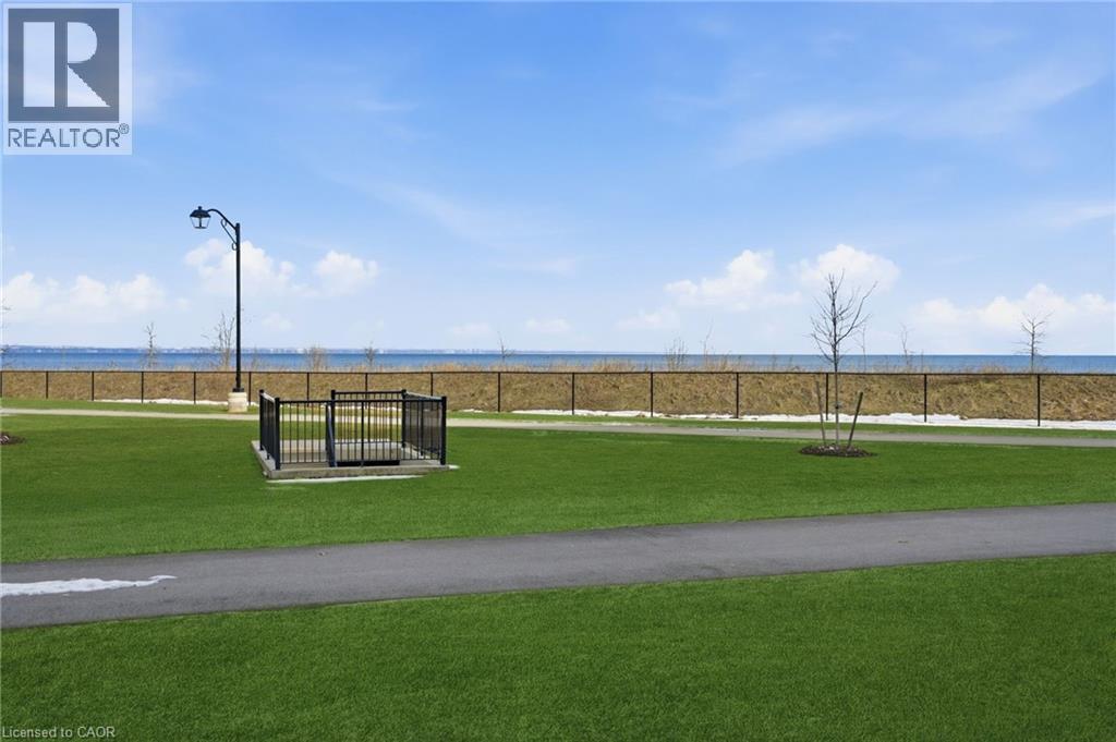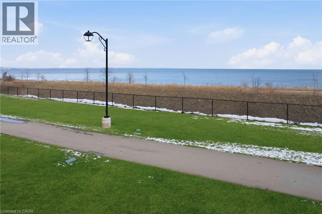 LAKE VIEW! WALKOUT! PET LOVERS! UP TO $10K IN CUSTOM BUYER INCENTIVES! Welcome to this beautifully proportioned, bright 1-bedroom condo, perfectly positioned just steps from Lake Ontario and a secluded beach, with sweeping views toward Burlington and the Toronto skyline. Offering the convenience of a main-floor walkout and a private front-door hallway entry, this home blends condo living with the feel of a ground-level retreat. Freshly painted in a neutral palette, the unit features 9-foot ceilings and a bright, open-concept layout designed to maximize both space and natural light. Warm-toned upgraded laminate flooring flows seamlessly from the living area through the hallway and into the bedroom, with upgraded trim creating a cohesive and inviting atmosphere. Step outside to your private, serene patio and rear lawn area overlooking the lake — an ideal setting for morning coffee, evening cocktails, or outdoor dining with easy access for pet owners. The kitchen showcases quartz countertops, Frigidaire stainless steel appliances, a sleek smooth-top stove, Blanco double under-mount sink, pull-down faucet, and stylish backsplash. A breakfast bar provides space for casual dining or entertaining, while custom blinds throughout add comfort and privacy. The bedroom offers flexibility for furniture placement, complemented by a large window and generous closet. Just across the hallway, the well-appointed 4-piece bathroom features updated porcelain tile, a custom glass shower wall, and a conveniently located, separated in-suite laundry area. Enjoy excellent building amenities, including a party room, exercise room, rooftop terrace, bike storage, and secure underground parking, along with direct access to scenic waterfront trails and a peaceful public beach. Situated with quick access to major commuter routes, Confederation GO, and everyday conveniences. Whether you’re a first-time buyer, downsizer, or investor, this turnkey lakefront condo delivers exceptional value. (id:4555)