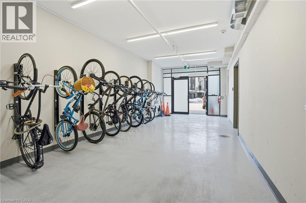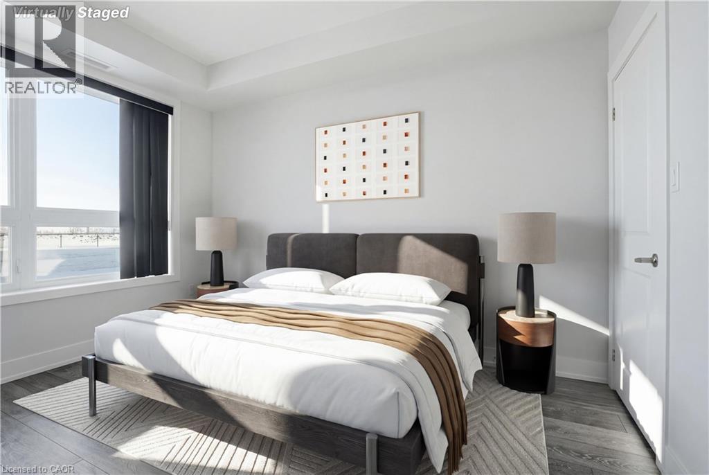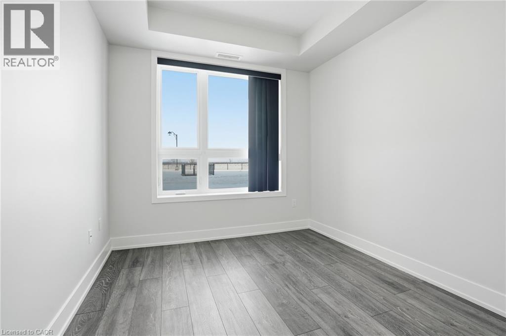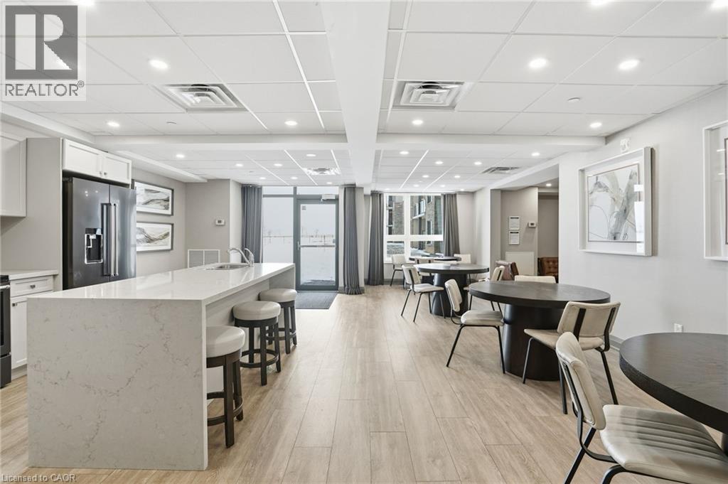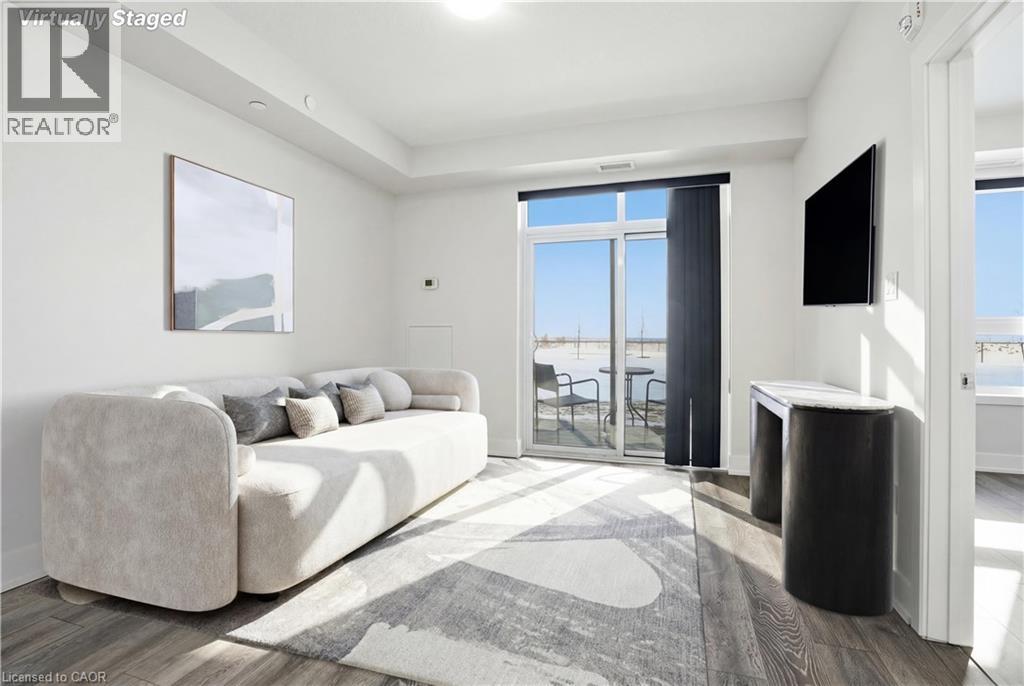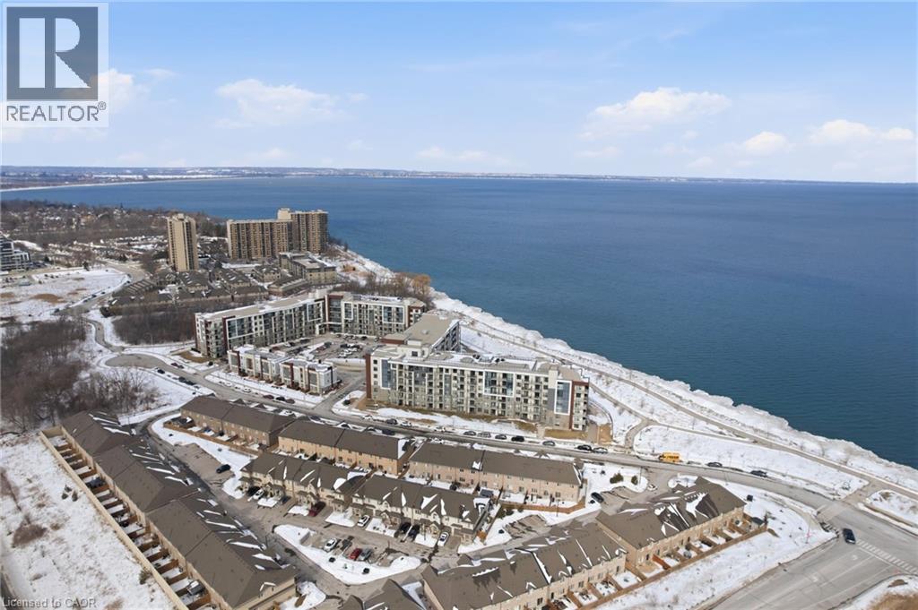 LAKE VIEW! WALKOUT! PET LOVERS! UP TO $10K IN CUSTOM BUYER INCENTIVES! Welcome to this beautifully proportioned, bright 1-bedroom condo, perfectly positioned just steps from Lake Ontario and a secluded beach, with sweeping views toward Burlington and the Toronto skyline. Offering the convenience of a main-floor walkout and a private front-door hallway entry, this home blends condo living with the feel of a ground-level retreat. Freshly painted in a neutral palette, the unit features 9-foot ceilings and a bright, open-concept layout designed to maximize both space and natural light. Warm-toned upgraded laminate flooring flows seamlessly from the living area through the hallway and into the bedroom, with upgraded trim creating a cohesive and inviting atmosphere. Step outside to your private, serene patio and rear lawn area overlooking the lake — an ideal setting for morning coffee, evening cocktails, or outdoor dining with easy access for pet owners. The kitchen showcases quartz countertops, Frigidaire stainless steel appliances, a sleek smooth-top stove, Blanco double under-mount sink, pull-down faucet, and stylish backsplash. A breakfast bar provides space for casual dining or entertaining, while custom blinds throughout add comfort and privacy. The bedroom offers flexibility for furniture placement, complemented by a large window and generous closet. Just across the hallway, the well-appointed 4-piece bathroom features updated porcelain tile, a custom glass shower wall, and a conveniently located, separated in-suite laundry area. Enjoy excellent building amenities, including a party room, exercise room, rooftop terrace, bike storage, and secure underground parking, along with direct access to scenic waterfront trails and a peaceful public beach. Situated with quick access to major commuter routes, Confederation GO, and everyday conveniences. Whether you’re a first-time buyer, downsizer, or investor, this turnkey lakefront condo delivers exceptional value. (id:4555)