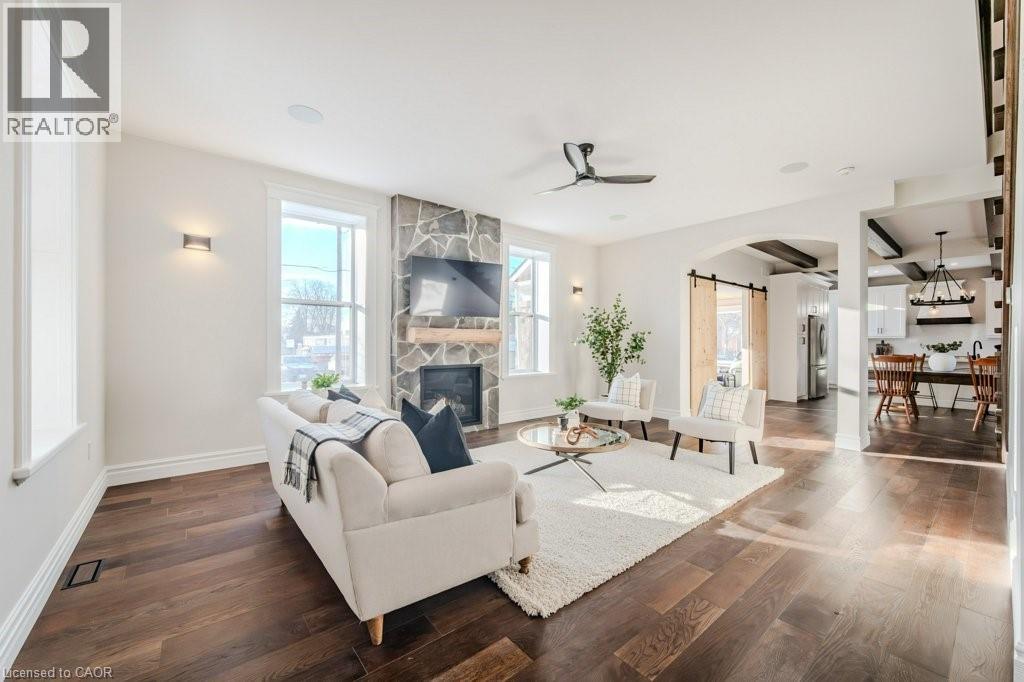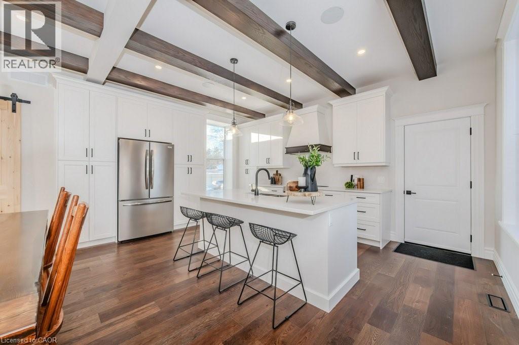 Nestled in the heart of Tavistock, this beautifully restored century home has been completely reimagined for modern living. With over 3,000sqft of updated above-ground space, this home seamlessly blends timeless character with elevated contemporary design. Step inside to a bright, open-concept main floor designed for connection & everyday living. The chef-inspired kitchen features stone countertops, stainless steel appliances, & an oversized island that anchors the space. An exposed beam ceiling spans the kitchen & dining area, adding warmth, texture, & a nod to the home’s rich history. The spacious living room is flooded with natural light & centred around a cozy gas fireplace—perfect for quiet evenings or lively gatherings. A stunning 4-season sunroom with a wood ceiling creates a year-round retreat to relax, entertain, or simply enjoy the sunsets. Throughout the home, thoughtful details like shaker-style casings, high baseboards, & sleek glass railings beautifully bridge historic charm with modern sophistication. Upstairs, you’ll find four generous bedrooms, including a luxurious primary suite complete with a spa-inspired ensuite & custom walk-in closet. The upper level also offers 3 additional bedrooms for growing families while maintaining comfort & privacy. Additional highlights include main floor laundry, a double car garage, & a large deck with a hot tub overlooking the expansive yard—ideal for kids, pets, & outdoor entertaining. Located just 15 minutes from Stratford & 30 minutes from KW, Tavistock offers the perfect balance of small-town charm & convenient city access. Known for its welcoming community, rich heritage, parks, & local recreation centre, it’s a place where neighbours know each other & life moves at a comfortable pace. With updated electrical, plumbing, windows, & furnace, this home is truly move-in ready. Whether you’re searching for a forever family home, a peaceful retreat, or a space designed for entertaining, 44 Hope Street West delivers. (id:4555)