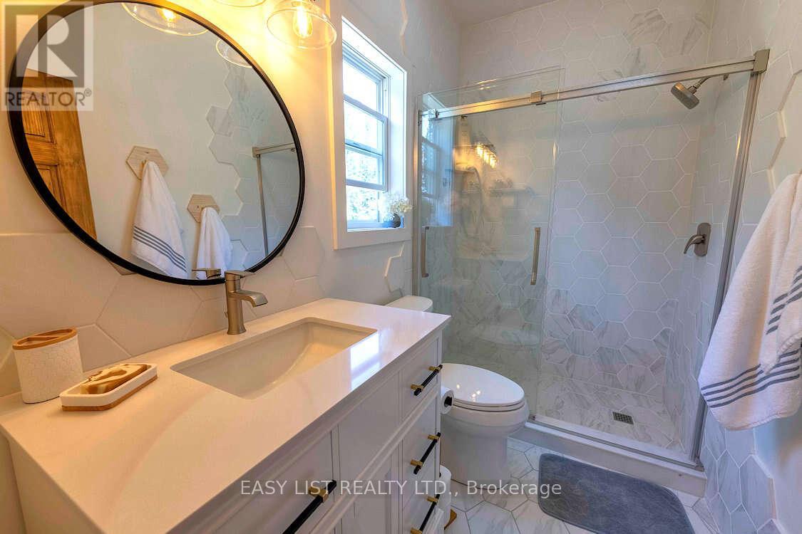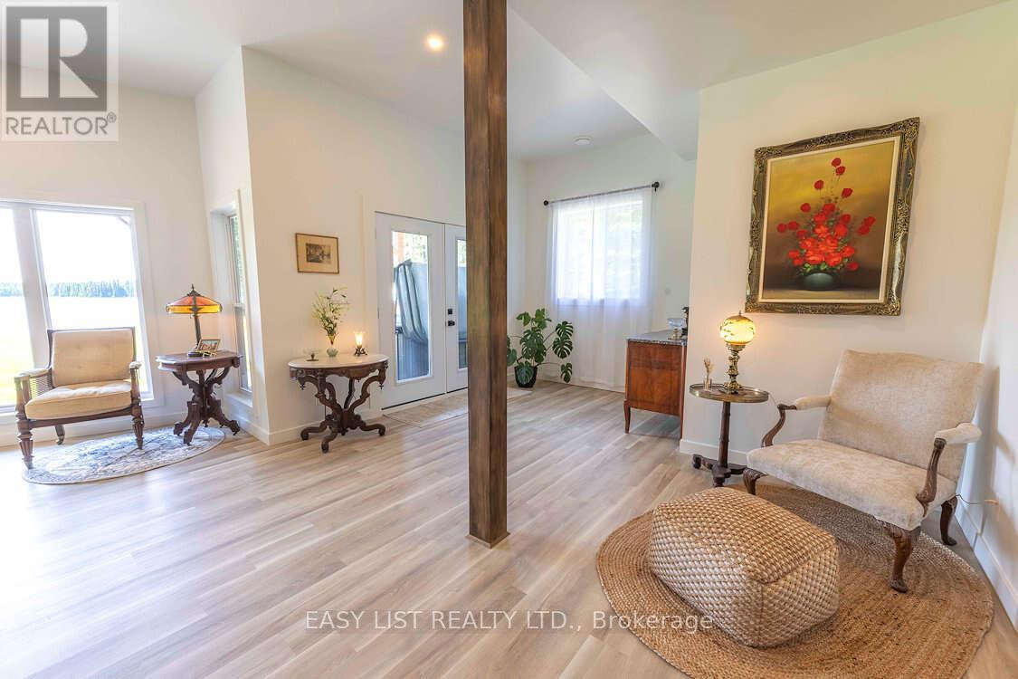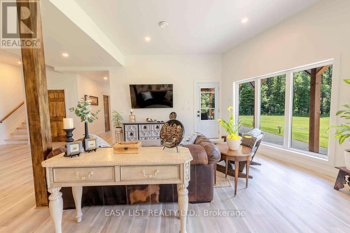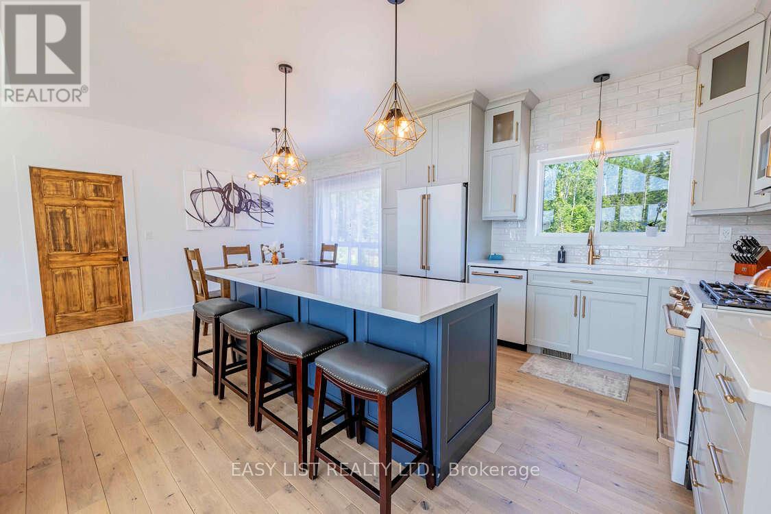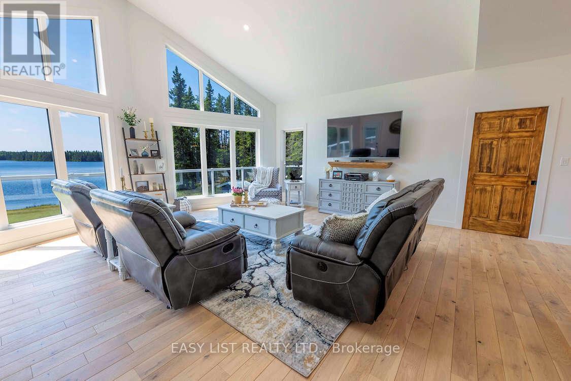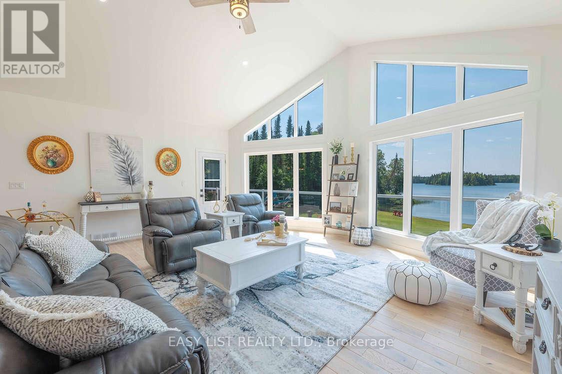 For more info on this property, please click the Brochure button. Live the waterfront dream! Situated on the shores of pristine McLeish Lake, just 30 minutes from the city, this year-round waterfront residence was professionally designed, custom built, and meticulously and finely finished for its owners, with keen attention to each and every detail, no expense spared, and showcases nearly 3000 sq ft of both formal and casual living spaces, and boasts extraordinary outdoor relaxation that is highlighted by a large wrap-around deck, full-length stone patio with soothing six-person hot tub, and stone fire-pit patio. Unparalleled peace and privacy await on pristine McLeish Lake. The property is nestled among crown land. Outdoor recreation is at the door step - including refreshing swimming, boating and world-class fishing. Or explore the large lake and its various bays and extensions by canoe or kayak. Every inch of this home's 2860 sq ft impress. The great room serves as the unequivocal centerpiece, with a vaulted ceiling and floor-to-ceiling picture windows that frame stunning views of the lake - and face west for spectacular sunsets. The open-concept layout allows the dining room and kitchen to also benefit from these incredible views. Glass railings on the wrap-around deck ensure that the views are uninterrupted. The expertly designed kitchen with large center island features sleek shaker-style cabinetry that is complemented by brushed gold hardware, quartz counters, a ceramic-tile back splash, motion-activated counter lights, and new top-of-the-line GE Café appliances (propane stove, fridge, built-in dishwasher and microwave). Wake up each morning to the exceptional lake views - all four bedrooms overlook the water. (id:4555)