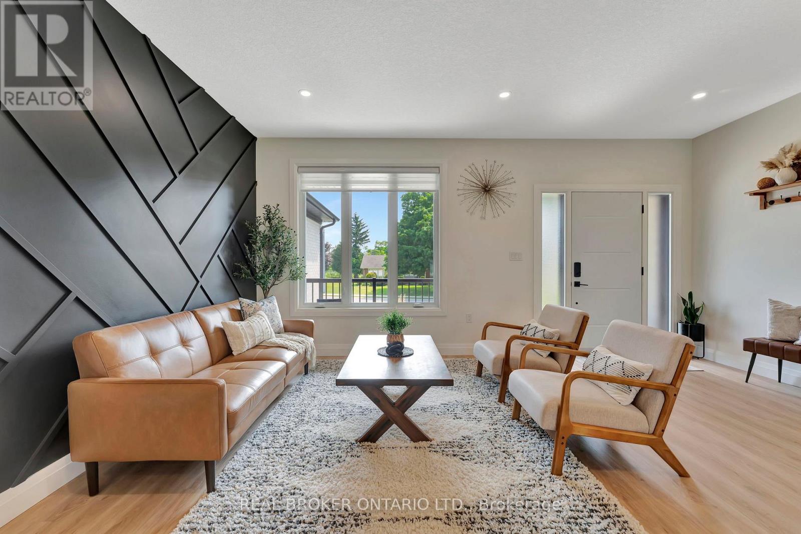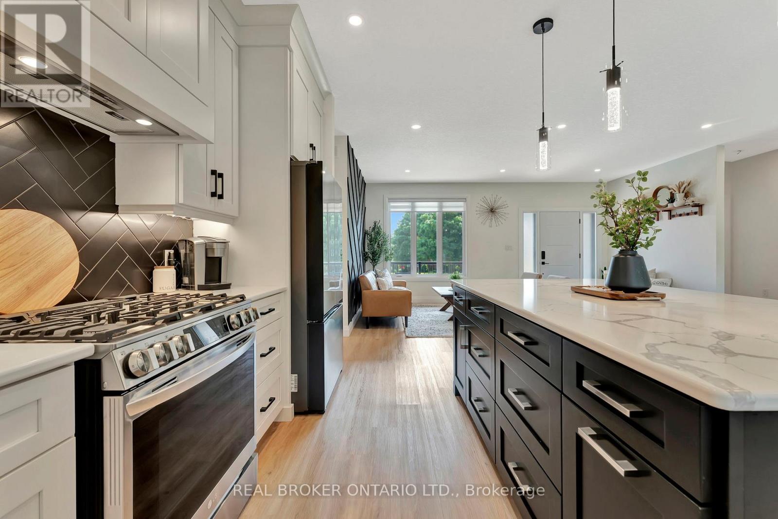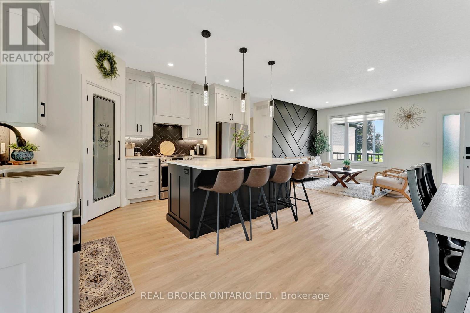 Wrapped in a striking blend of brick and hardy board, the exterior of this luxury bungalow is beautifully illuminated by soft exterior pot lighting, while a Wrapped in a striking blend of brick and hardy board, while a spacious triple car garage offers both curb appeal and everyday functionality. A charming covered front entry sets the tone with timeless character, leading into a bright, welcoming foyer where natural light streams through elegant double sidelights. Inside, the home opens to a stunning, open-concept layout with rich flooring that flows seamlessly throughout the main level. The living room stands as a warm and inviting focal point, anchored by a sophisticated accent wall that adds texture and depth to the space. At the heart of the home is a chef-inspired white kitchen, highlighted by a bold black-accented island and ceiling-height cabinetry that blends style with exceptional storage. A generously sized walk-in pantry enhances both function and flow. Adjacent to the kitchen, the dining area offers an oversized sliding walk-out to a spacious covered patio-perfect for effortless entertaining and year-round indoor-outdoor living. The main level features three thoughtfully placed bedrooms, offering comfort and privacy for the whole family. The primary suite serves as a true sanctuary, complete with a luxurious 5-piece ensuite featuring dual vanities, a deep soaker tub, and a glass-enclosed shower. Two additional bedrooms are complemented by a beautifully appointed 4-piece bathroom, while a stylish main floor laundry room provides added convenience. Downstairs, the fully finished lower level expands your living space with two additional large bedrooms and a full bathroom-ideal for teens, in-laws, or guests. A spacious rec room offers endless versatility, whether you're envisioning a home theatre, gym, or playroom. (id:4555)