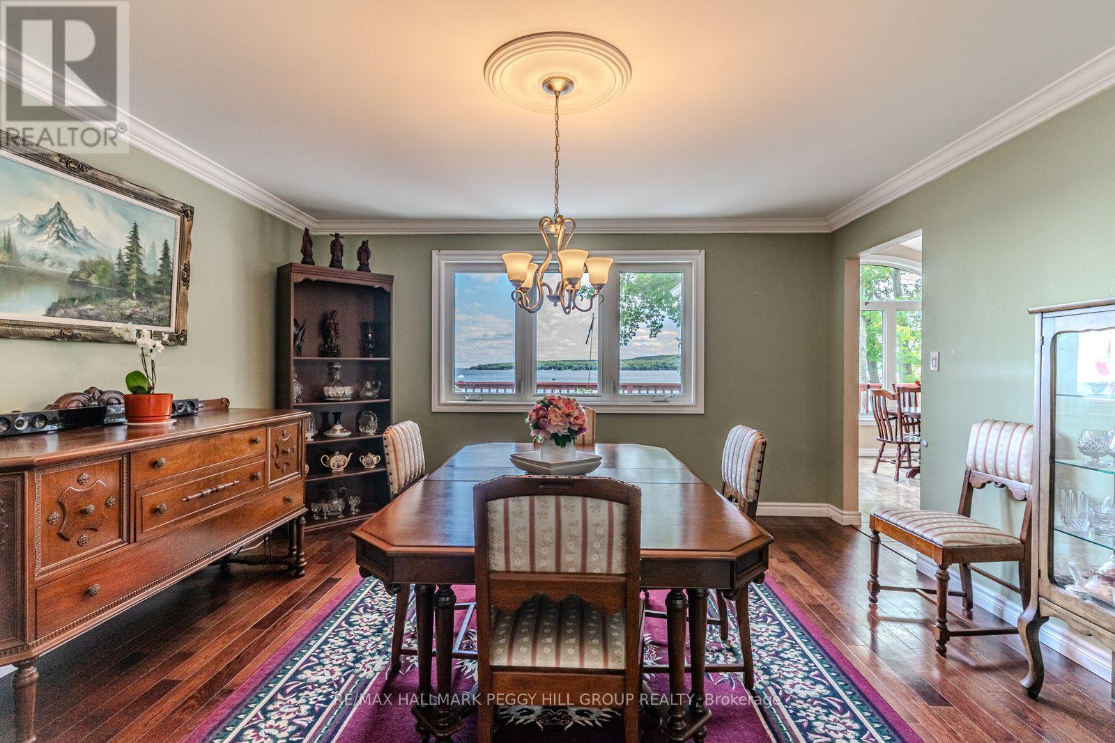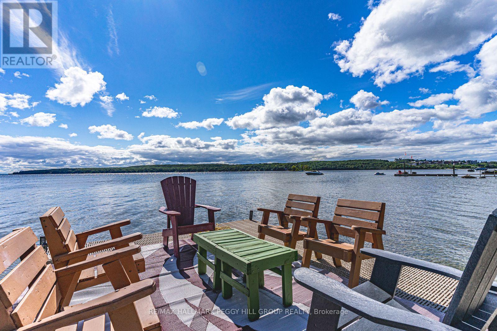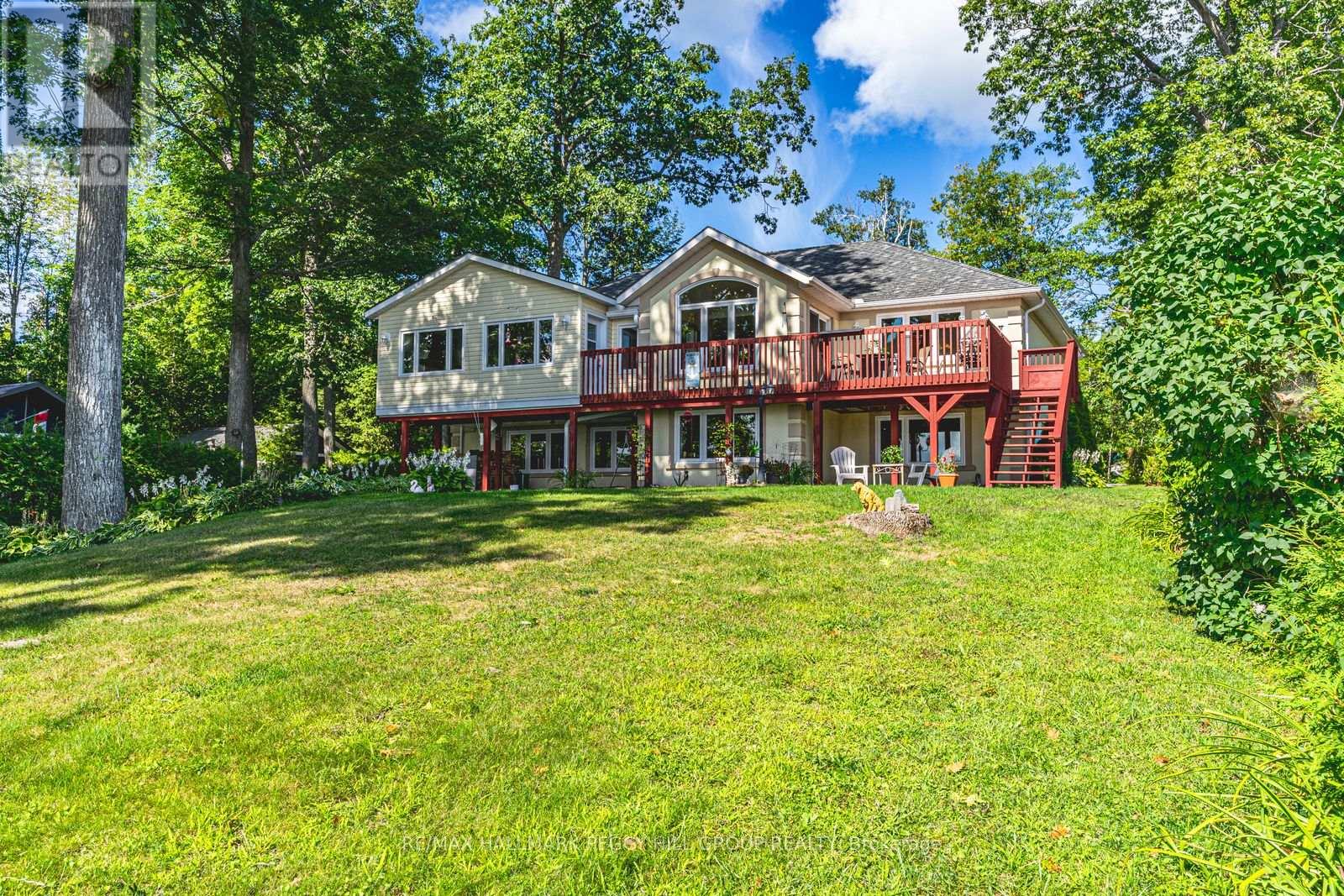 LUXURIOUS GEORGIAN BAY ESTATE WITH 83 FT OF SANDY SHORELINE, SECOND COTTAGE, DETACHED GARAGE & ALMOST HALF AN ACRE! 83 feet of Georgian Bay frontage with eastern exposure presents a private sandy beach with gradual entry, clear waters, and sunrise views that define the waterfront lifestyle. Set on nearly half an acre with a large back deck, the property is further enhanced by an expansive L-shaped dock with a bump-out that extends into the bay, offering an impressive setting for entertaining, lounging, and docking motorcraft. Located on a coveted cul-de-sac along sought-after Peek-A-Boo Trail and just steps from Tee Pee Point Park, the property delivers exclusivity and tranquillity while remaining approximately 10 minutes to local essentials and a short drive to Penetanguishene and Midland for expanded amenities. The primary residence introduces itself with a stately front entry, covered porch, manicured landscaping, and a detached two-car garage with six-car driveway parking. The kitchen is appointed with rich wood cabinetry topped with crown, granite counters, stainless steel appliances, and a built-in desk area. The living room features a bay window, crown moulding, fireplace, and French doors, while the spectacular sunroom boasts soaring ceilings, shiplap accents, pot lights, a dramatic fireplace, and a walkout. The primary bedroom highlights its own walkout to the sunroom, a walk-in closet, and a spa-like 6-piece ensuite. Extending the living space, the finished walkout basement showcases a massive rec room with a third fireplace, and room for a pool table, along with a fourth bedroom and full bath, with the entire level opening directly to the yard and waterfront. A versatile second cottage with two bedrooms, a bathroom, a kitchen and a living area, and a private deck enhances the property's functionality for family and guests, while main floor laundry, in-floor radiant heating, central vac, and ERV/HRV systems add to the overall comfort. (id:4555)