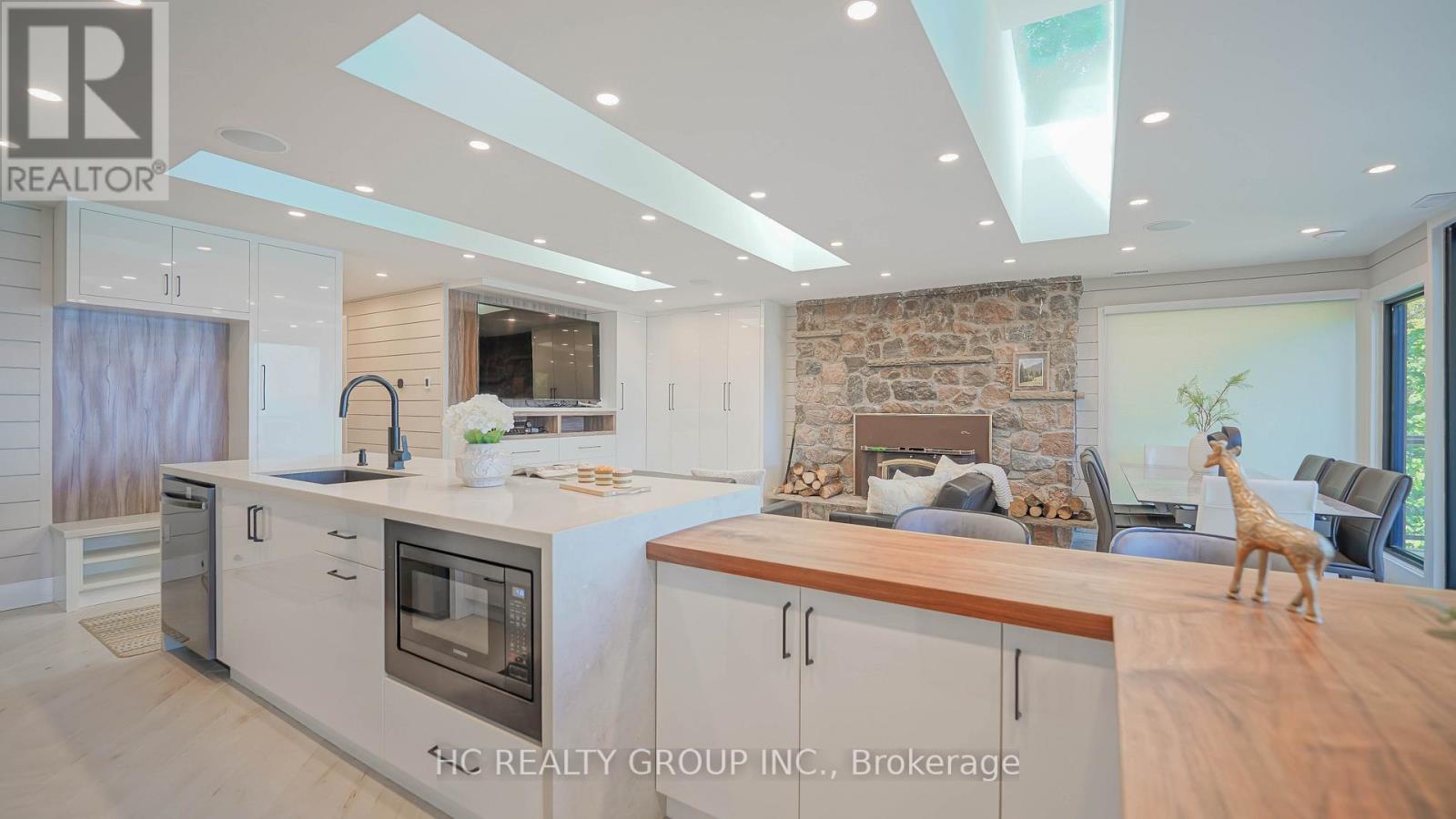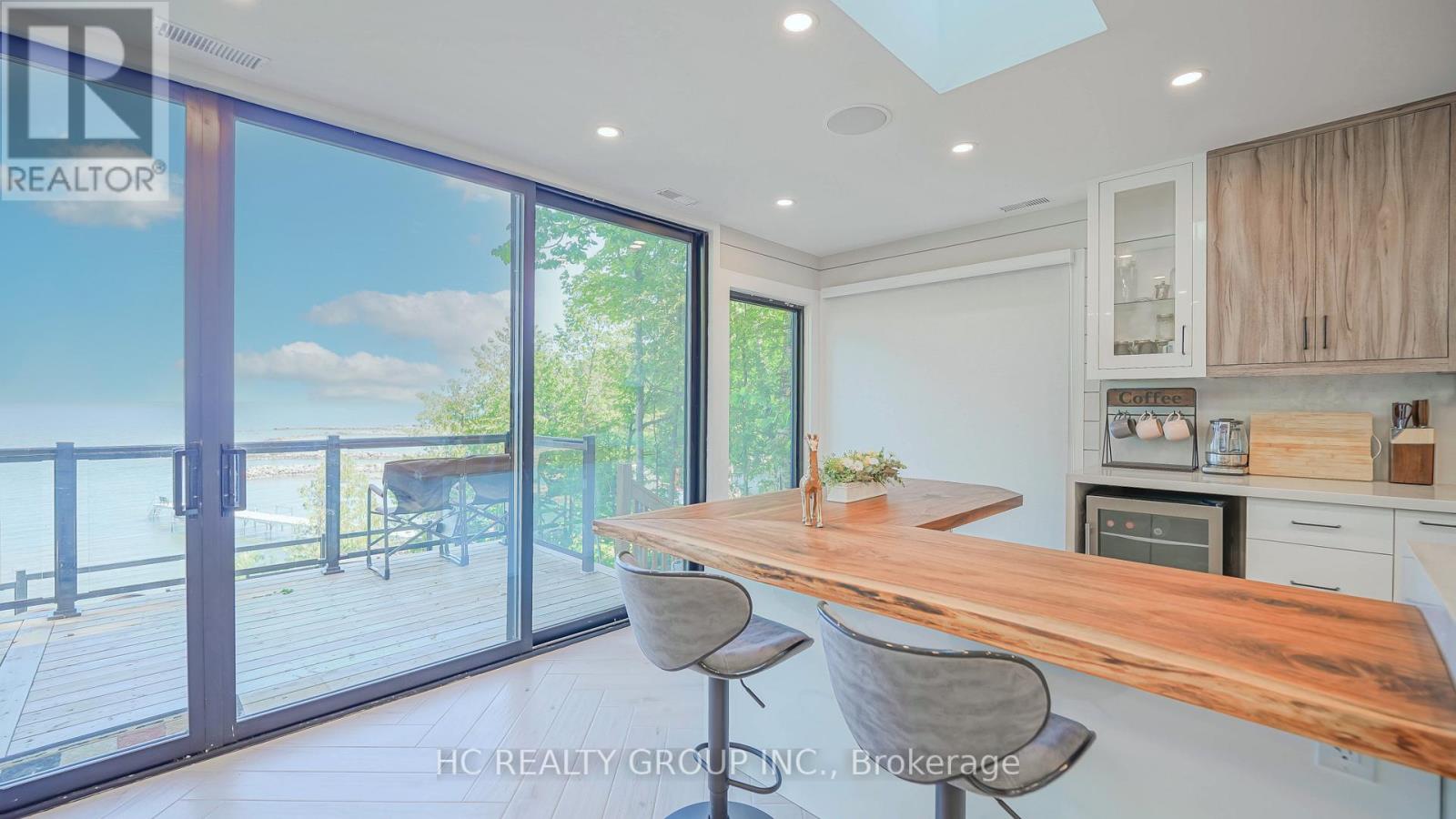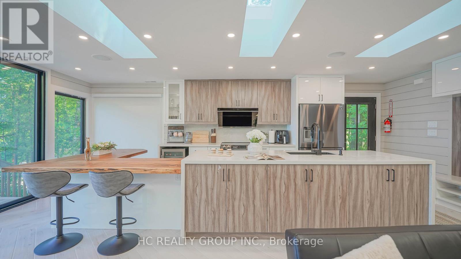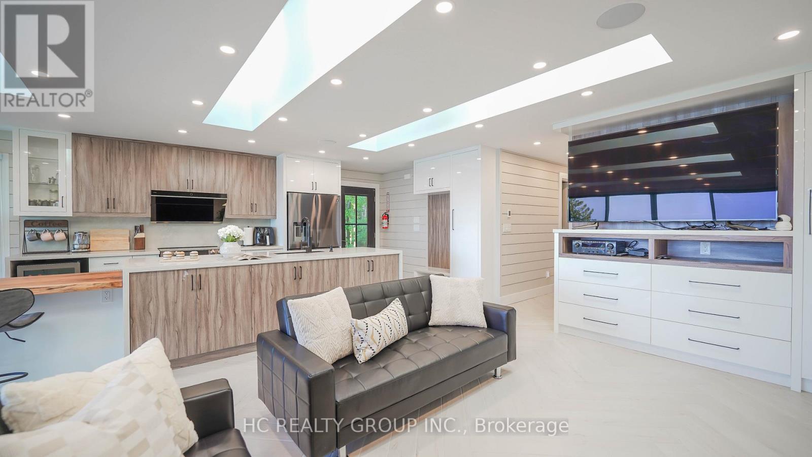 A rare opportunity to own a crystal-clear, year-round waterfront property, surrounded by multi-million-dollar homes. This brand-new cozy cottage was just completed last summer, with only the foundation and original fireplace featuring a handmade stone wall retained. It took four years to complete and is an excellent quality build. Spray foam insulation covers the entire roof, heated floors are installed throughout the house, and the modern kitchen features high-end quartz countertops and backsplash finishes. A handmade black walnut island overlooks the bay, and numerous built-in wall cabinets provide ample storage space.this home showcases a rare four-tier waterfront design - featuring a main deck at kitchen level, two interlock terraces supported by retaining walls for BBQ and fireside living, and a sandy shoreline that leads directly into the water,The waterfront features an artificial sandy area near the water, perfect for children to play. All indoor and outdoor furniture, as seen during the showing, are included. Use of the garage is to be arranged with the landlord. Book your appointment today. (id:4555)