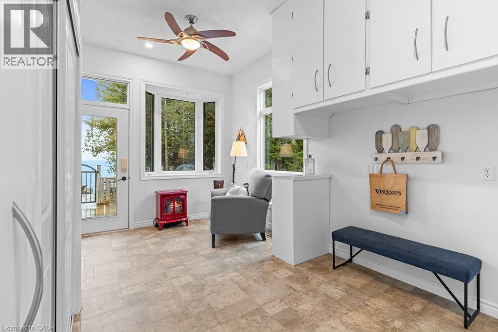 Wake up to the sound of waves & step from your lakeside deck into the crystal clear waters of Dorcas Bay, on Lake Huron. This is 4-season living at its most effortless. Set along one of the most cherished stretches of shoreline on the Bruce Peninsula, this 4 bedroom, 2 bathroom home offers a waterfront experience that feels peaceful & connected to nature. Mornings begin quietly at the water’s edge. Days unfold with swimming, paddling & time spent outdoors. Evenings settle into soft light & unforgettable sunsets across the bay. Inside, the home is bright, open & welcoming. The kitchen, dining & living spaces all orient toward the water, allowing the view to become part of daily life. The main floor offers 2 comfortable bedrooms & full bathroom, creating an easy & functional layout for generational living. Upstairs is where the home really opens up. The generously sized primary suite has wall-to-wall windows, offering incredible lake views & private balcony. There’s plenty of space to create a sitting area, making it feel like its own retreat. A 4th bedroom & large 5pc bathroom with jetted tub & separate shower completes the upper level. Outside, tiered decks lead toward the shoreline, creating spaces to gather & unwind. A 408sf bunkie provides exceptional additional sleeping space (currently sleeps 4, with a sitting area) or a quiet lakeside office, just steps from the water. Thoughtfully updated for year-round comfort, the home includes an updated propane furnace (2025), AC (2020), septic pump (2025) & UV system (2025), along with a spray foamed basement & backup generator for peace of mind in every season. In winter, the landscape becomes quiet, with snow, wildlife, & an ever-changing lake. With year-round road access, it remains easy to enjoy in every season. Just minutes from Tobermory & the Grotto, a place where summers linger, cozy winters feel calm & the rhythm of the lake becomes part of everyday life. A true piece of Canadiana, held right at the water’s edge (id:4555)