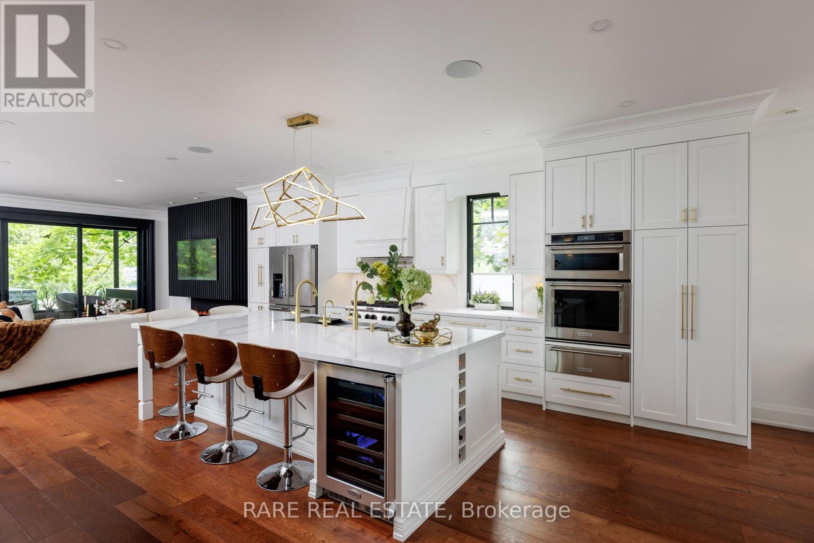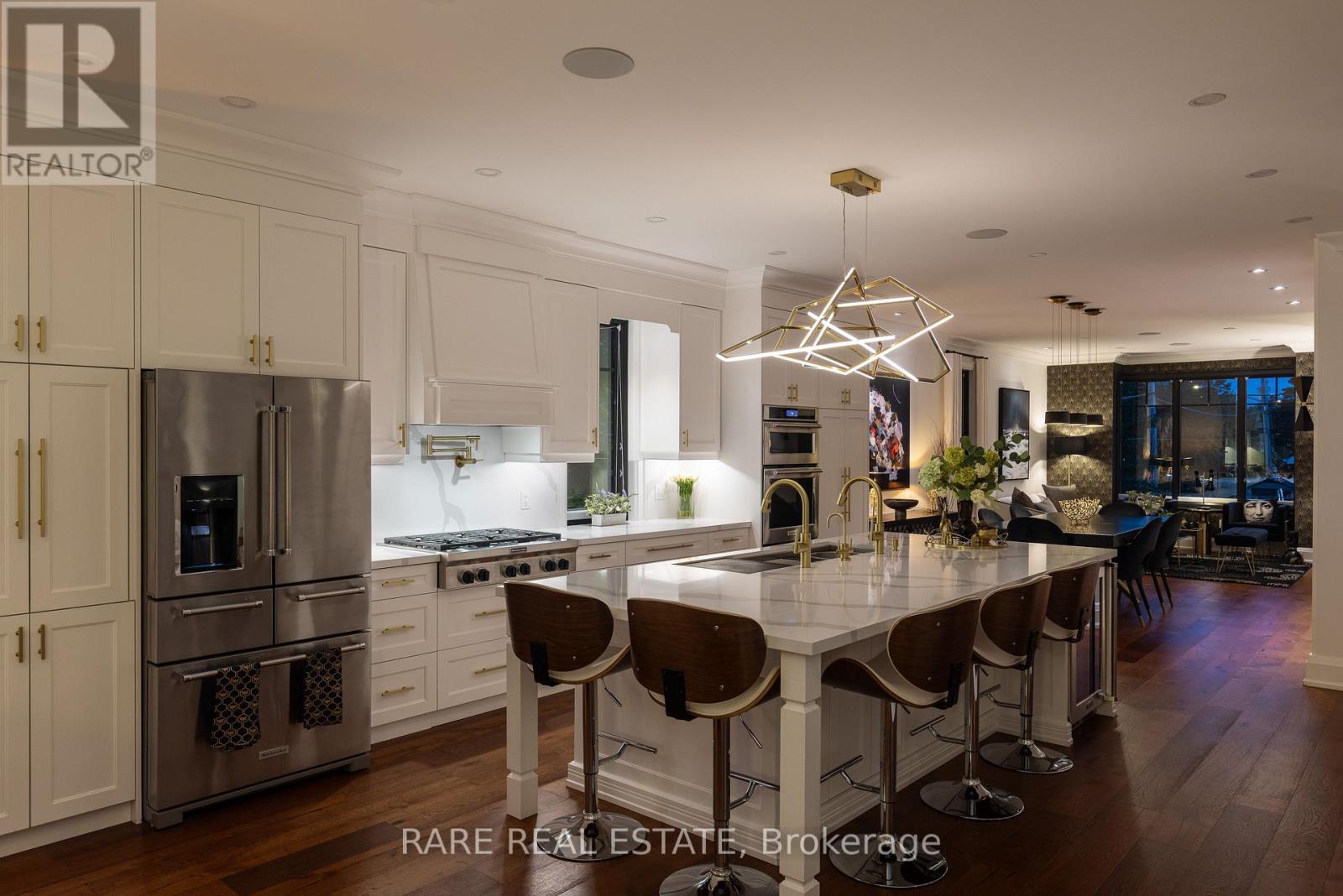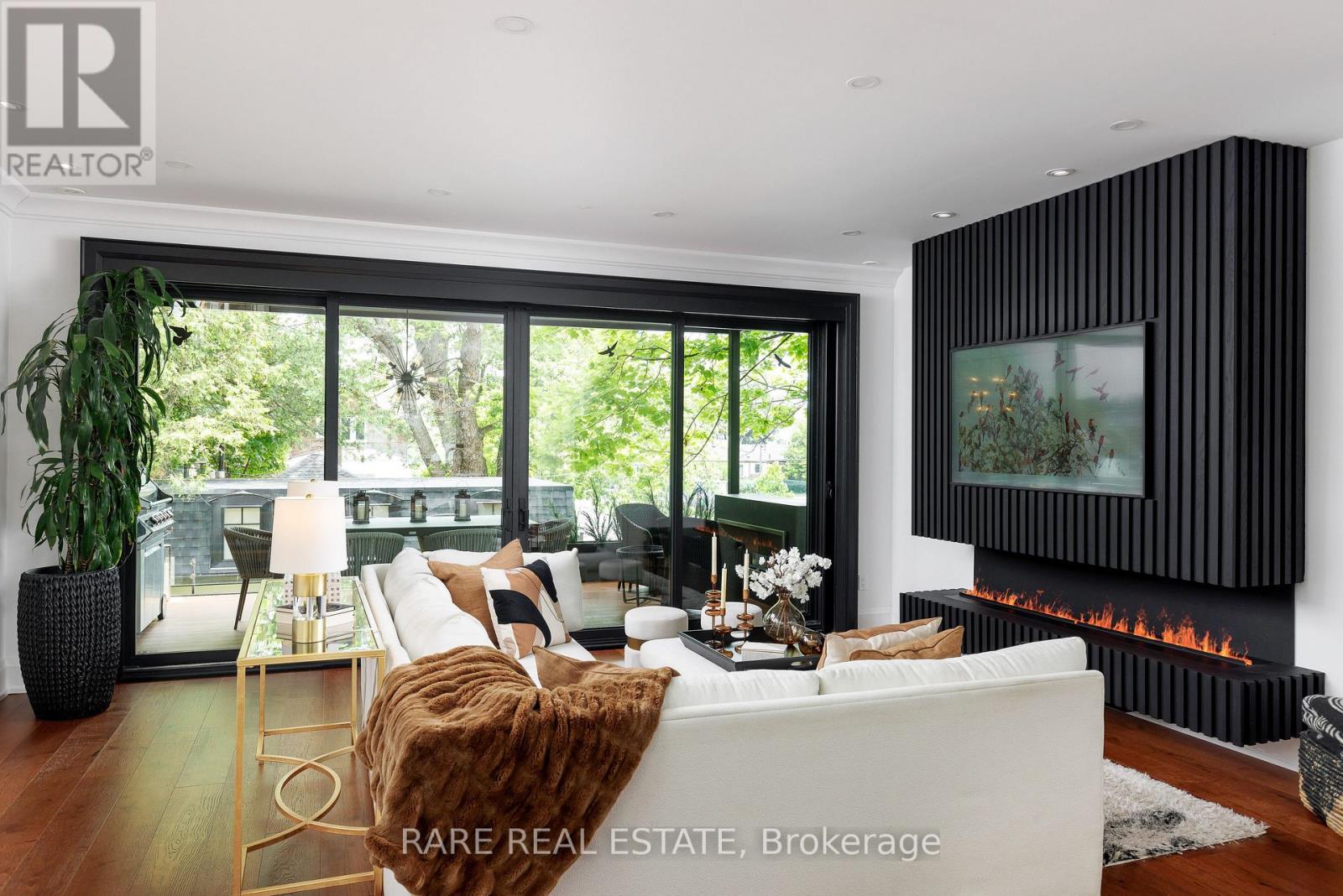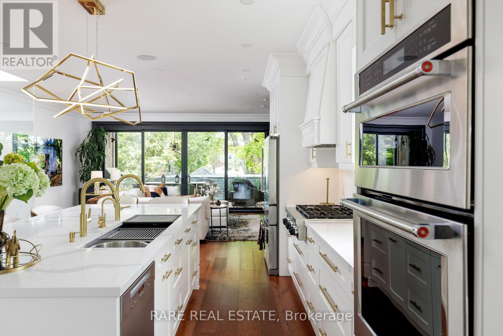 A stunning work of art. A custom home, built with a passion for design and architecture, and attention to every detail. Situated on a majestic corner lot with picturesque landscaping, wide backyard, views of the water and steps to the waterfront parks and Lake Shore shops. Fully custom home with 3,672 sqft above grade space, no basement, 9 foot ceilings on all levels and 5 above grade bedrooms. A home where luxury and warmth come together. Every inch of this home has been masterfully curated with the finest quality finishes and technologies, creating a space that is both breathtaking and inviting. Fully open main level with floating wood and glass staircase that fills the room with sunlight. Designer kitchen with a massive 10 ft kitchen island, and 5 foot Galley Kitchen workstation sink with triple faucets. Double door walk out to the covered terrace overlooking the backyard gardens. Luxurious and relaxing primary suite with views of the sunrise over the water and a walk out to the terrace set within the treetops. Complete with his walk-in closet and her walk-in dressing room with custom wall to wall cabinets and makeup vanity. The backyard's professionally designed landscaping envelops the home in natural beauty and privacy, a cottage setting in the city. The garage completes the outdoor entertaining with a cabana bar glass garage door and rough in mini kitchen. Rough-in kitchen on lower level for in-law suite. An abundance of features and technology for comfortable everyday living and elevated entertaining. Hi-Velocity heat/cool air system with 4 thermostat control zones (1st floor, 2nd floor, 3rd floor, Principal suite). 6 zone in-floor radiant heating on ground level and full bathrooms. Voice & phone controlled smart home integration with custom Lutron lighting control system and Sonos sound system. 3 Samsung 65 inch Frame TVs integrated into the fireplace walls with Sonos play bars. See full feature list. Dressing room can be converted back to the 5th bedroom. (id:4555)