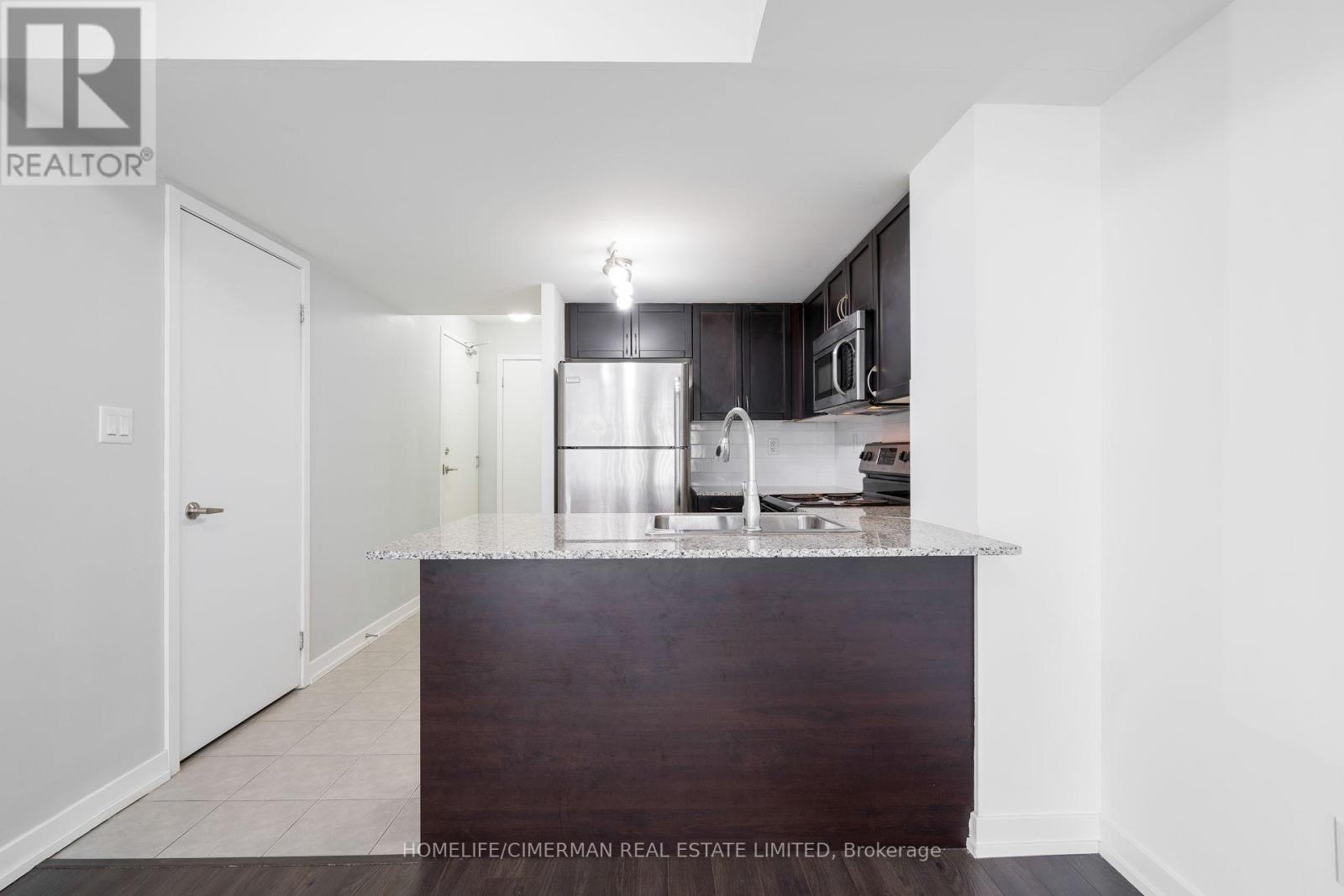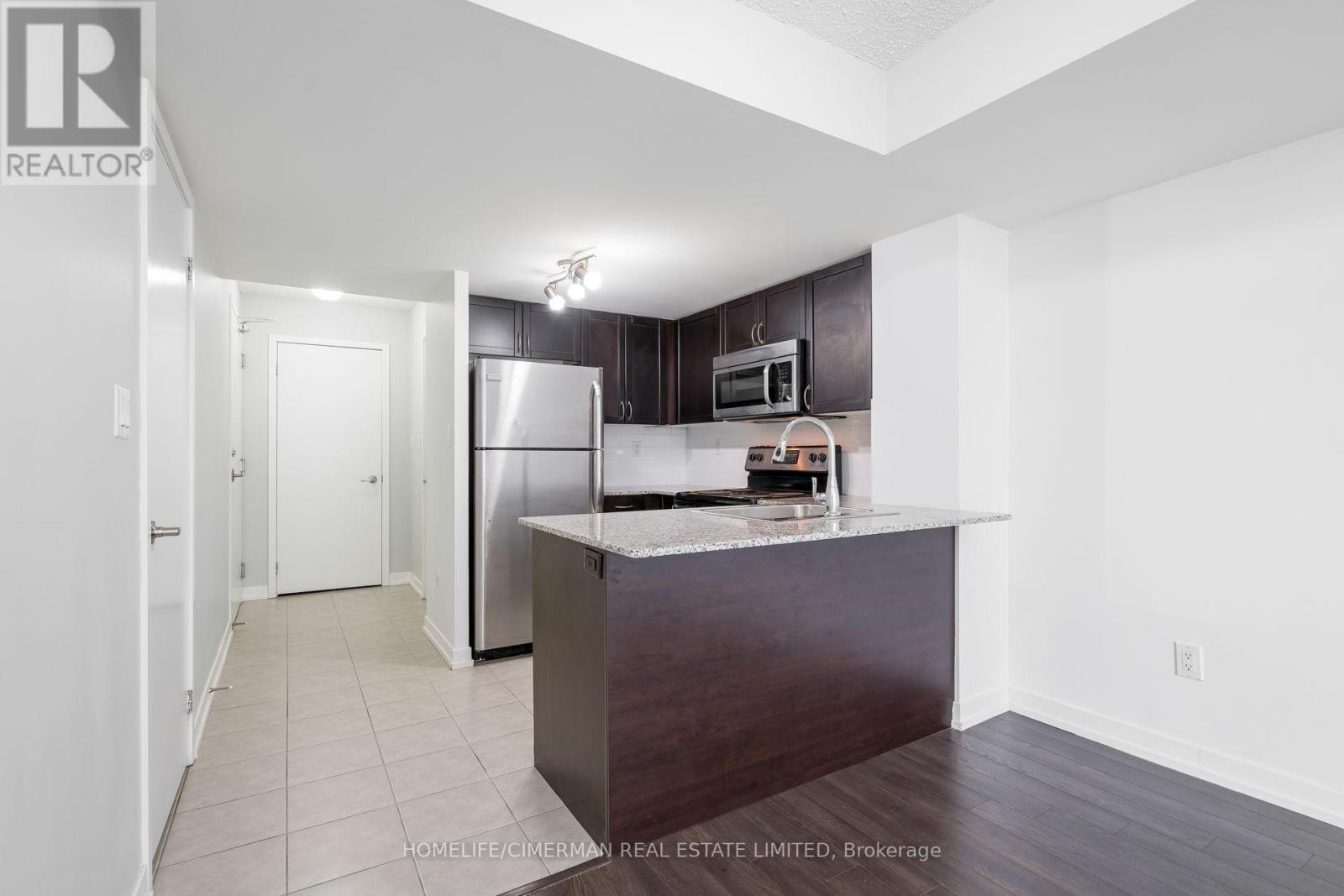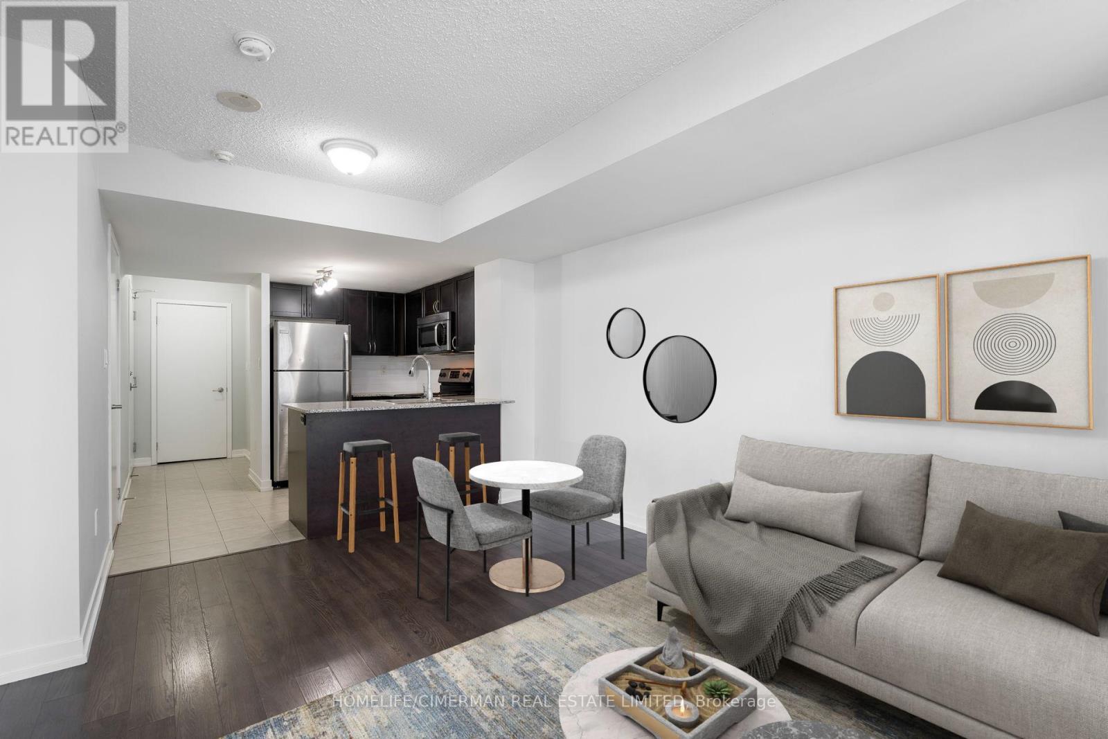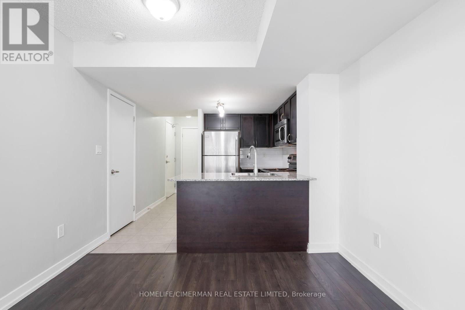 Welcome to Upside Down Condos! Beautiful and spacious one bedroom condo located in a very well-maintained boutique-style condominium near the Junction Triangle. Offering a modern open-concept layout Living/Dining with w/o to large balcony. Modern kitchen with granite countertops, breakfast bar, shaker-style cabinetry, subway tile backsplash and large single sink. The generously sized bedroom includes a double closet with shelving and a large window providing plenty of natural light. Additional storage space available at front foyer entrance. This affordable & charming unit is perfect for first-time buyers offering very low maintenance fees. Located in a vibrant community, including nearby Bloor West Village, The Junction, Geary Strip, High Park, Dufferin Mall, and more! Building amenities include an exercise room, sauna, party and games rooms, yoga studio, bicycle lockers, basketball court, billiards Room, ample underground visitor parking and security guard. Conveniently located close to public transit, groceries/food basics, Shoppers, schools, parks, and restaurants. The building is pet-friendly. Your clients will love it! (id:4555)