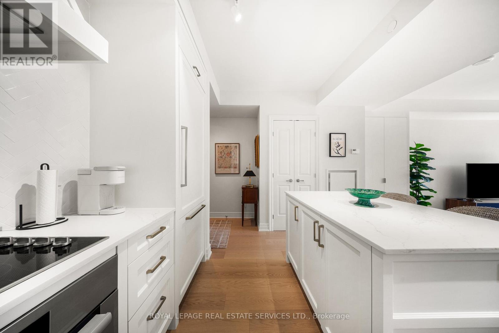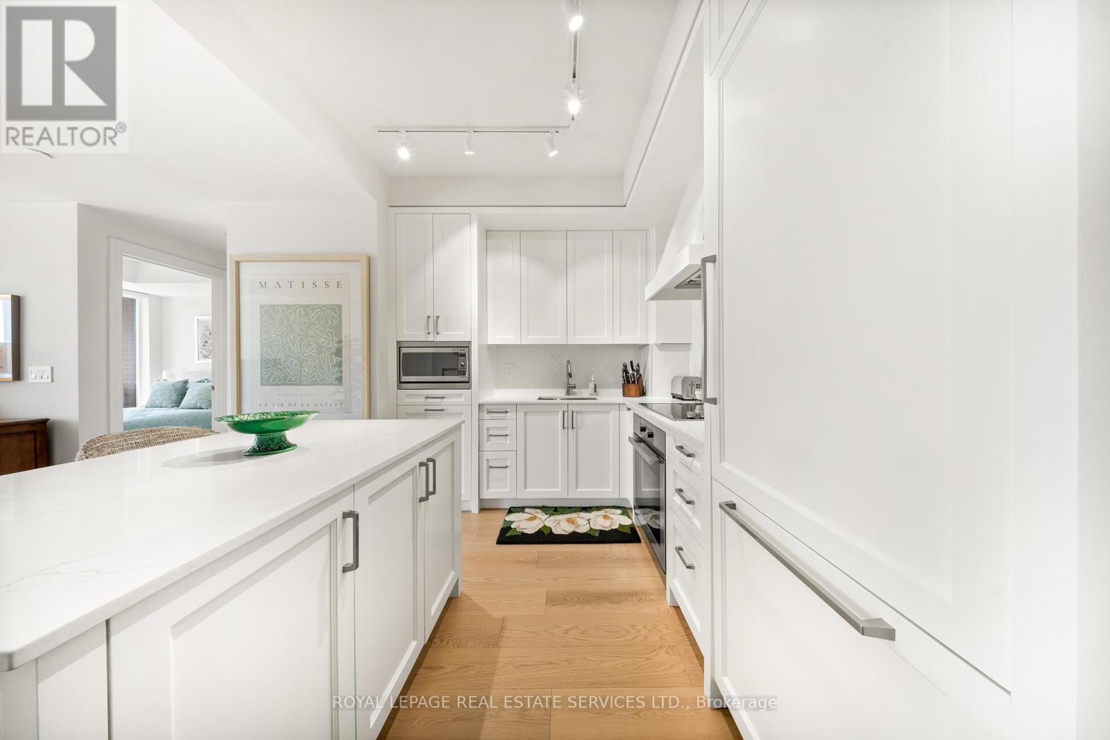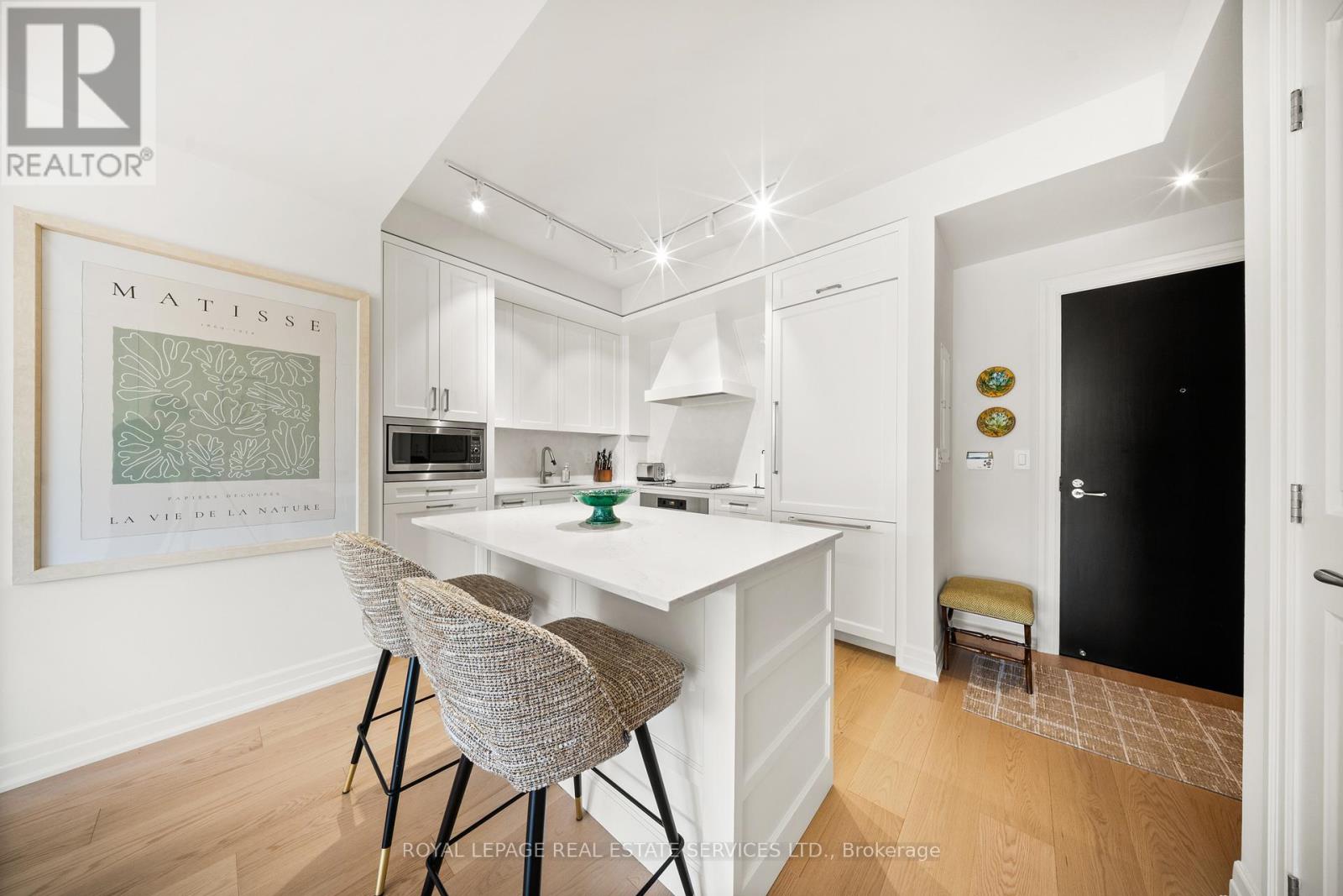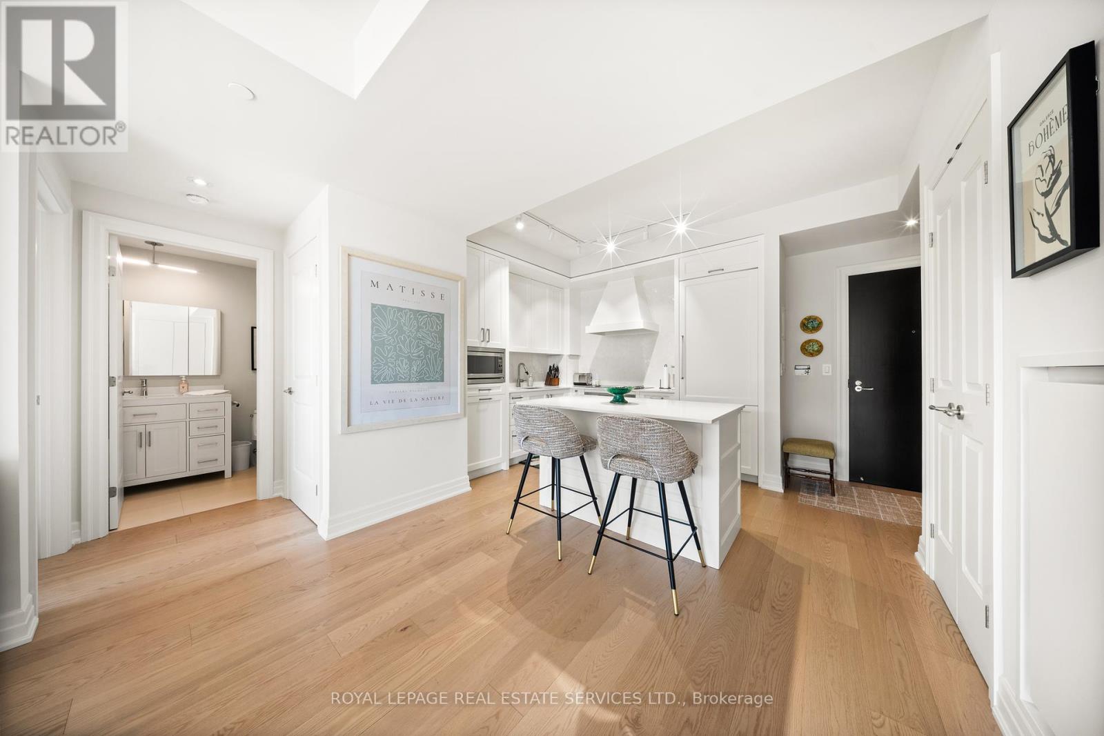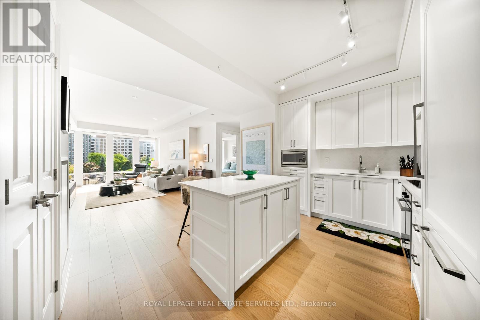 Elegant 1 bedroom, 1 bathroom suite at the prestigious Riverhouse Condominium at the Old Mill, featuring floor to ceiling windows that invite an abundance of natural light. The interior showcases wide plank engineered white oak flooring, a gorgeous kitchen with quartz countertops and island, herringbone tile backsplash, and contemporary track lighting. The bathroom is finished with a sleek new vanity, glass-enclosed shower, tile flooring, and upgraded lighting. Additional enhancements include thoughtfully selected new lighting fixtures throughout and parquet style wooden floor on private balcony. Located just steps from the Old Mill Subway Station and Humber River, this building offers 24-hour concierge service, an indoor pool, hot tub, and party room. Enjoy a tranquil setting within walking distance to parks, the TTC, and the shops and restaurants of Bloor Street West. extras all installed in last year *** Proverco engineered hardwood wide plank floor, parquet flooring on patio. Vanity in bathroom and glass for shower, bathroom floor, recessed medicine cabinet in bathroom, lighting and faucet in bathroom. herringbone tile backsplash in kitchen and quartz counter / island, sink and faucet in kitchen, rrack lighting in kitchen. All lighting recently replaced. Brushed nickel door handles. Custom built in closet (id:4555)