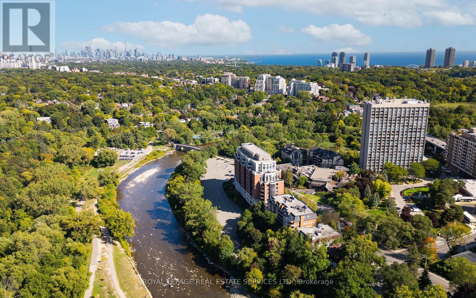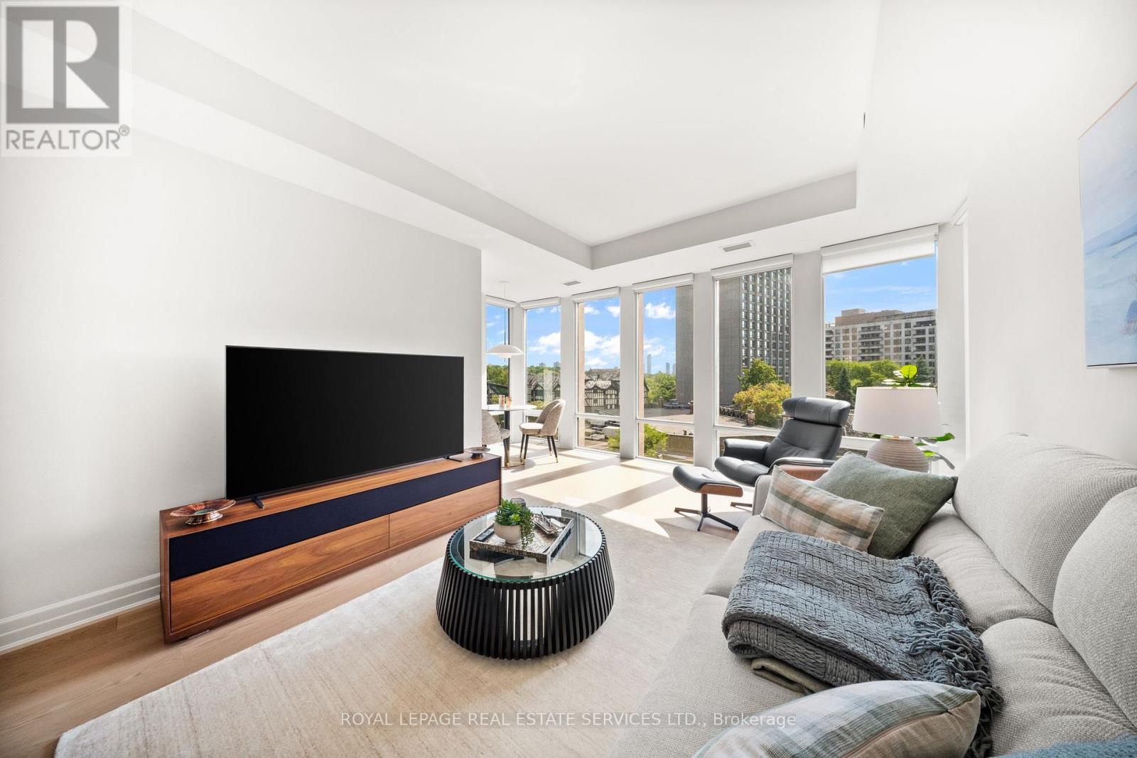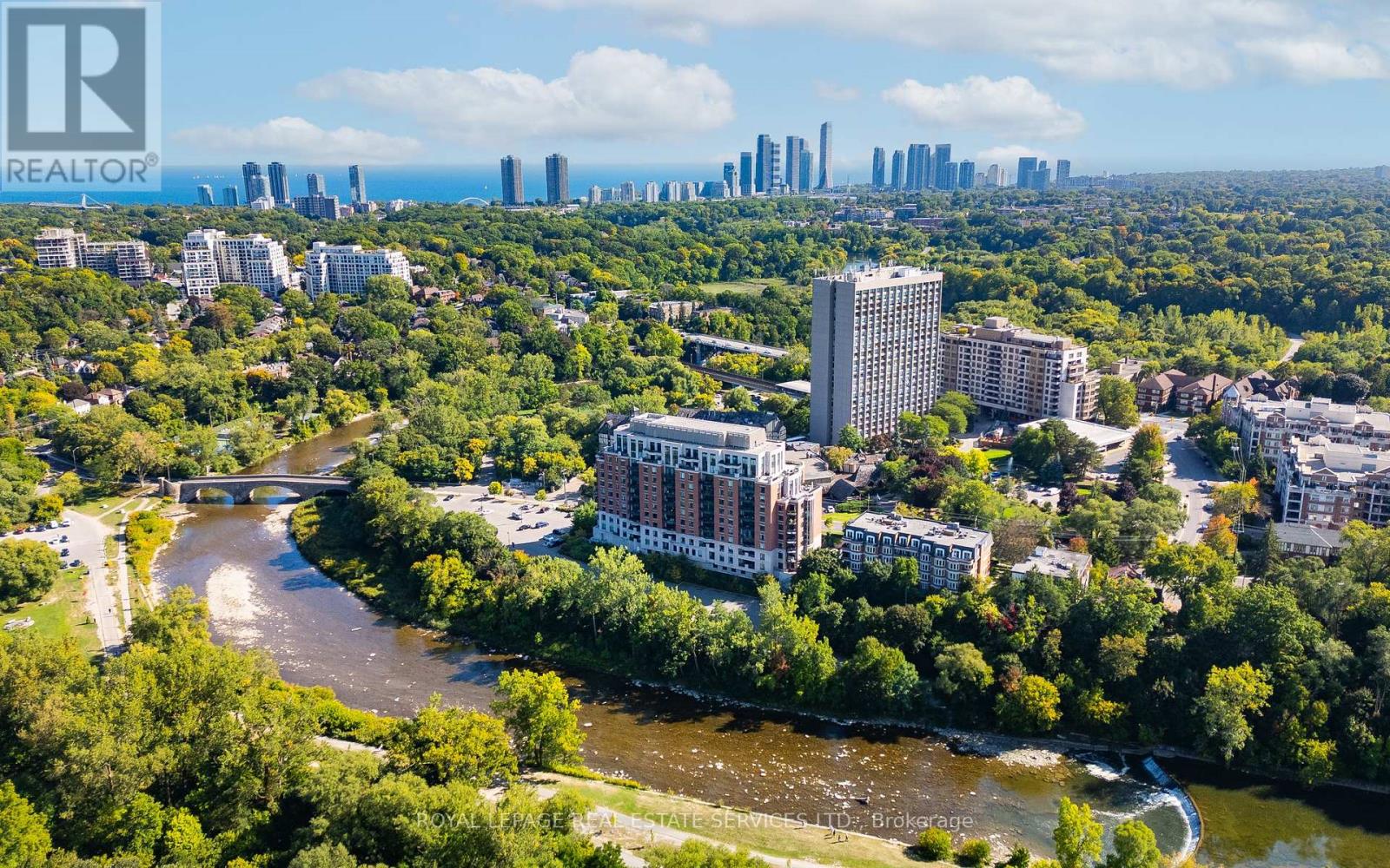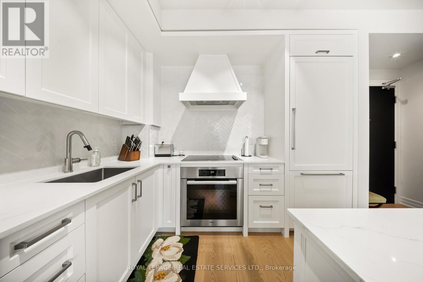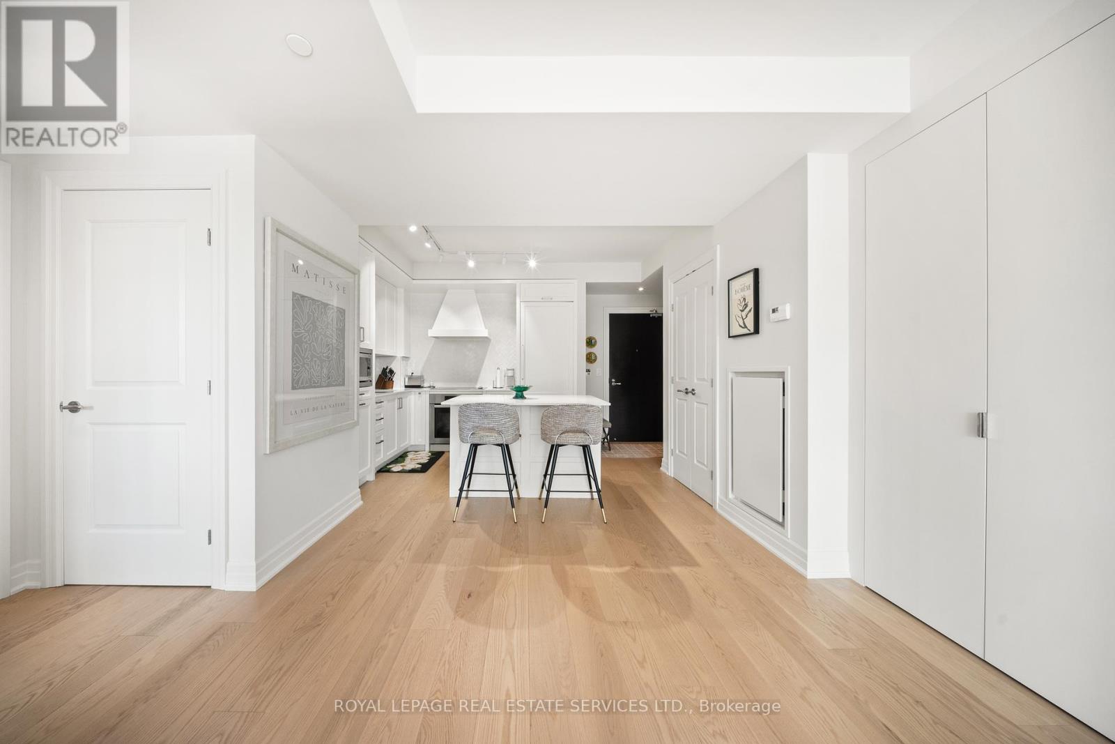 Elegant 1 bedroom, 1 bathroom suite at the prestigious Riverhouse Condominium at the Old Mill, featuring floor to ceiling windows that invite an abundance of natural light. The interior showcases wide plank engineered white oak flooring, a gorgeous kitchen with quartz countertops and island, herringbone tile backsplash, and contemporary track lighting. The bathroom is finished with a sleek new vanity, glass-enclosed shower, tile flooring, and upgraded lighting. Additional enhancements include thoughtfully selected new lighting fixtures throughout and parquet style wooden floor on private balcony. Located just steps from the Old Mill Subway Station and Humber River, this building offers 24-hour concierge service, an indoor pool, hot tub, and party room. Enjoy a tranquil setting within walking distance to parks, the TTC, and the shops and restaurants of Bloor Street West. extras all installed in last year *** Proverco engineered hardwood wide plank floor, parquet flooring on patio. Vanity in bathroom and glass for shower, bathroom floor, recessed medicine cabinet in bathroom, lighting and faucet in bathroom. herringbone tile backsplash in kitchen and quartz counter / island, sink and faucet in kitchen, rrack lighting in kitchen. All lighting recently replaced. Brushed nickel door handles. Custom built in closet (id:4555)