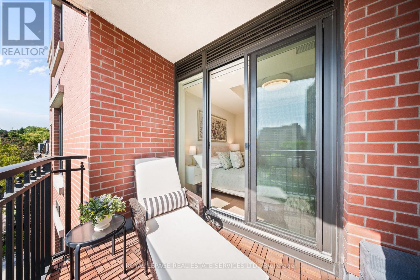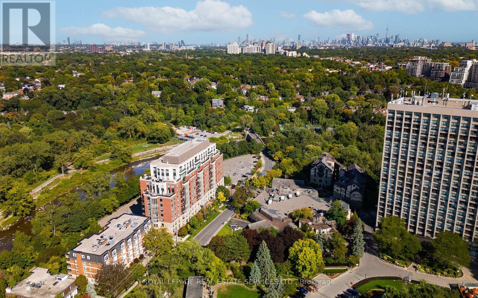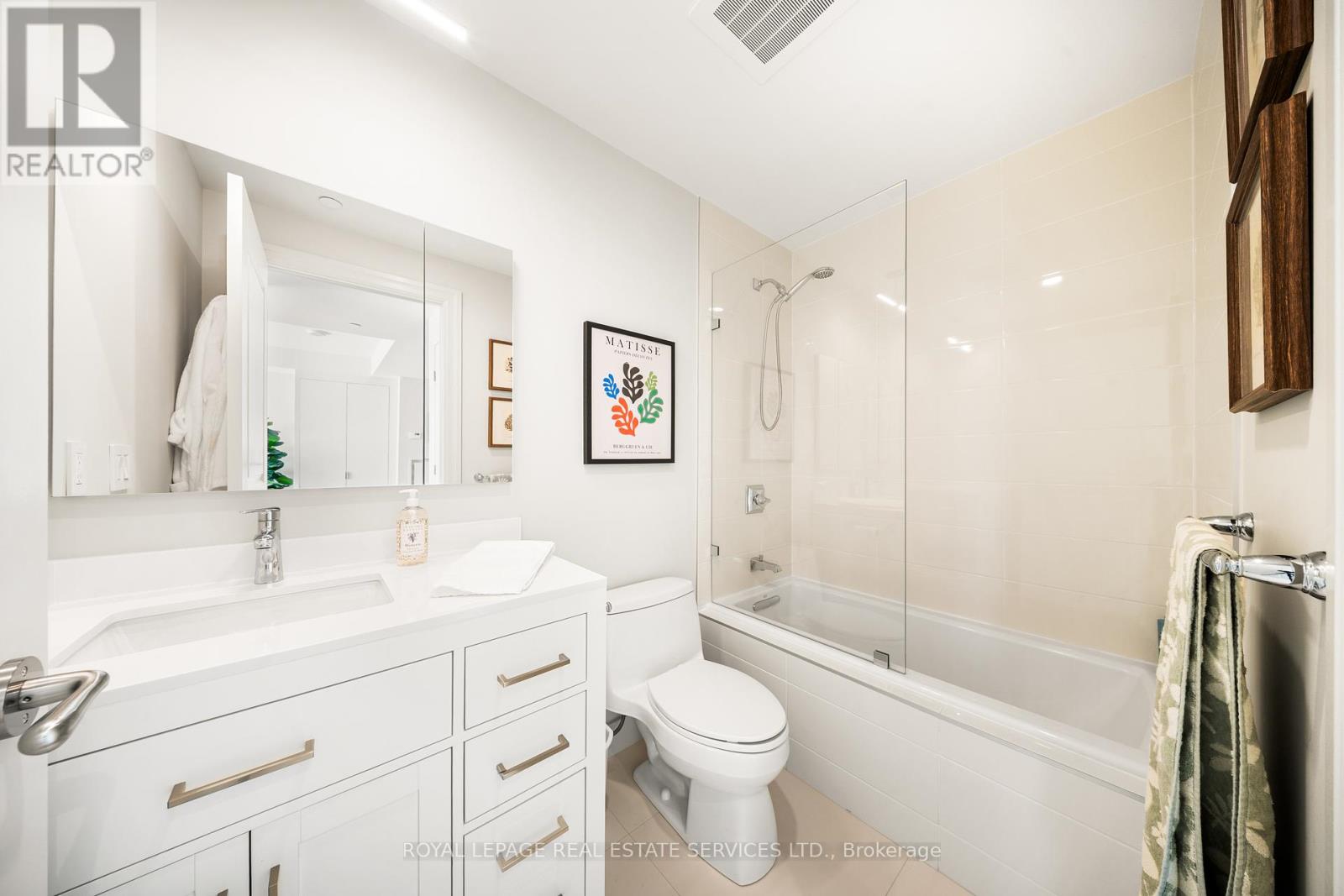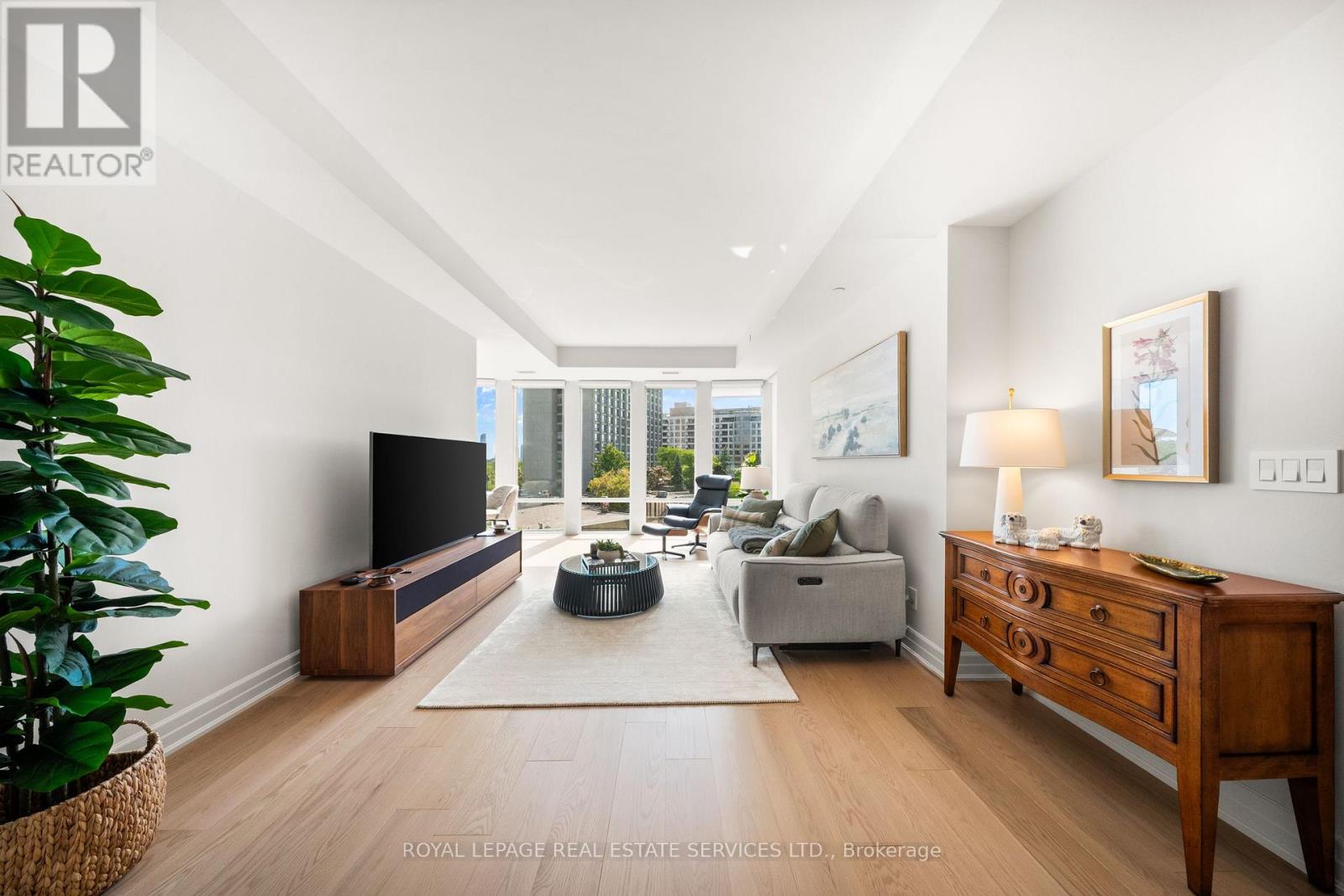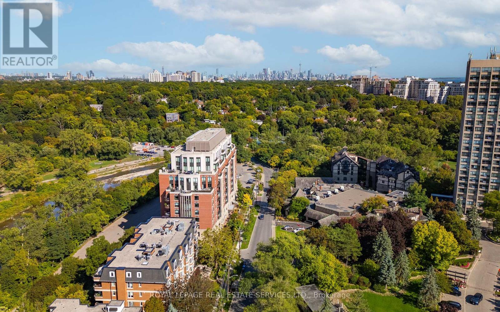 Elegant 1 bedroom, 1 bathroom suite at the prestigious Riverhouse Condominium at the Old Mill, featuring floor to ceiling windows that invite an abundance of natural light. The interior showcases wide plank engineered white oak flooring, a gorgeous kitchen with quartz countertops and island, herringbone tile backsplash, and contemporary track lighting. The bathroom is finished with a sleek new vanity, glass-enclosed shower, tile flooring, and upgraded lighting. Additional enhancements include thoughtfully selected new lighting fixtures throughout and parquet style wooden floor on private balcony. Located just steps from the Old Mill Subway Station and Humber River, this building offers 24-hour concierge service, an indoor pool, hot tub, and party room. Enjoy a tranquil setting within walking distance to parks, the TTC, and the shops and restaurants of Bloor Street West. extras all installed in last year *** Proverco engineered hardwood wide plank floor, parquet flooring on patio. Vanity in bathroom and glass for shower, bathroom floor, recessed medicine cabinet in bathroom, lighting and faucet in bathroom. herringbone tile backsplash in kitchen and quartz counter / island, sink and faucet in kitchen, rrack lighting in kitchen. All lighting recently replaced. Brushed nickel door handles. Custom built in closet (id:4555)