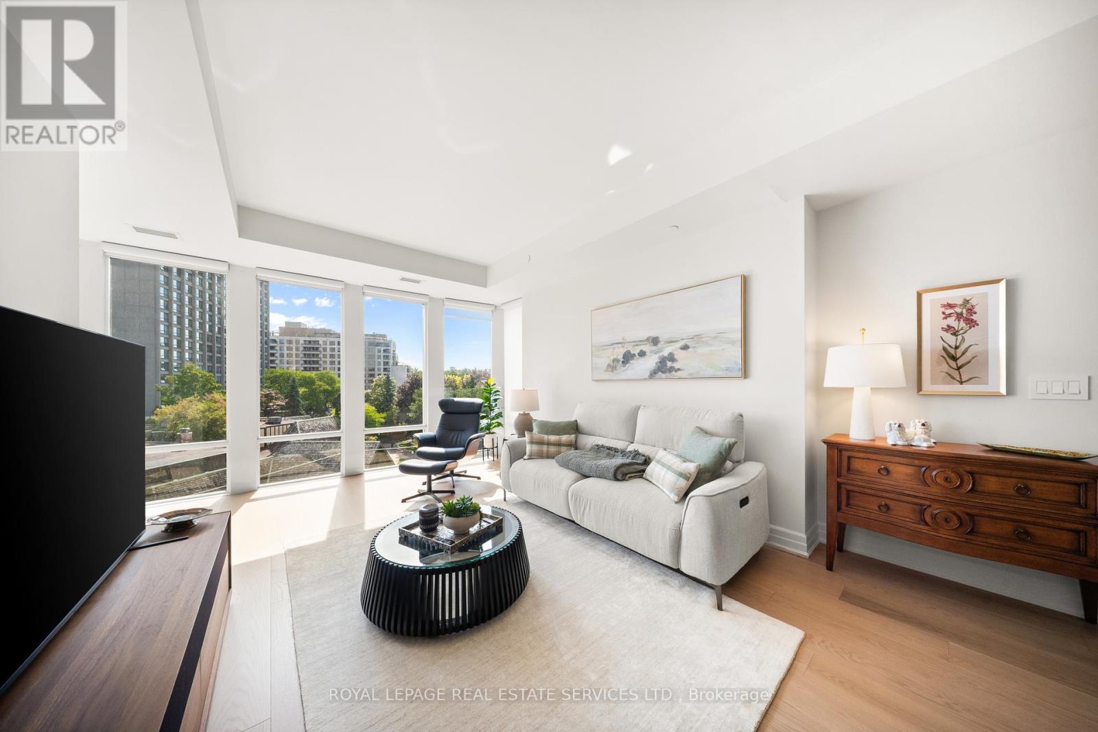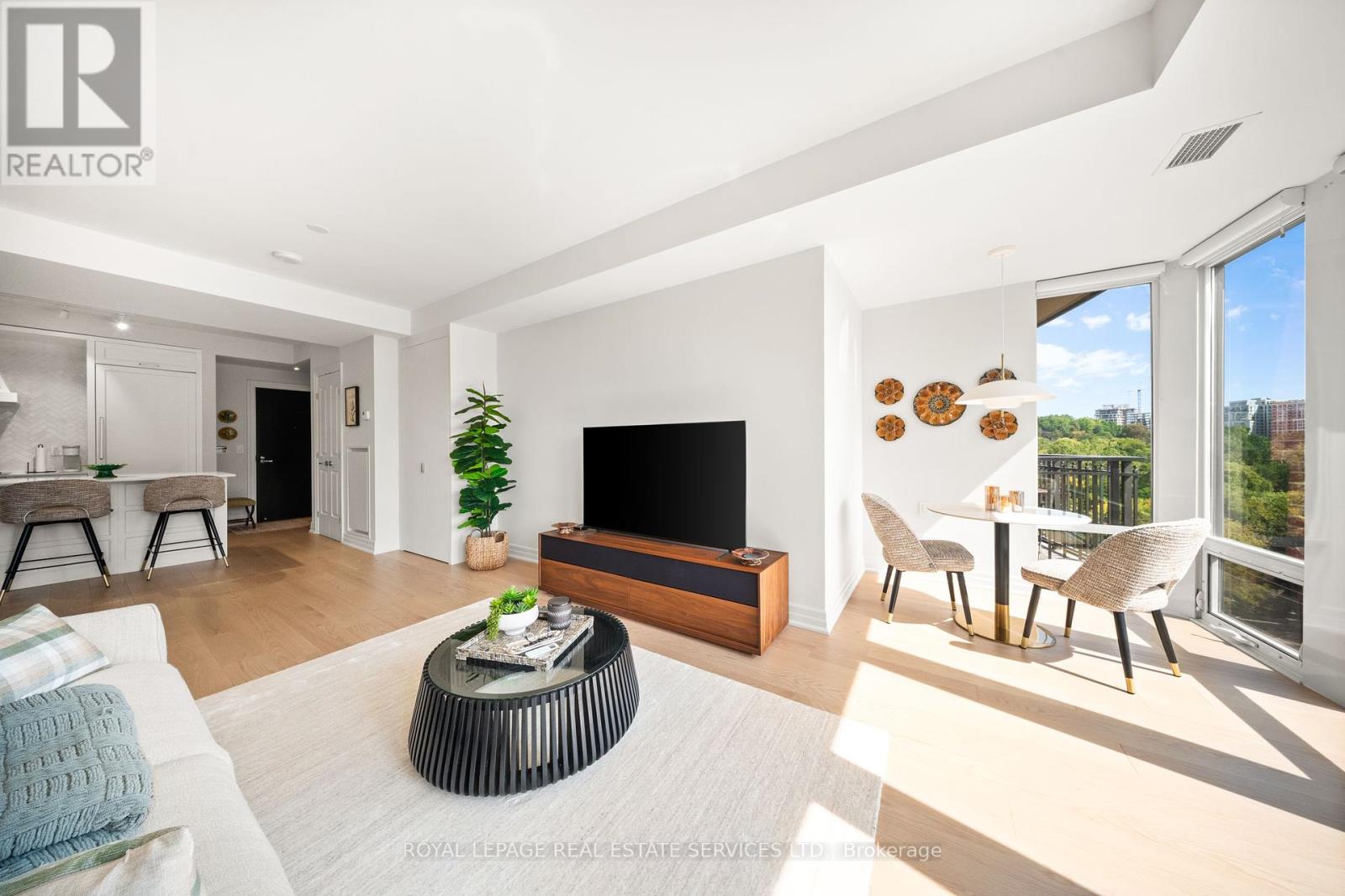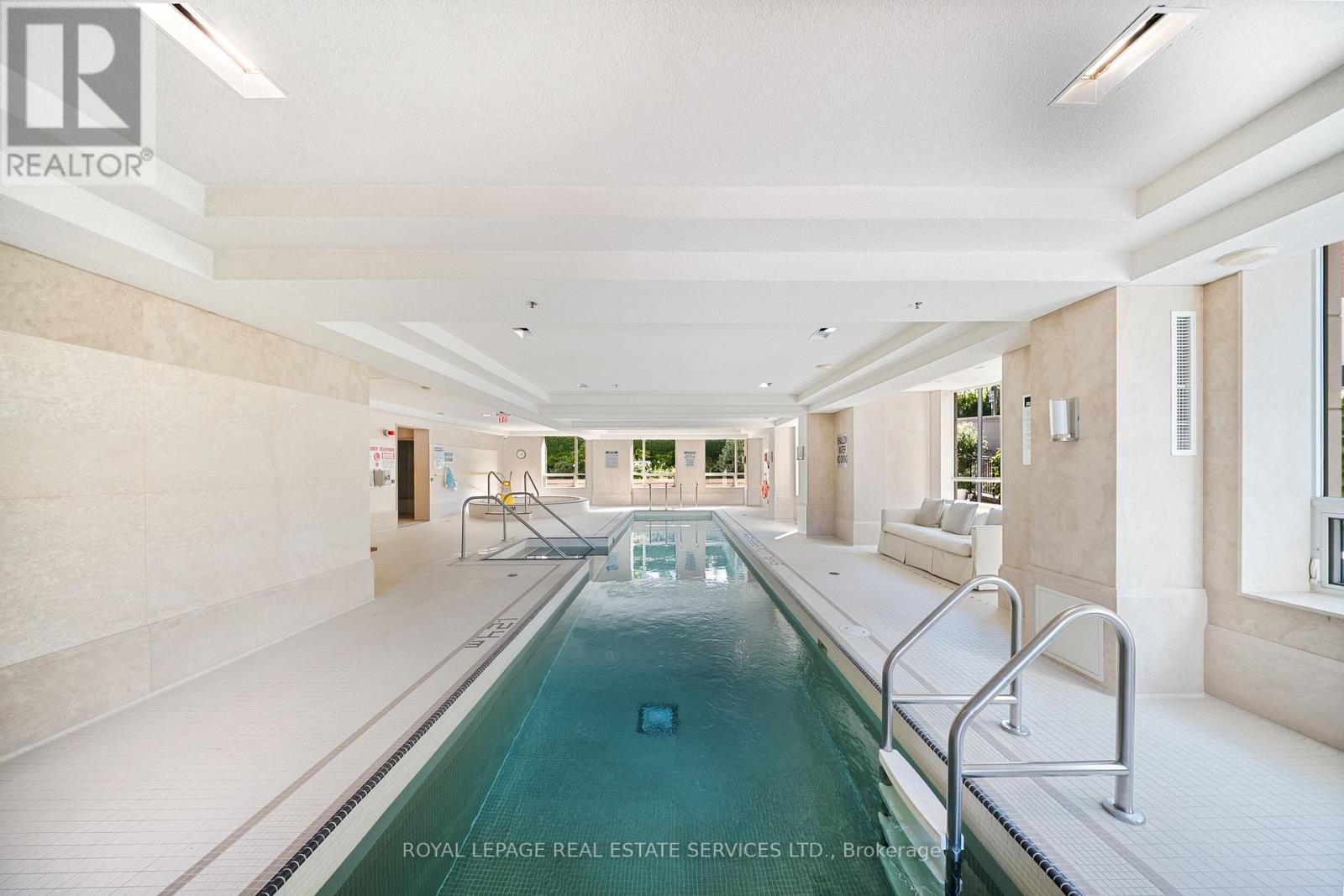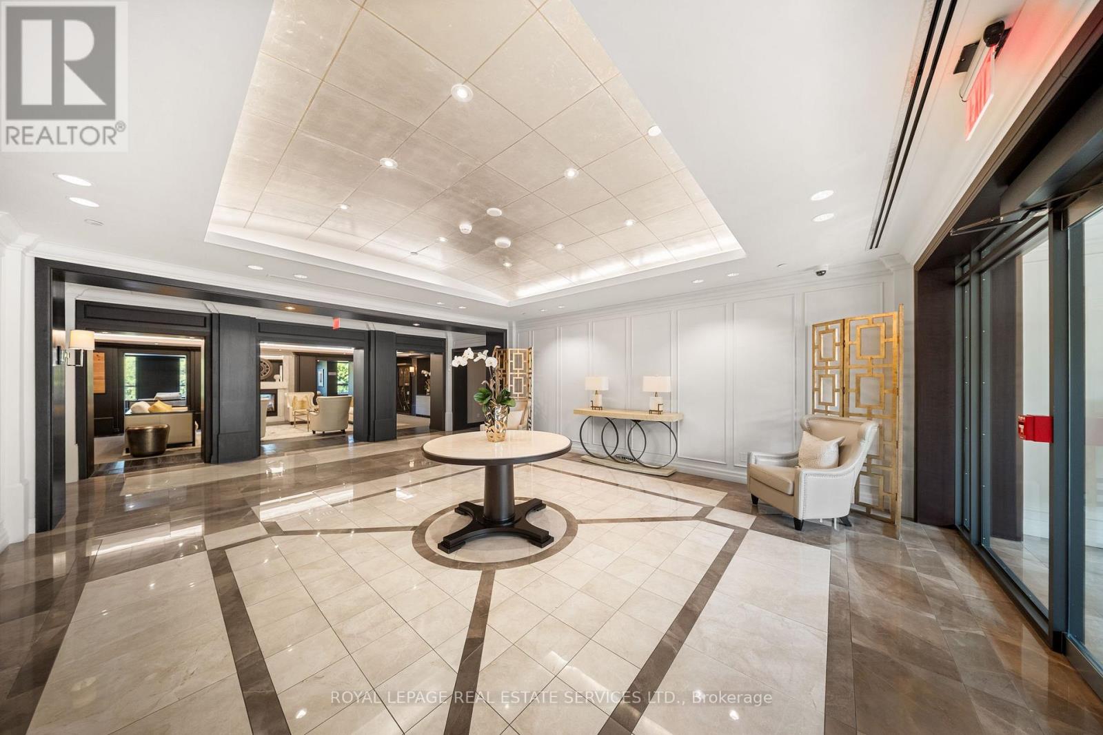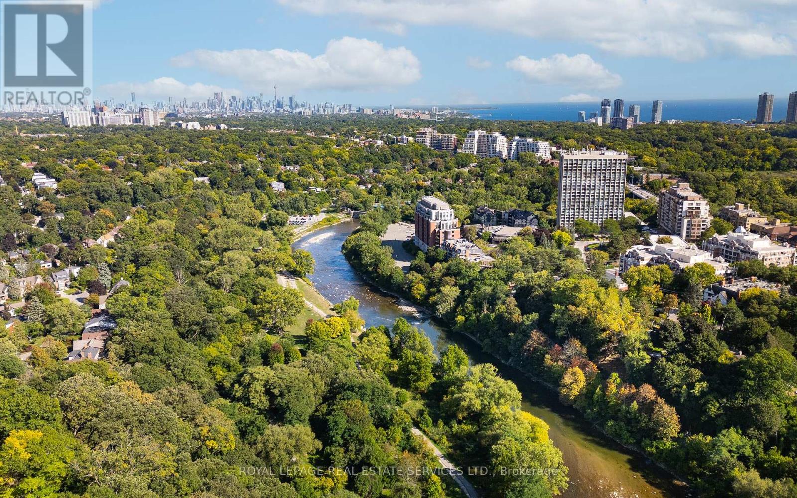 Elegant 1 bedroom, 1 bathroom suite at the prestigious Riverhouse Condominium at the Old Mill, featuring floor to ceiling windows that invite an abundance of natural light. The interior showcases wide plank engineered white oak flooring, a gorgeous kitchen with quartz countertops and island, herringbone tile backsplash, and contemporary track lighting. The bathroom is finished with a sleek new vanity, glass-enclosed shower, tile flooring, and upgraded lighting. Additional enhancements include thoughtfully selected new lighting fixtures throughout and parquet style wooden floor on private balcony. Located just steps from the Old Mill Subway Station and Humber River, this building offers 24-hour concierge service, an indoor pool, hot tub, and party room. Enjoy a tranquil setting within walking distance to parks, the TTC, and the shops and restaurants of Bloor Street West. extras all installed in last year *** Proverco engineered hardwood wide plank floor, parquet flooring on patio. Vanity in bathroom and glass for shower, bathroom floor, recessed medicine cabinet in bathroom, lighting and faucet in bathroom. herringbone tile backsplash in kitchen and quartz counter / island, sink and faucet in kitchen, rrack lighting in kitchen. All lighting recently replaced. Brushed nickel door handles. Custom built in closet (id:4555)